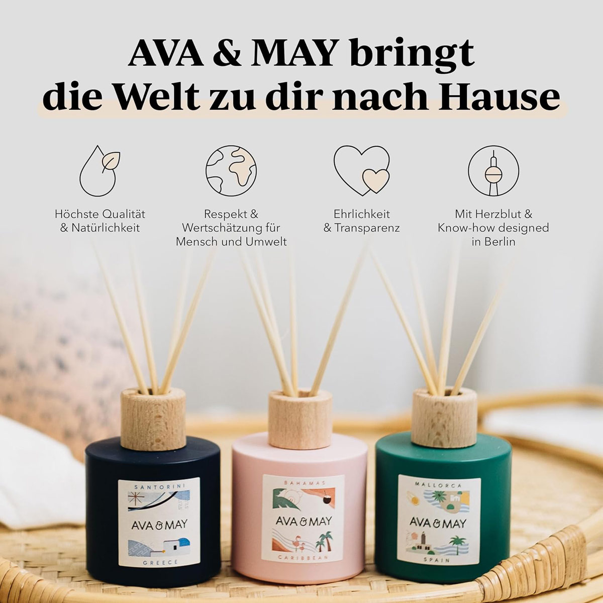 Alles begann mit einer Weltreise… und dem Wunsch, all die besonderen Eindrücke und Erinnerungen mit nach Hause zu nehmen. So entstand die Idee zu AVA & MAY und führte zur Gründung unserer ersten Home & Living Marke im Jahr 2018. Doch das war erst der Anfang unserer Reise. Aufgrund des überwältigenden Feedbacks unserer Community und dem Wunsch, ihre Lieblingsdüfte auch auf der Haut zu tragen, haben wir 2021 unsere zweite Brand FAYNT ins Leben gerufen, die Parfums für jede Situation kreiert.