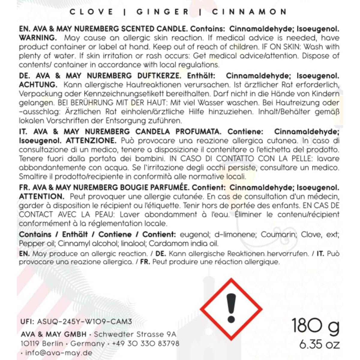 Mit einem dampfenden Glühwein in der Hand über den berühmten Christkindlmarkt in Nürnberg schlendern, die festlich geschmückten Gassen entdecken und an kleinen Holzhütten süße Leckereien genießen – unsere 180g Duftkerze Nürnberg bringt genau dieses Gefühl in dein Zuhause. Der Duft von würzigem Ingwer, feinem Zimt und Nelke erinnert an frisch gebackene Lebkuchen und erfüllt den Raum mit wohliger Wärme. Ein festlicher Klassiker, von unserer Community geliebt, jetzt endlich in der großen Variante – perfekt für lange Abende bei Kerzenschein und Plätzchenduft.