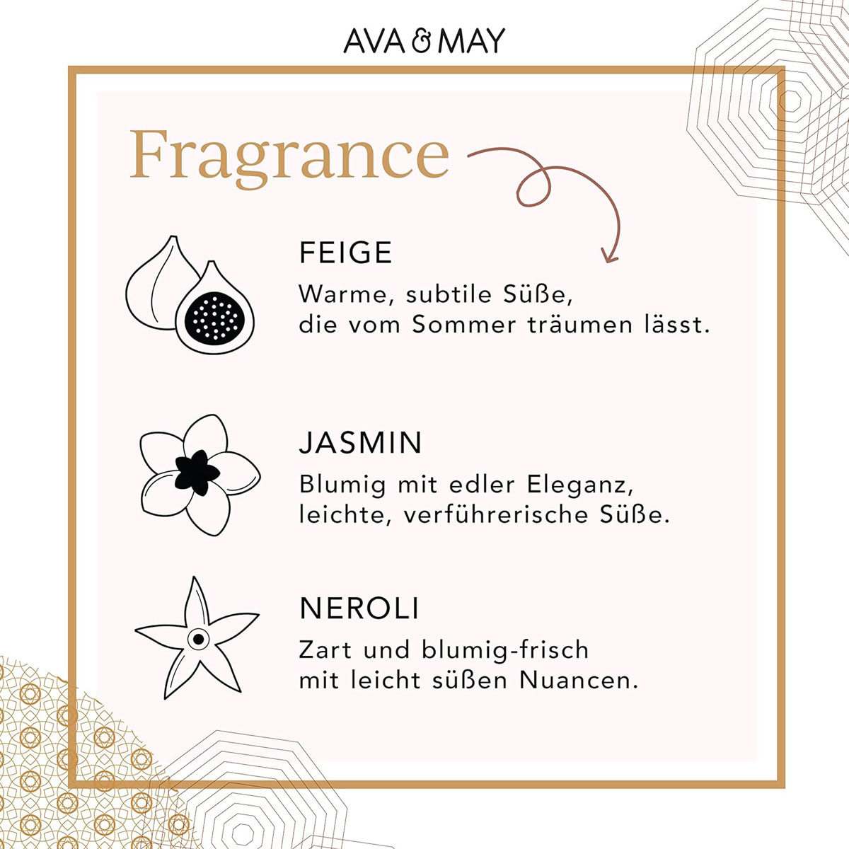 Alles begann mit einer Weltreise… und dem Wunsch, all die besonderen Eindrücke und Erinnerungen mit nach Hause zu nehmen. So entstand die Idee zu AVA & MAY und führte zur Gründung unserer ersten Home & Living Marke im Jahr 2018. Doch das war erst der Anfang unserer Reise. Aufgrund des überwältigenden Feedbacks unserer Community und dem Wunsch, ihre Lieblingsdüfte auch auf der Haut zu tragen, haben wir 2021 unsere zweite Brand FAYNT ins Leben gerufen, die Parfums für jede Situation kreiert.