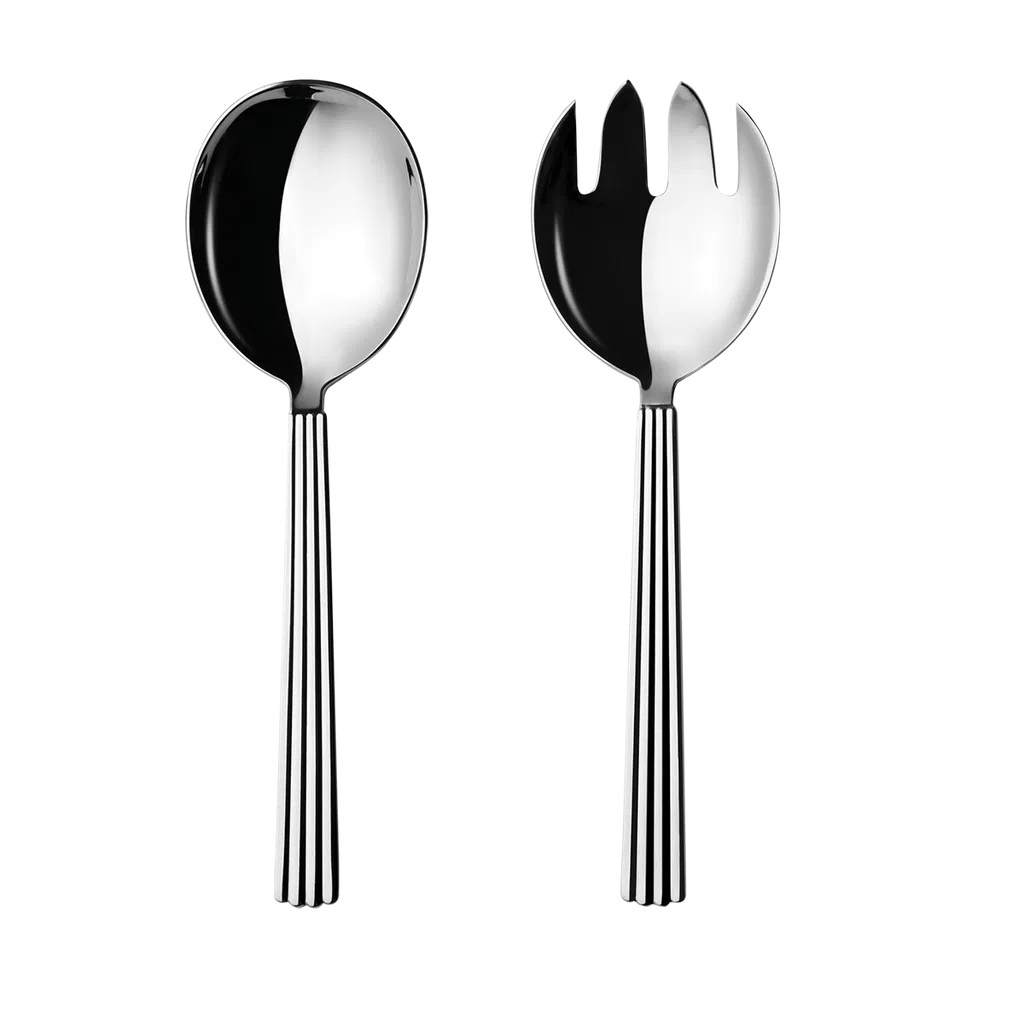 Der schwedische Prinz Sigvard Bernadotte war einer der ersten Design-Partner von Georg Jensen. Als wahrer Erneuerer half er dabei, den Stil des Hauses Georg Jensen von seinen Jugendstilwurzeln hin zu einer schlankeren und funktionalistischeren Ästhetik zu entwickeln.Das Set besteht aus einem Vorlegelöffel und einer Vorlegegabel. Es ist aus Edelstahl mit hochglanzpoliertem Finish gefertigt und spülmaschinenfest.
