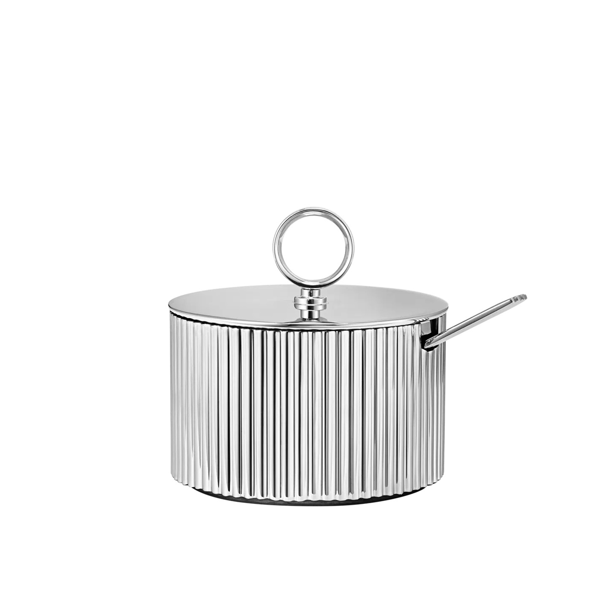 Die BERNADOTTE Zuckerdose wird mit einem Löffel verkauft. Alle Teile sind aus Edelstahl gefertigt.