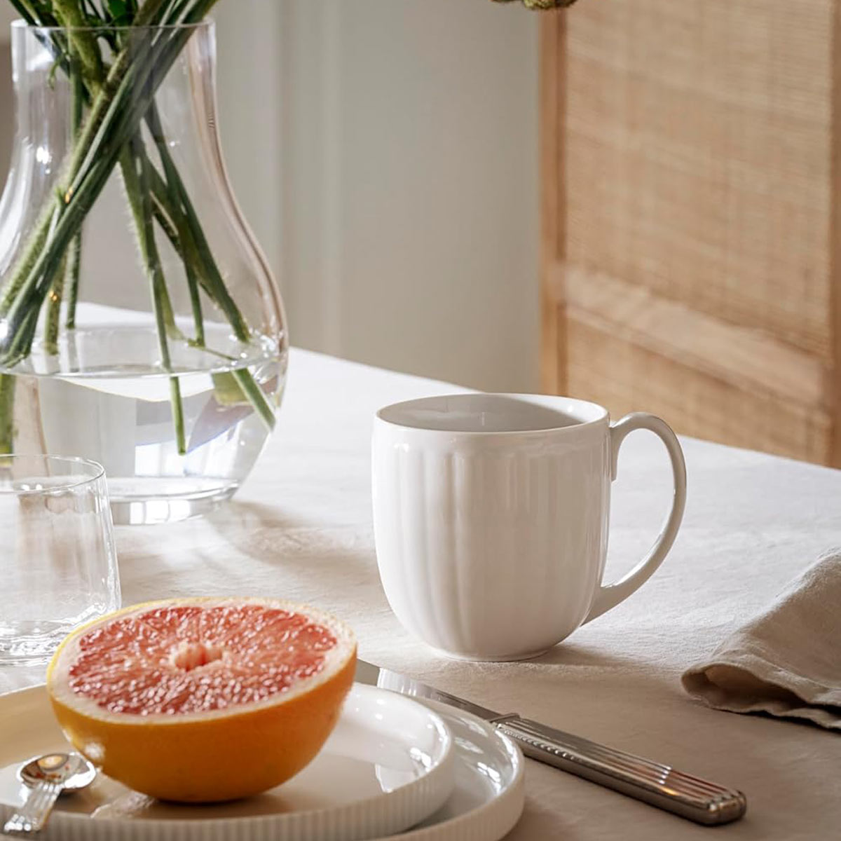 Das geriffelte Design von Sigvard Bernadotte ist die Inspiration für die Schlichtheit dieses alltäglichen Bechers von Georg Jensen. Der geschwungene Henkel liegt perfekt in der Hand und die Details in der Struktur verleihen dem Becher einen faszinierenden Touch. Der Becher ist solide und elegant zugleich und aus glasiertem weißem Porzellan gefertigt. Dieses Set enthält zwei Becher.
