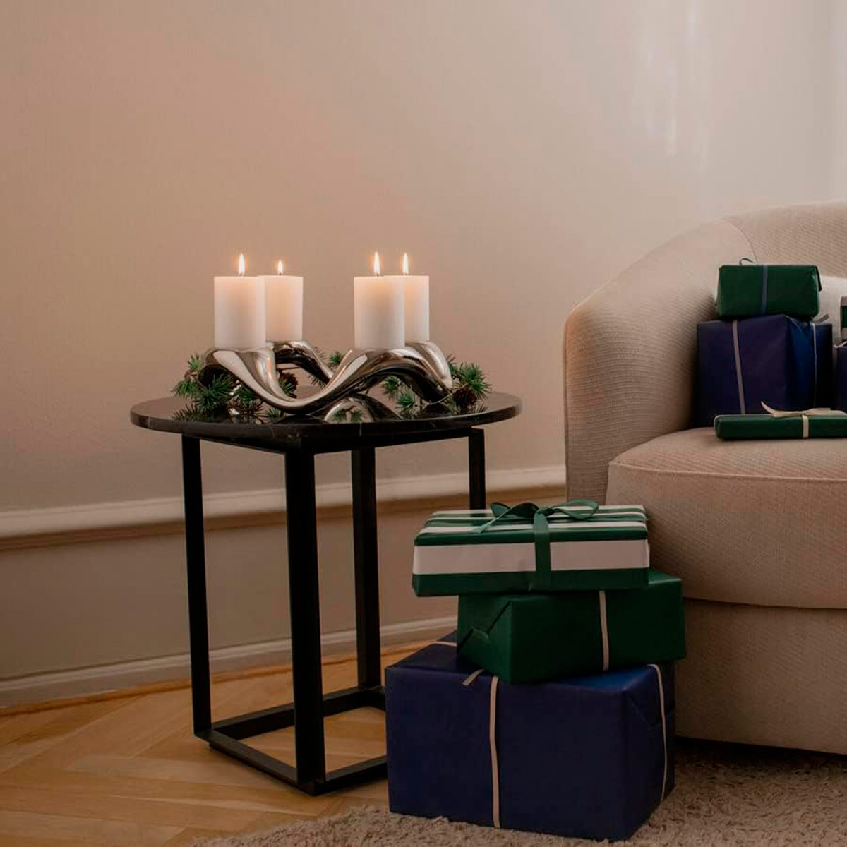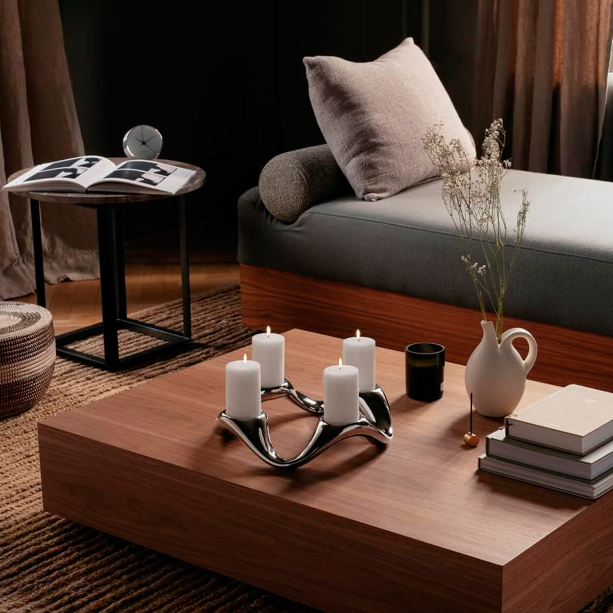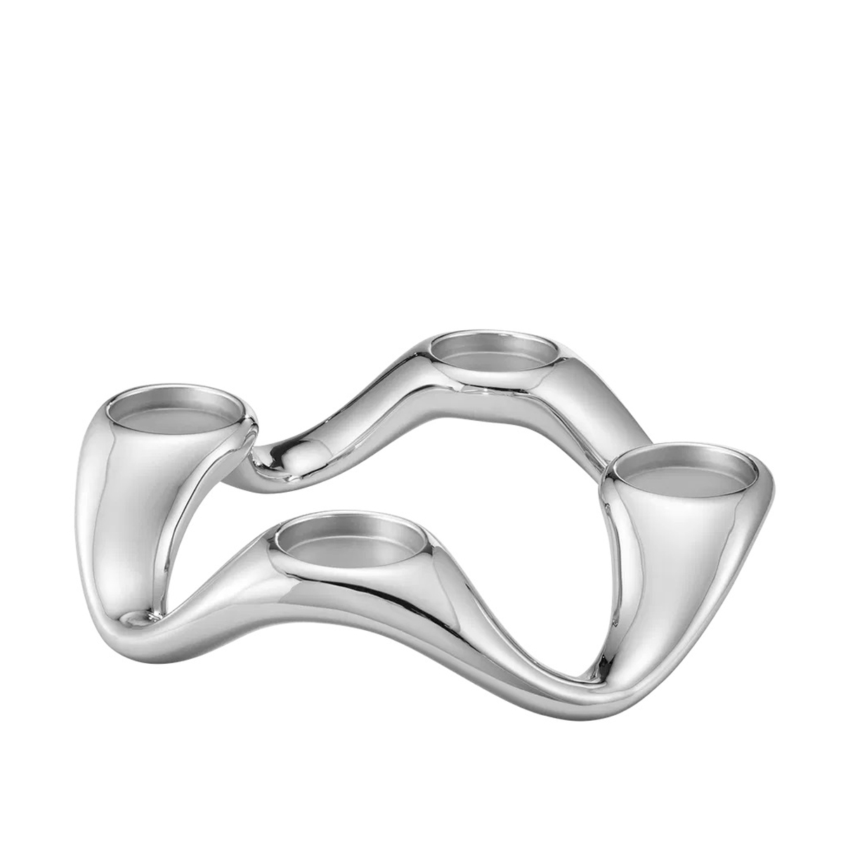 Dieser skulpturale Leuchter aus Edelstahl ist voller fließender Bewegung und ein markanter Tischschmuck, insbesondere wenn das Kerzenlicht auf der sanft gewellten, glänzenden Oberfläche reflektiert wird. Er trägt vier Stumpenkerzen und ist perfekt für die Adventszeit, aber dezent genug für das ganze Jahr.