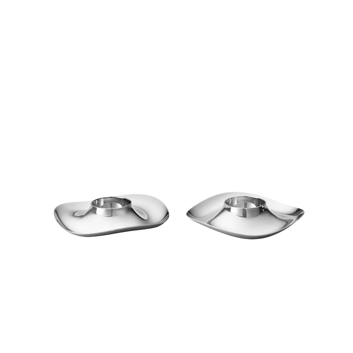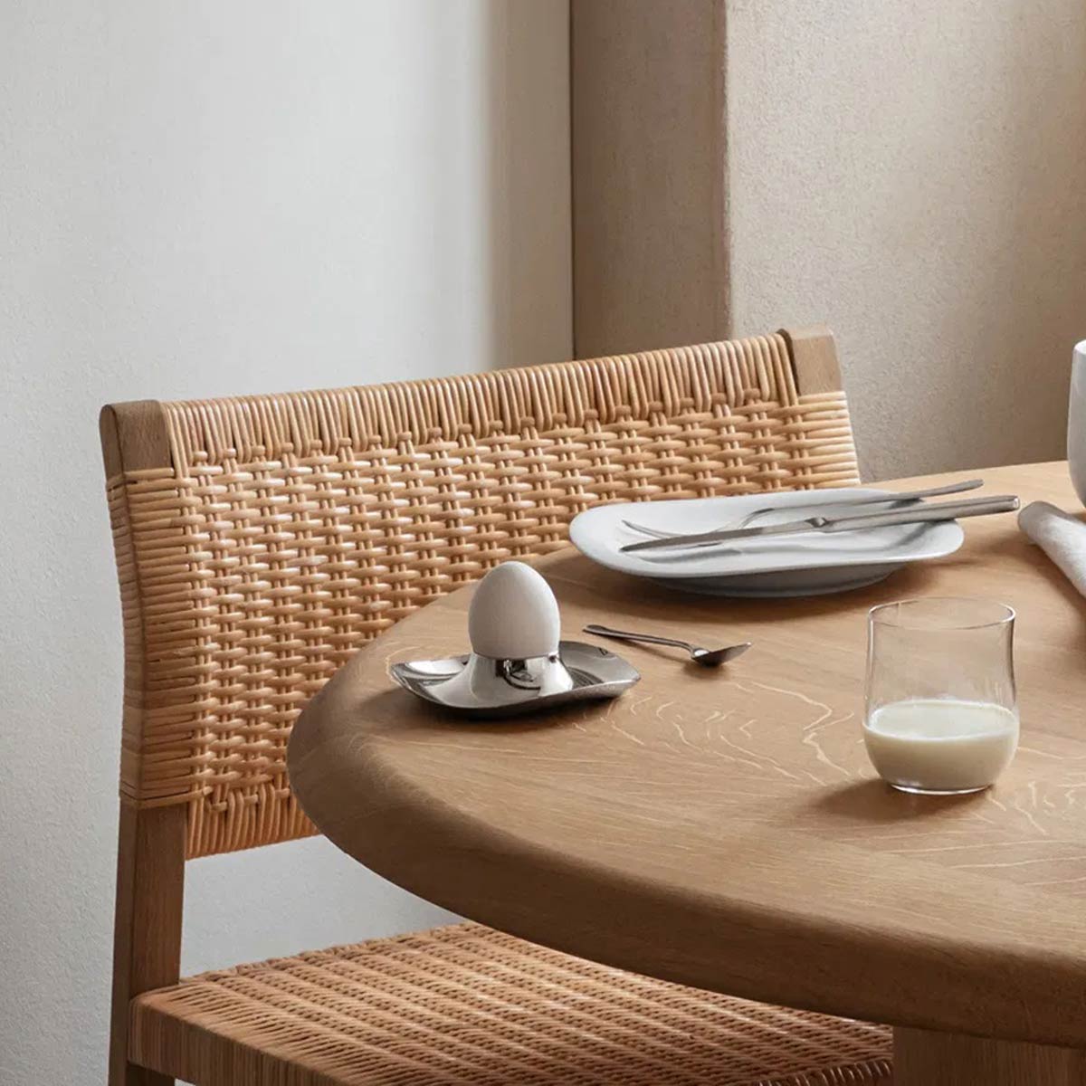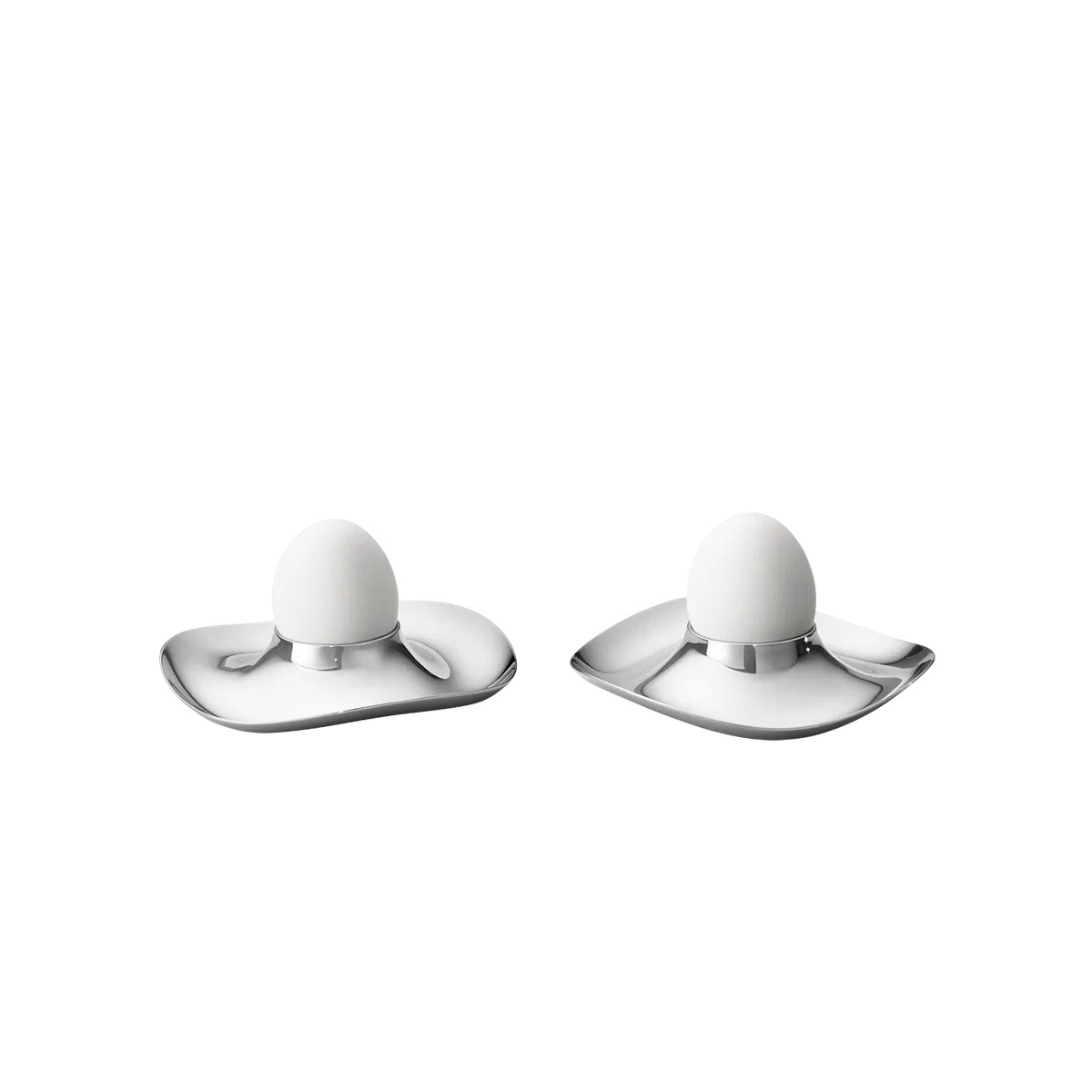 Eine fließende organische Scheibe scheint über dem Tisch zu schweben und in der Mitte aufzusteigen, um einen ungewöhnlichen und modernen Eierbecher zu bilden. Die aus Edelstahl gefertigten Eierbecher sind ebenso praktisch wie schön: der erhöhte Rand erleichtert das Tragen und auf dem breiten Untersetzer können während des Essens Eierschalen aufbewahrt werden.