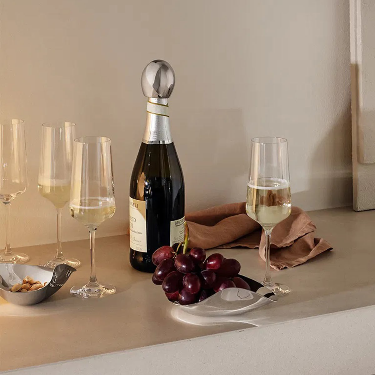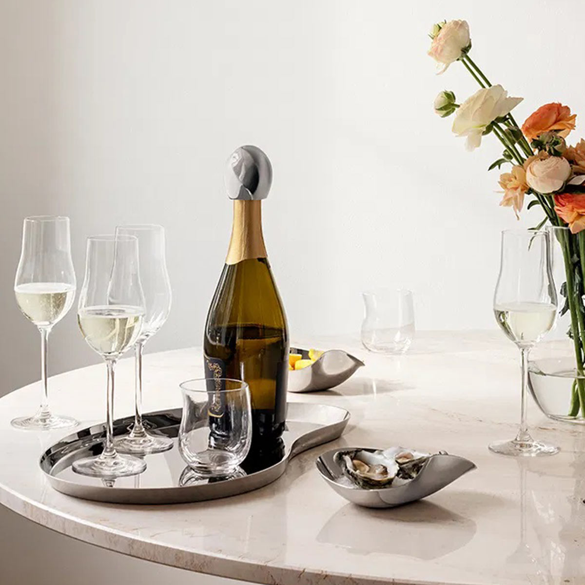 Dieser elegante Champagnerstopfen ist ein wichtiger Bestandteil der Hausbar und hilft, den Schampus frisch zu halten. Der Champagnerstopfen ist ein Design von Helle Damkjær für Georg Jensen und ein neuer Teil der Indulgence Kollektion. Er ist aus Edelstahl und ein ebenso praktisches wie raffiniertes Design für jede Flasche.