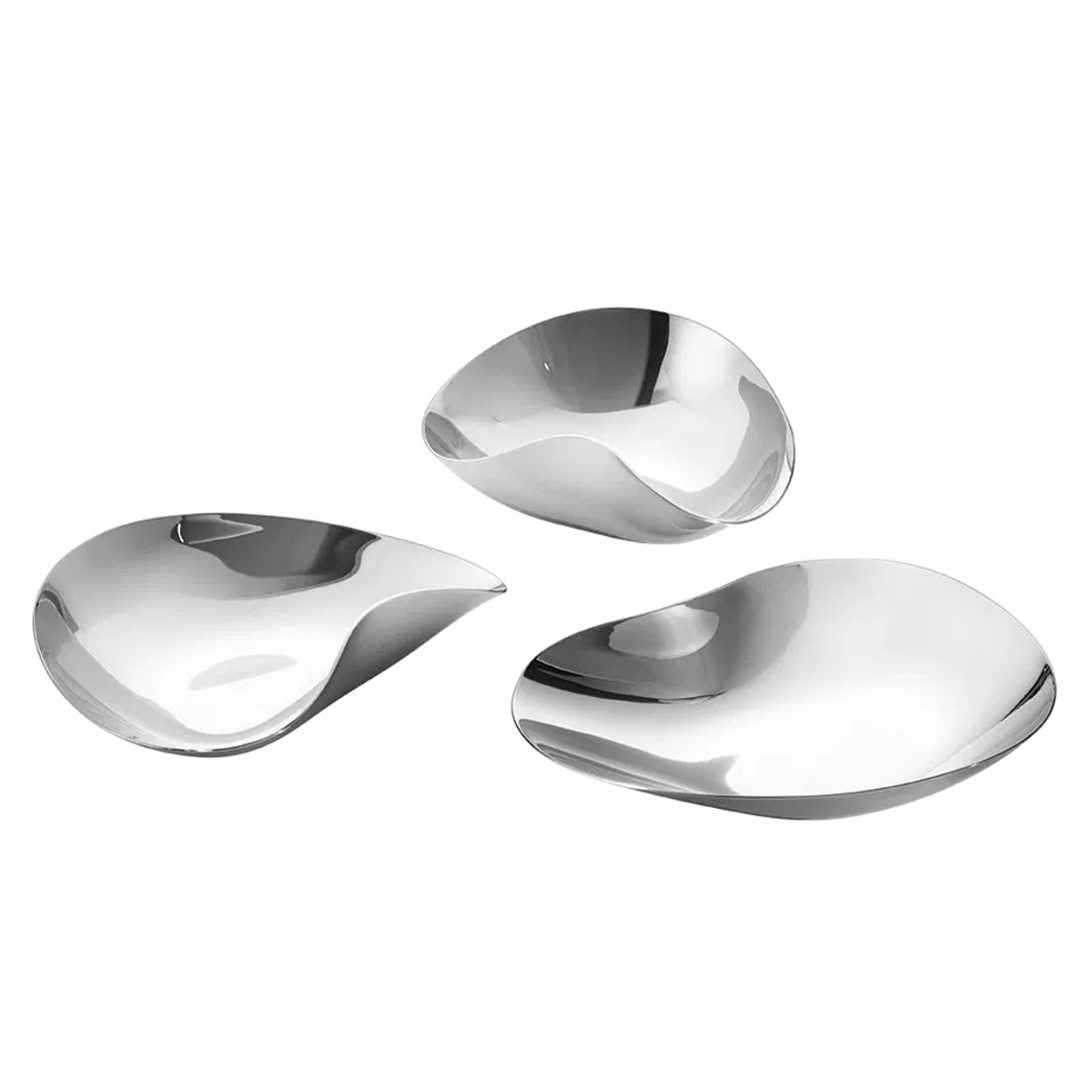 Das Design ist von der Geschichte des skandinavischen Minimalismus inspirieren. Die Schalen begeistern mit ihren welligen Formen. Das Set besteht aus drei unterschiedlichen Varianten. Die Schalen werden aus Edelstahl gefertigt, sowie anschließend spiegelpoliert. Durch die funkelnden Oberfläche kommen die Bewegungen der Formen ideal zur Geltung.