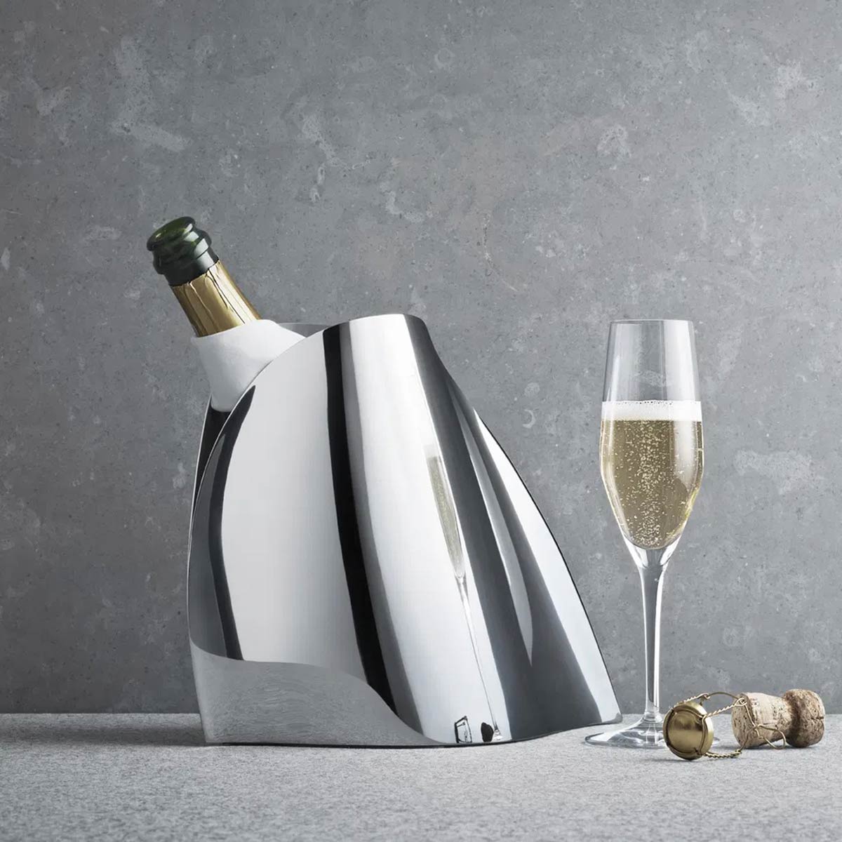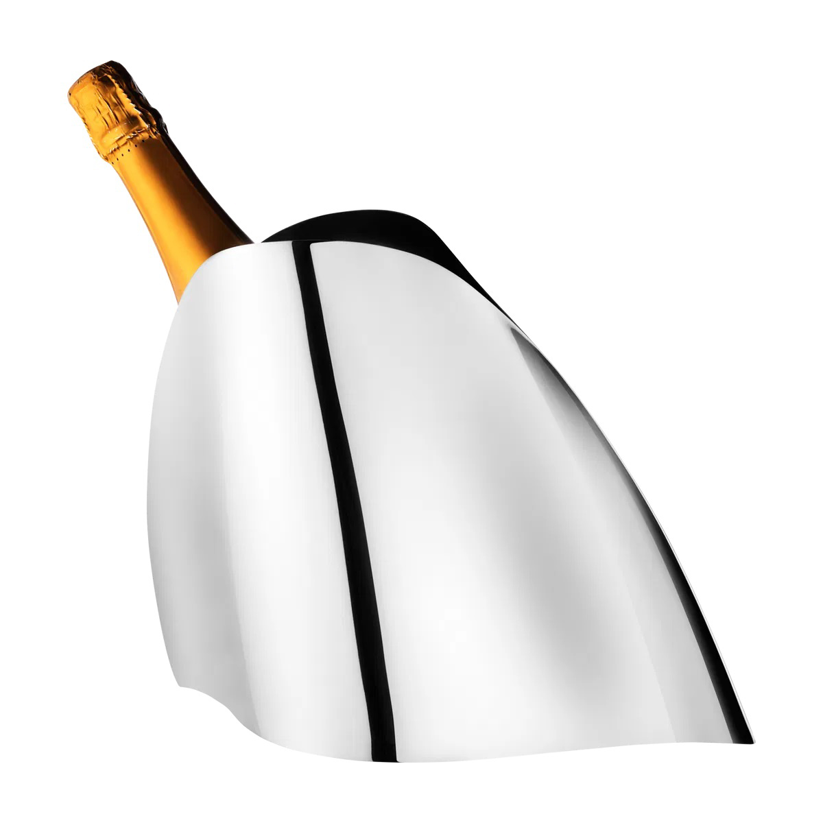Seine ellipsenförmige Öffnung wirkt organisch und die Neigung des Kühlers hält die Flasche im perfekten Winkel, damit Sie die Flasche einfach herausnehmen und wieder hereinstellen können. Der Champagnerkühler ist aus poliertem Edelstahl gefertigt und macht eine hervorragende Figur auf jedem Esstisch oder Buffet.