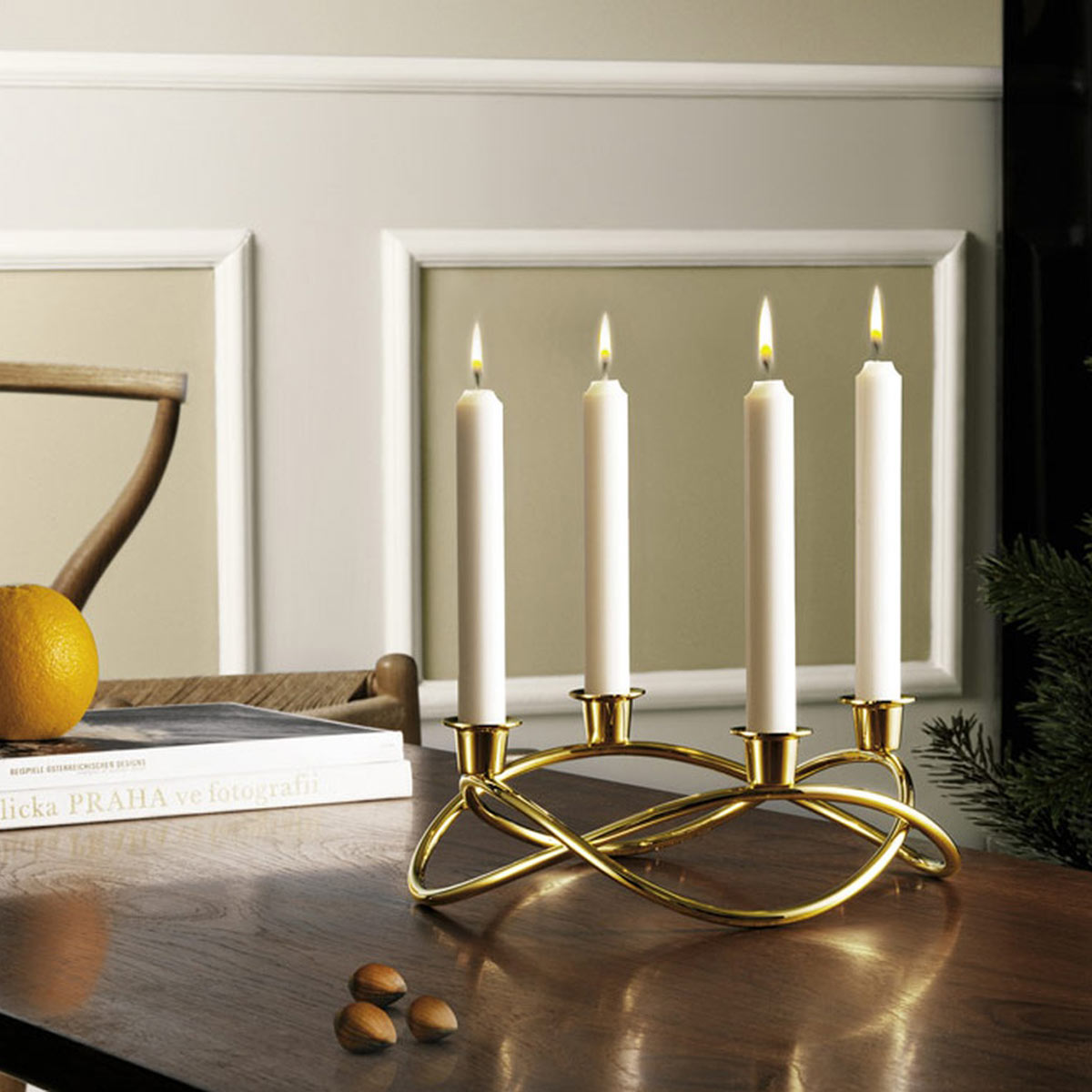 Binden Sie zu Weihnachten Tannenzweige oder rotes Band an den Fuß des Kerzenständers und gestalten Sie so einen wunderschönen Blickfang für Ihren Tisch. Das warme Gold betont das gemütliche Weihnachtsgefühl und lädt die ganze Familie ein, sich gemeinsam an den Tisch zu setzen.