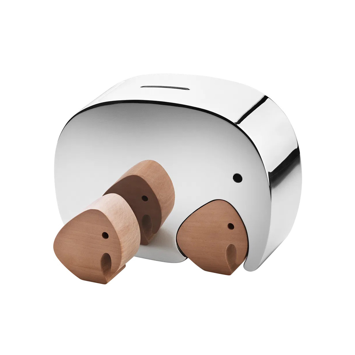 Das jüngste Design in der legendären Elefantenparade von Georg Jensen ist diese stilsichere, unverwechselbare Spardose mit zwei passgenauen kleineren Elefanten aus Eichenholz. Die Babyelefanten verleihen der Spardose eine besondere, geheime Note.