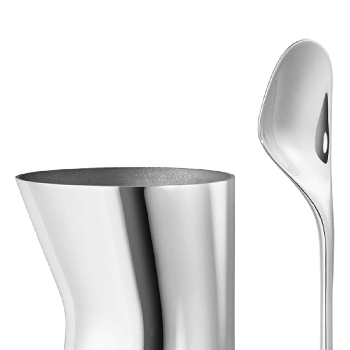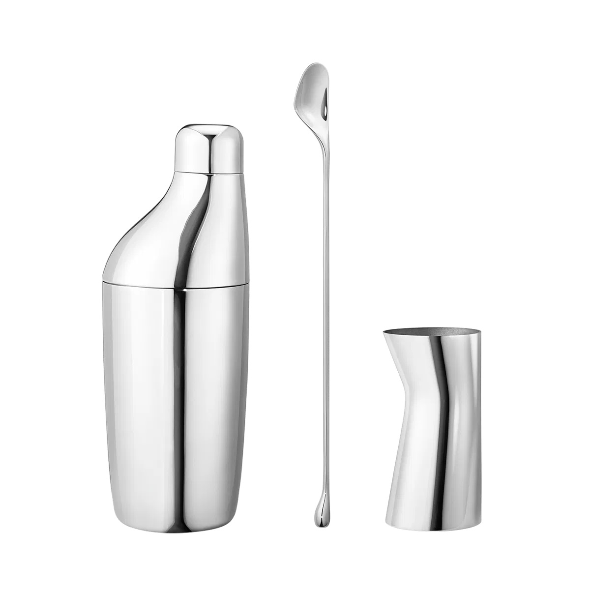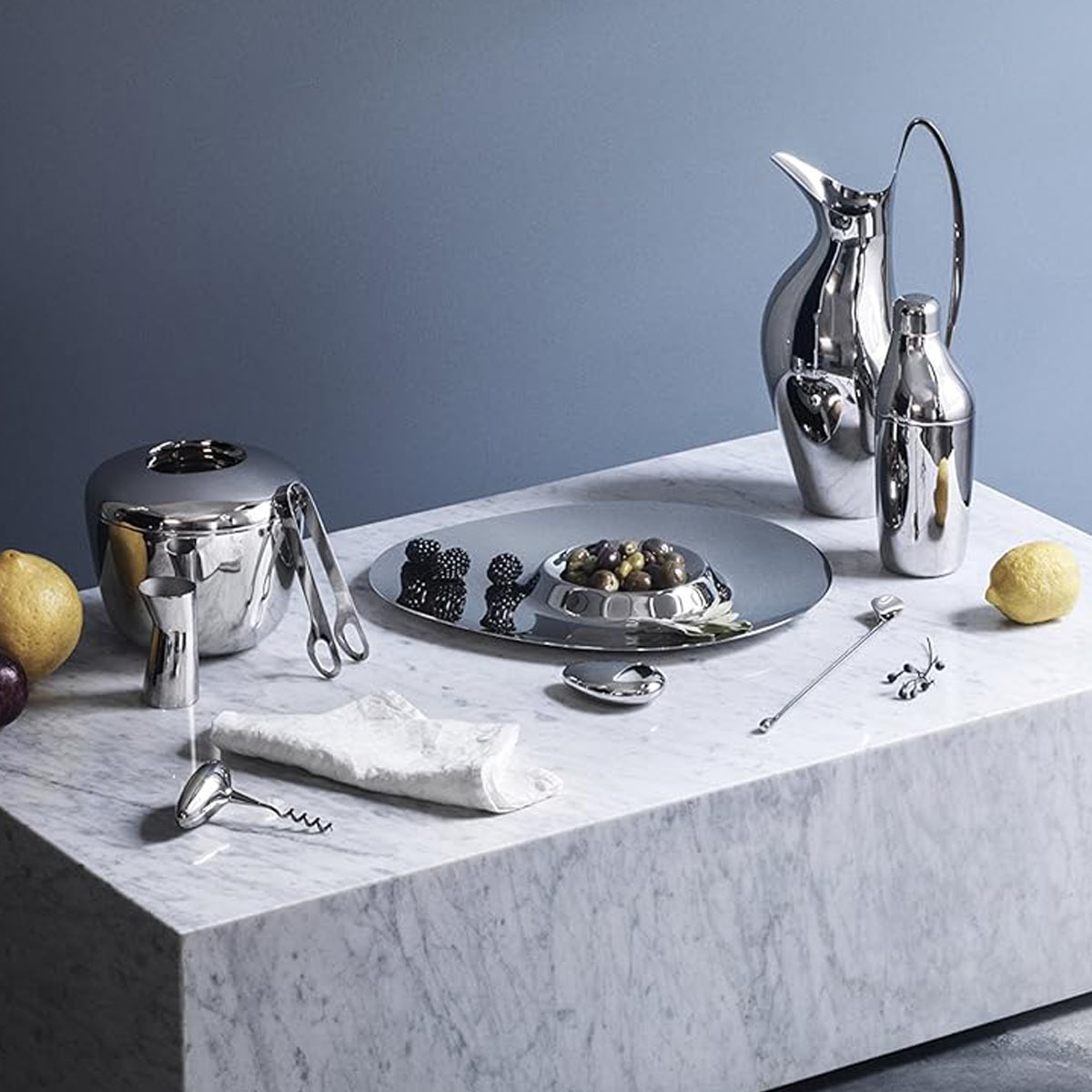 Der Designer Aurélien Barbry liebt es, ergonomische Designs zu kreieren, die sich auf die Funktionalität der Objekte beziehen und gleichzeitig ästhetisch sind. Seine skulpturalen Formen machen seine Werke zu einer natürlichen Ergänzung der langjährigen Verwendung organischer Formen durch Georg Jensen. Das Cocktail-Set besteht aus verspiegeltem Edelstahl, um ein minimales, aber luxuriöses Erscheinungsbild zu erzielen.