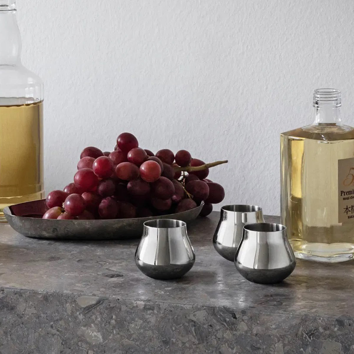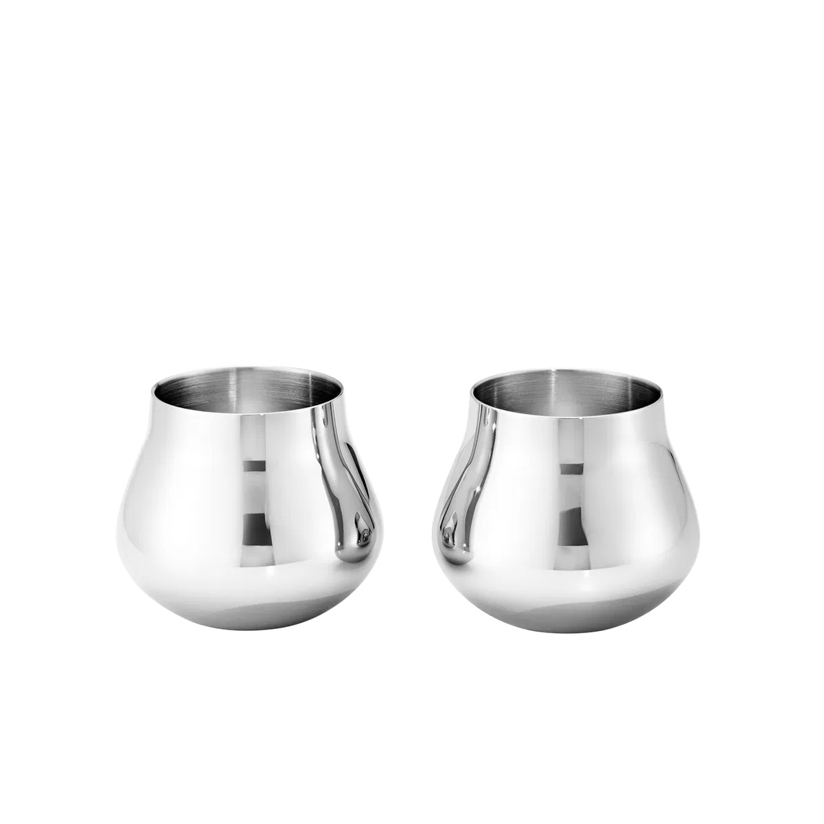 Diese Shotgläser aus Edelstahl sind eine absolut moderne und sehr stilvolle Interpretation des skandinavischen Rituals des Trinkens von Shots zum Anstoßen auf eine Feier oder zu köstlichen Speisen und werden sicherlich zum Gesprächsthema am Esstisch. Mit ihrer außergewöhnlichen skulpturalen Form und der glänzend polierten Oberfläche sind sie ein perfektes Geschenk für alle, die gerne Freunde einladen.