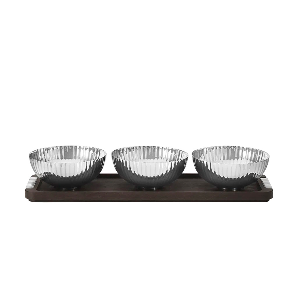 Sigvard Bernadotte war der Sohn des schwedischen Königs, machte aber eine bemerkenswerte Karriere als einer der frühesten Designer von Georg Jensen. Seine Arbeit ist stark von dem damals vorherrschenden Funktionalismus beeinflusst und zeichnet sich durch Raffinesse und Eleganz aus, jedoch niemals auf Kosten der Funktionalität. Die drei Schalen sind aus hochglanzpoliertem Edelstahl gefertigt. Das Tablett aus geräucherter Eiche ist lackiert, um Flecken und Abrieb zu reduzieren.