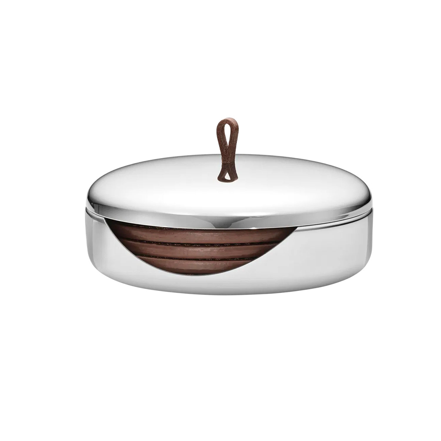 Es ist ein durchdachtes Geschenk für jeden, der elegantes modernes Design in seinem Zuhause schätzt. Aurelian Barbrys ergonomisches Sky-Set aus Bar- und Servierzubehör verkörpert die Kombination aus Form und Funktion, die das skandinavische Design auszeichnet. Das vom Designteam von Georg Jensen entworfene Untersetzer-Set ist eine stilvolle Ergänzung dieses Universums. Die vier Untersetzer bestehen aus demselben Leder, das auch für andere Sky-Produkte verwendet wird. Der Kasten besteht aus hochglanzpoliertem Edelstahl mit passendem Ledergriff.