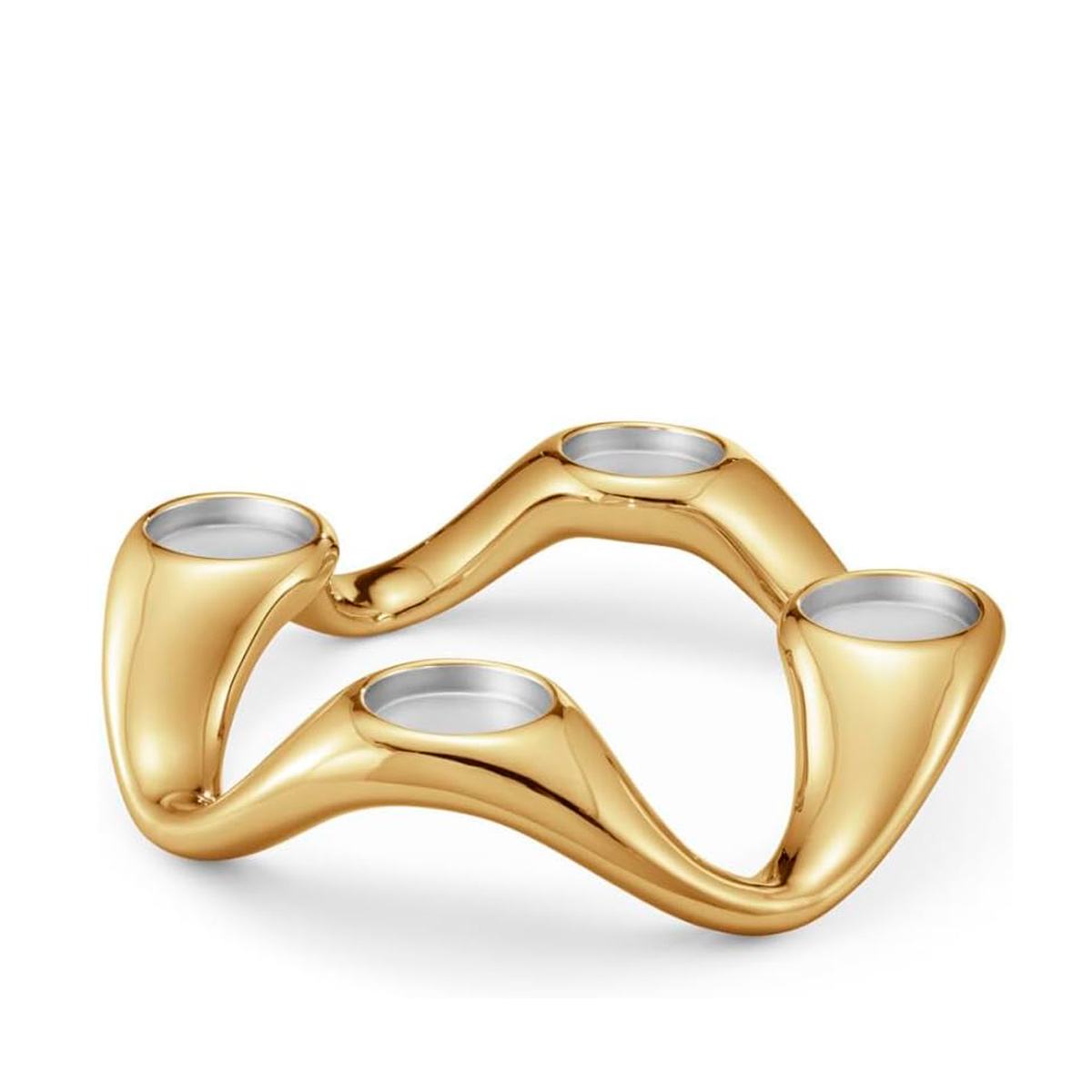Der vergoldete Cobra Kerzenhalter aus Edelstahl macht sich mit seiner wellenförmigen Form, die fast schon eine Bewegung einfängt, wunderschön in der Mitte des Tisches. Schaffen Sie mit dem Kerzenhalter, der Platz für vier Stumpenkerzen bietet, das ganze Jahr über eine warme und gemütliche Stimmung in Ihrem Zuhause.