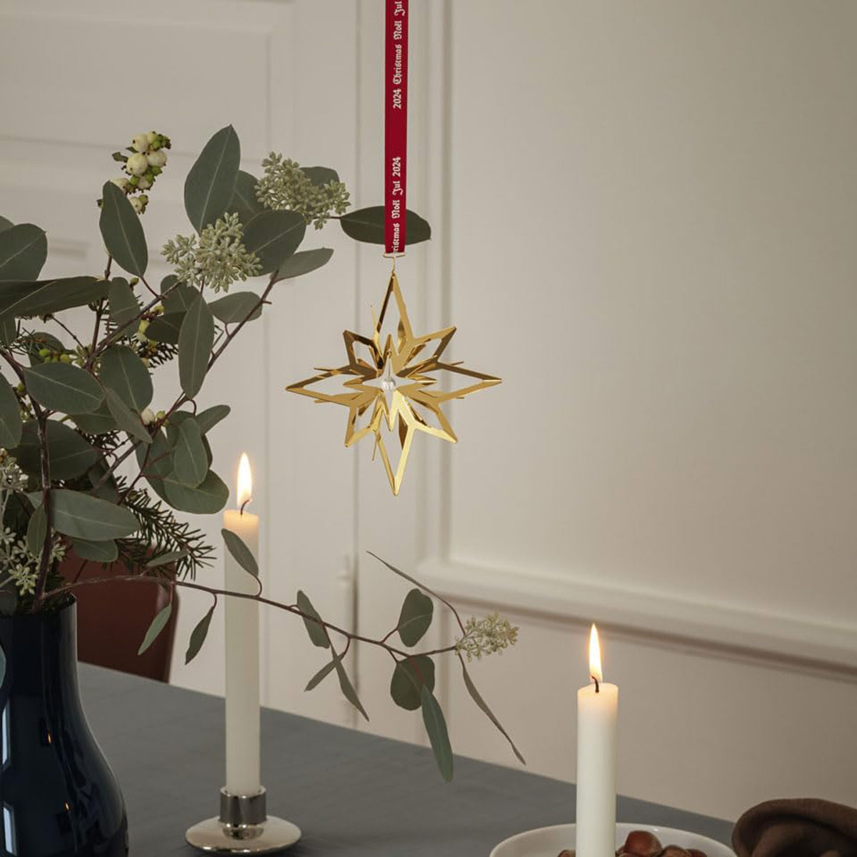 2024 ist das jährliche Weihnachtsmobile von Georg Jensen ein funkelnder Stern. Es wurde von Georg Jensens langjähriger Kooperationspartnerin Sanne Lund Traberg entworfen. Das Weihnachtsmobile hängt an einem schönen roten Band. In der Mitte des Ornaments funkelt eine hübsche kleine Zirkonia-Kugel. Der Stern ist mit 18 Karat Gelbgold plattiert und das feine Design ist von dem funkelnden Sternenteppich inspiriert, der den Himmel an einem dunklen Winterabend erleuchtet.
