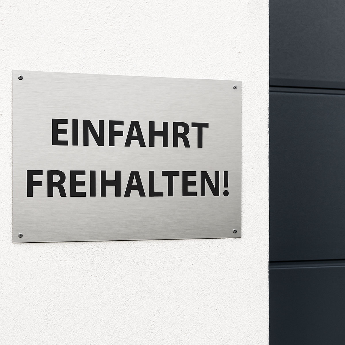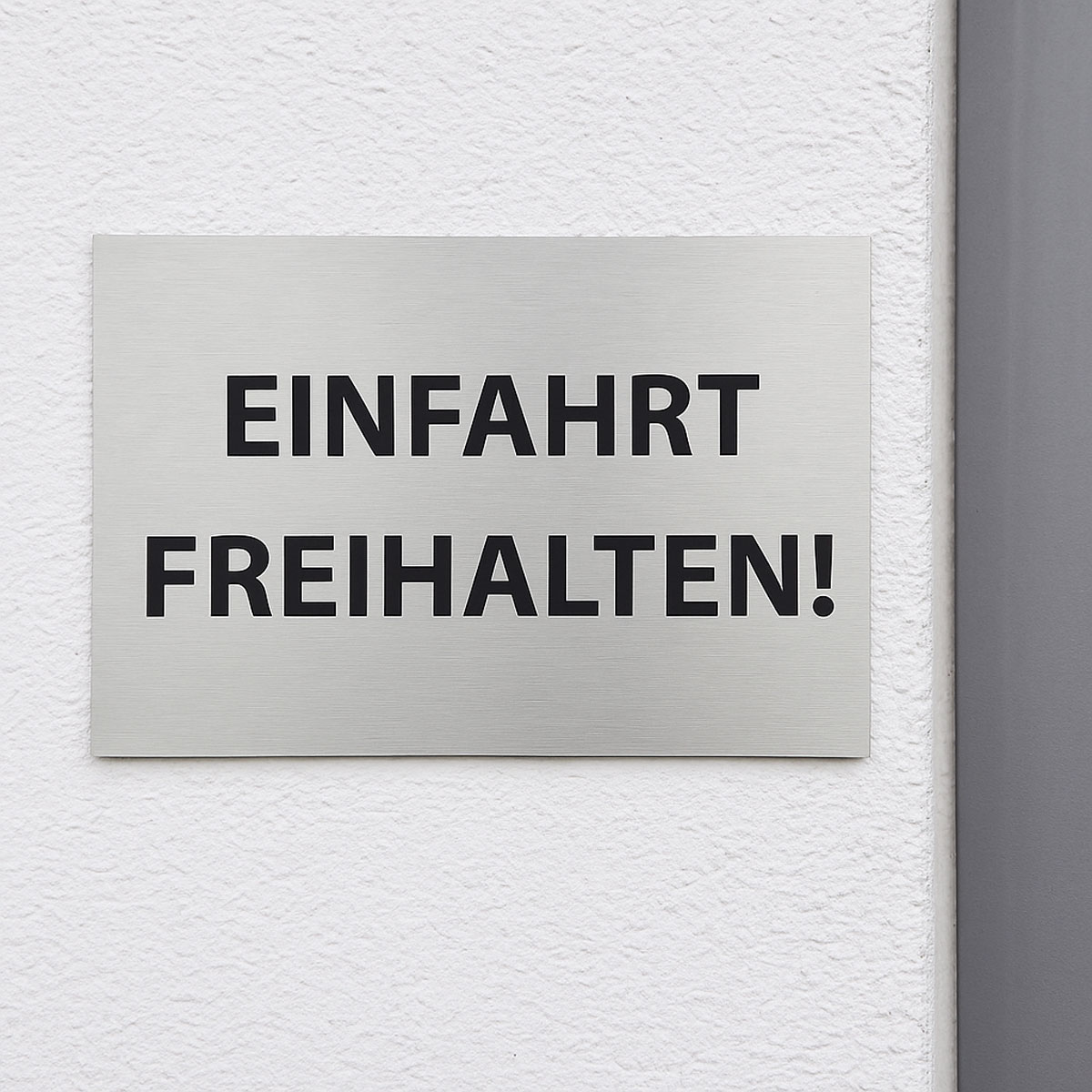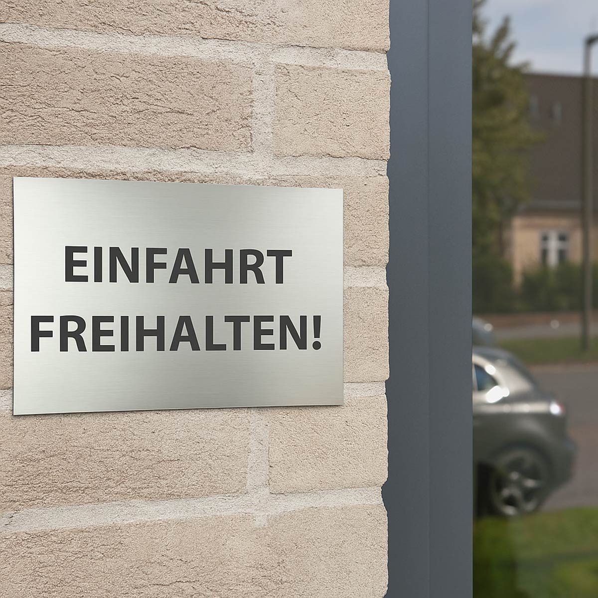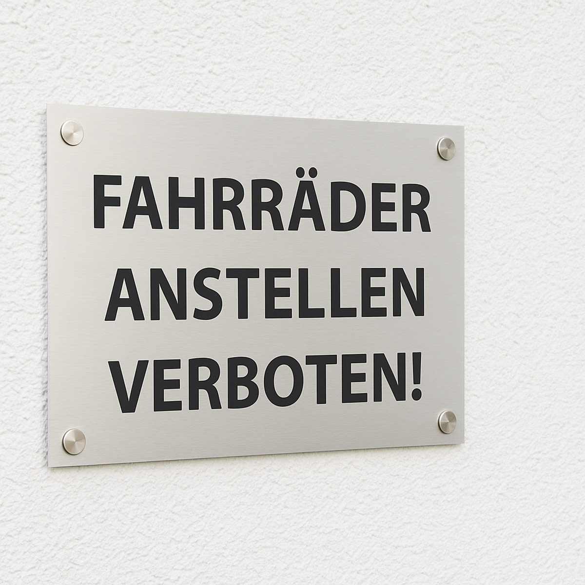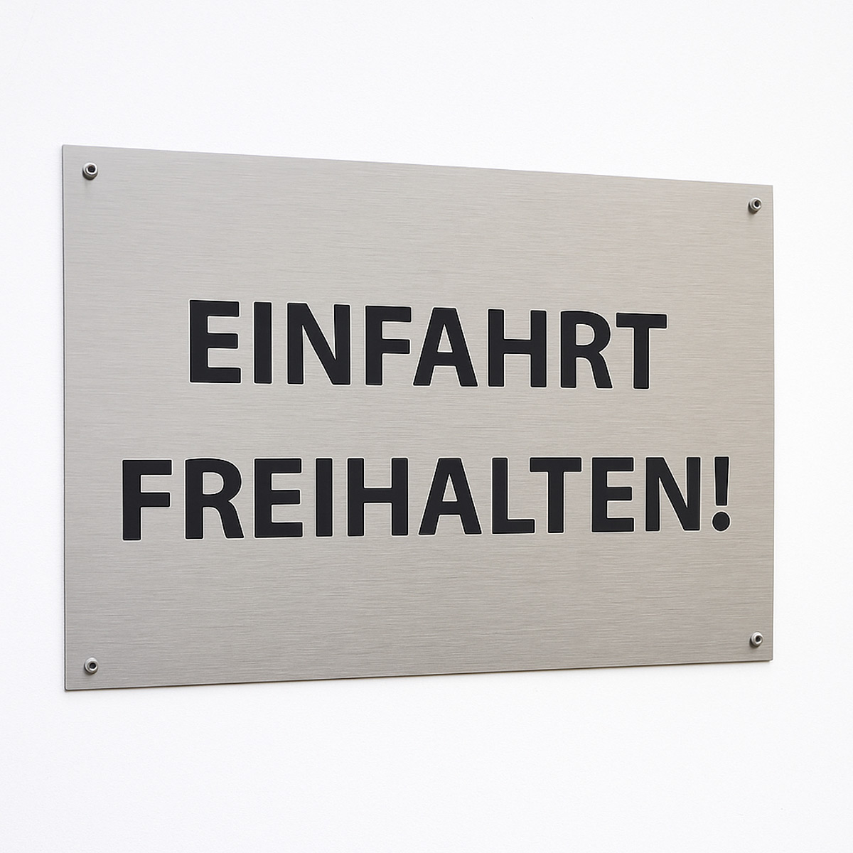 Das Schild in DIN A4 (210 x 297 mm) kann wahlweise geklebt, geschraubt oder mit Edelstahl-Befestigungsset montiert werden. Jedes Exemplar wird auf Bestellung gefertigt – für beste Qualität und saubere Verarbeitung.