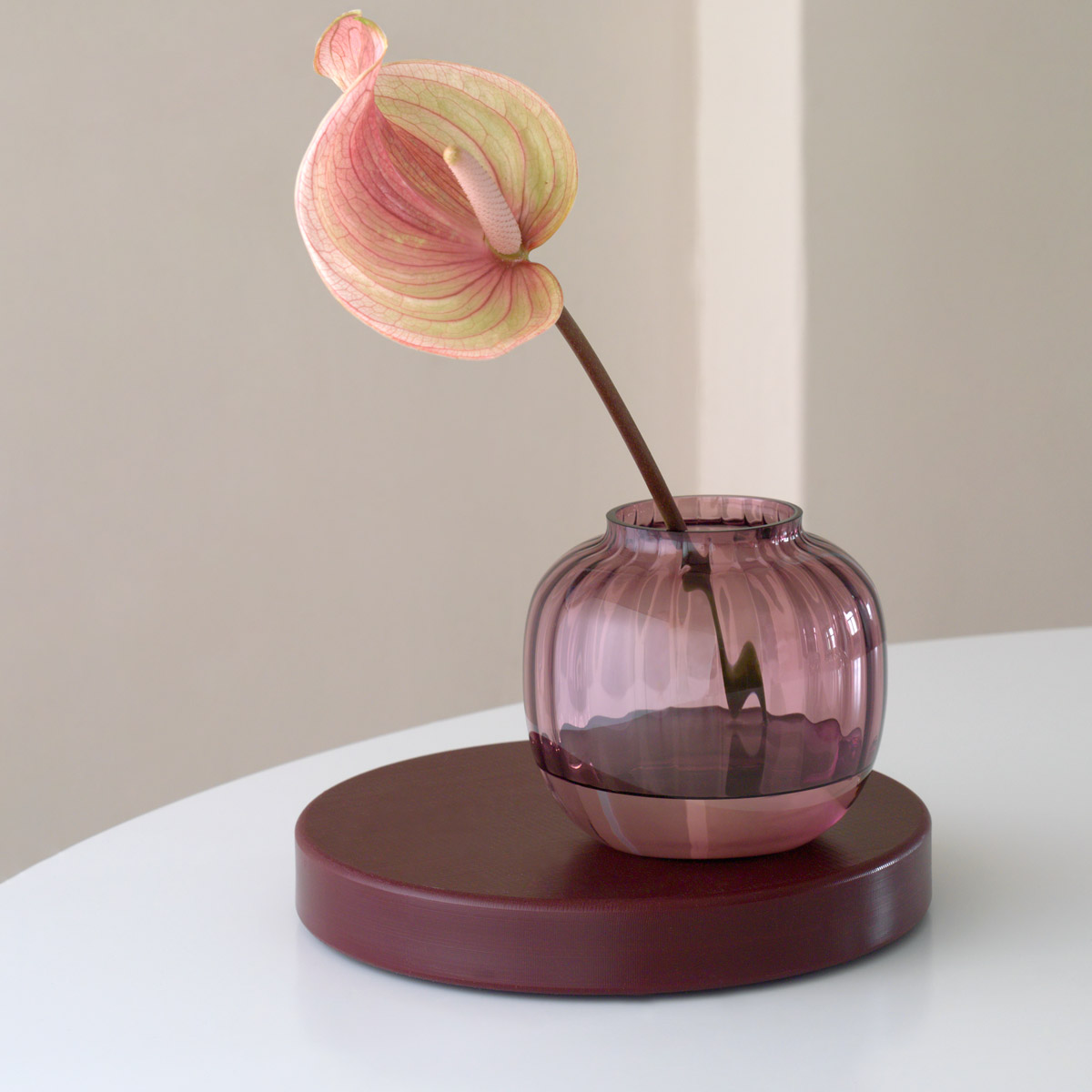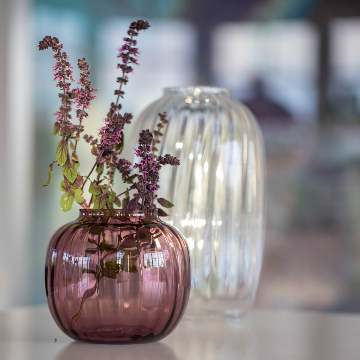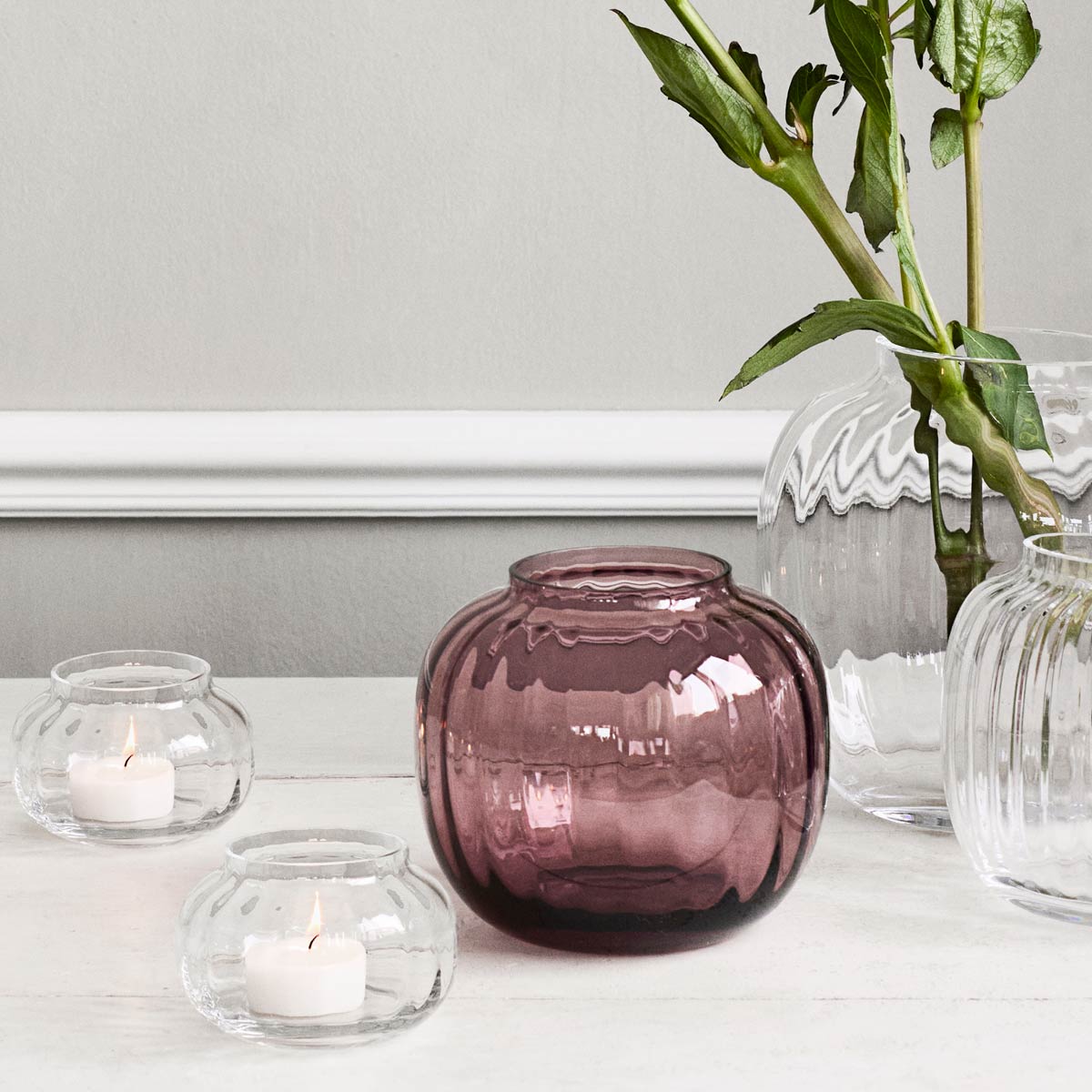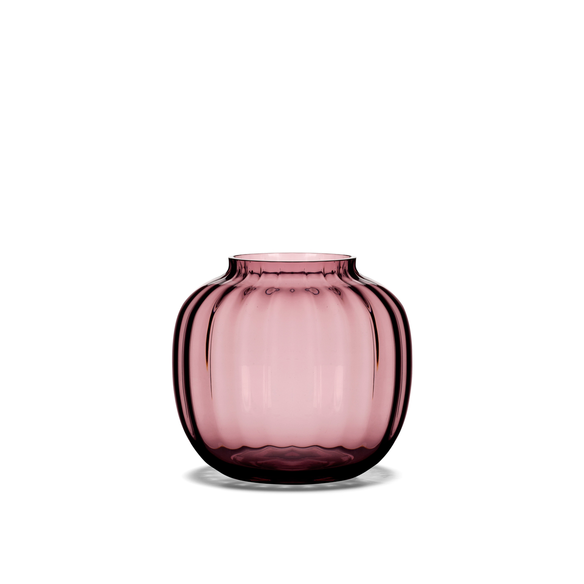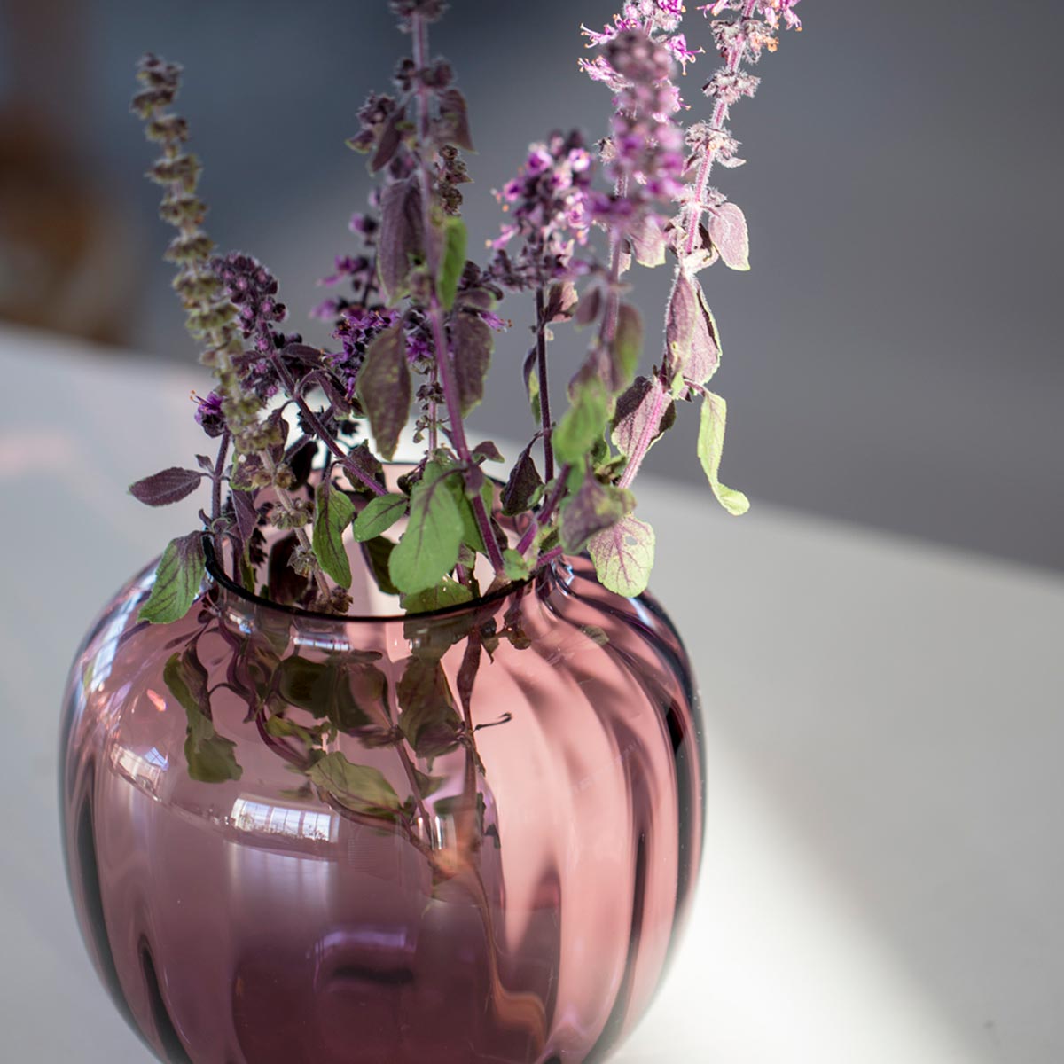 Die kleine Primula Vase von Holmegaard hat eine Höhe von 12,5 cm und wurde von Jacob E. Bang entworfen. Sie besteht aus pflaumenfarbenem, mundgeblasenem Glas und hat ein tolles optisches Muster, das für attraktive Effekte im Glas sorgt.