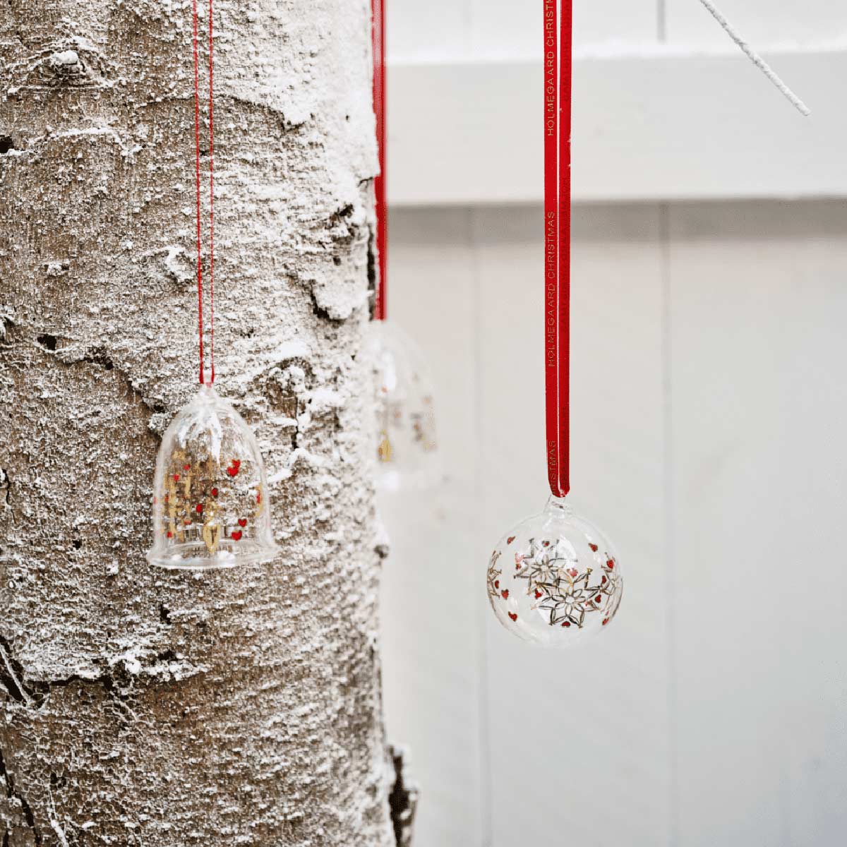 Die diesjährige Christmas-Weihnachtsglocke von Holmegaard, entworfen von Ann-Sofi Romme, zeigt einen goldfarbenen Strohstern, umgeben von kleinen roten Herzen. Die durchsichtige Glasglocke mit goldfarbenen und roten Details und einem roten Band lässt sich leicht aufhängen.
