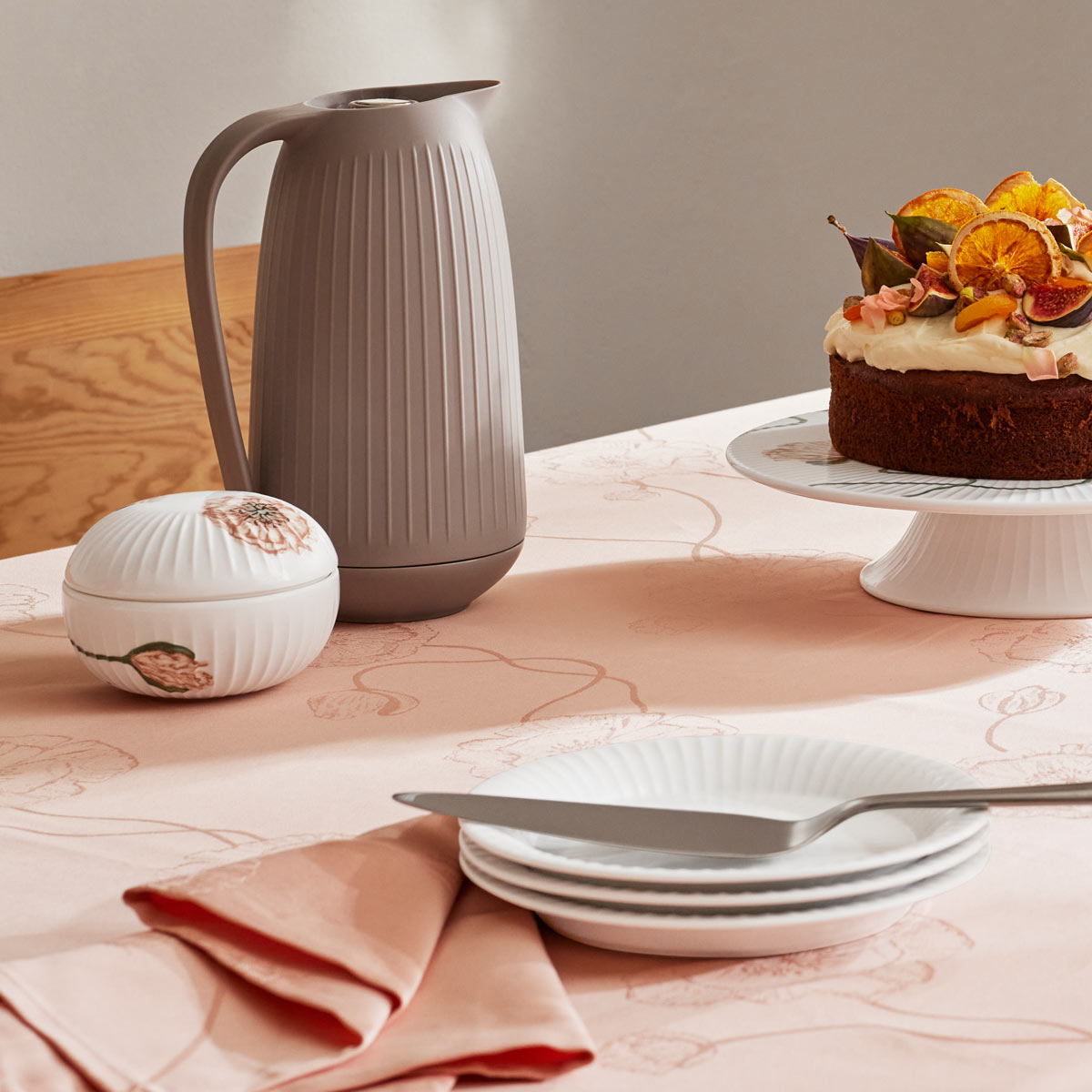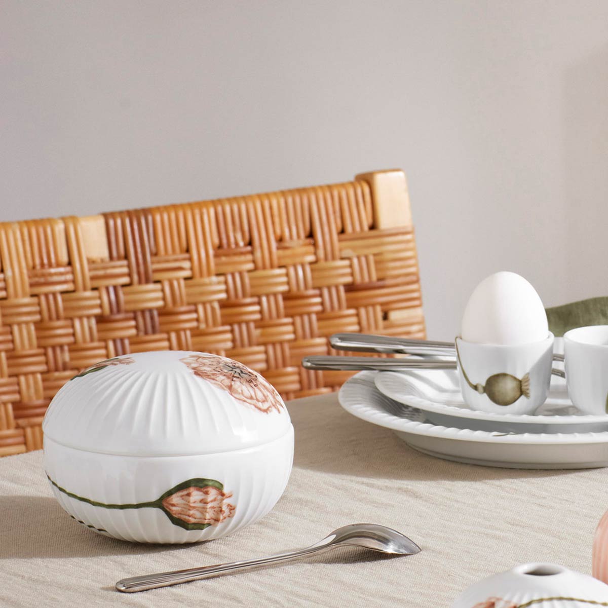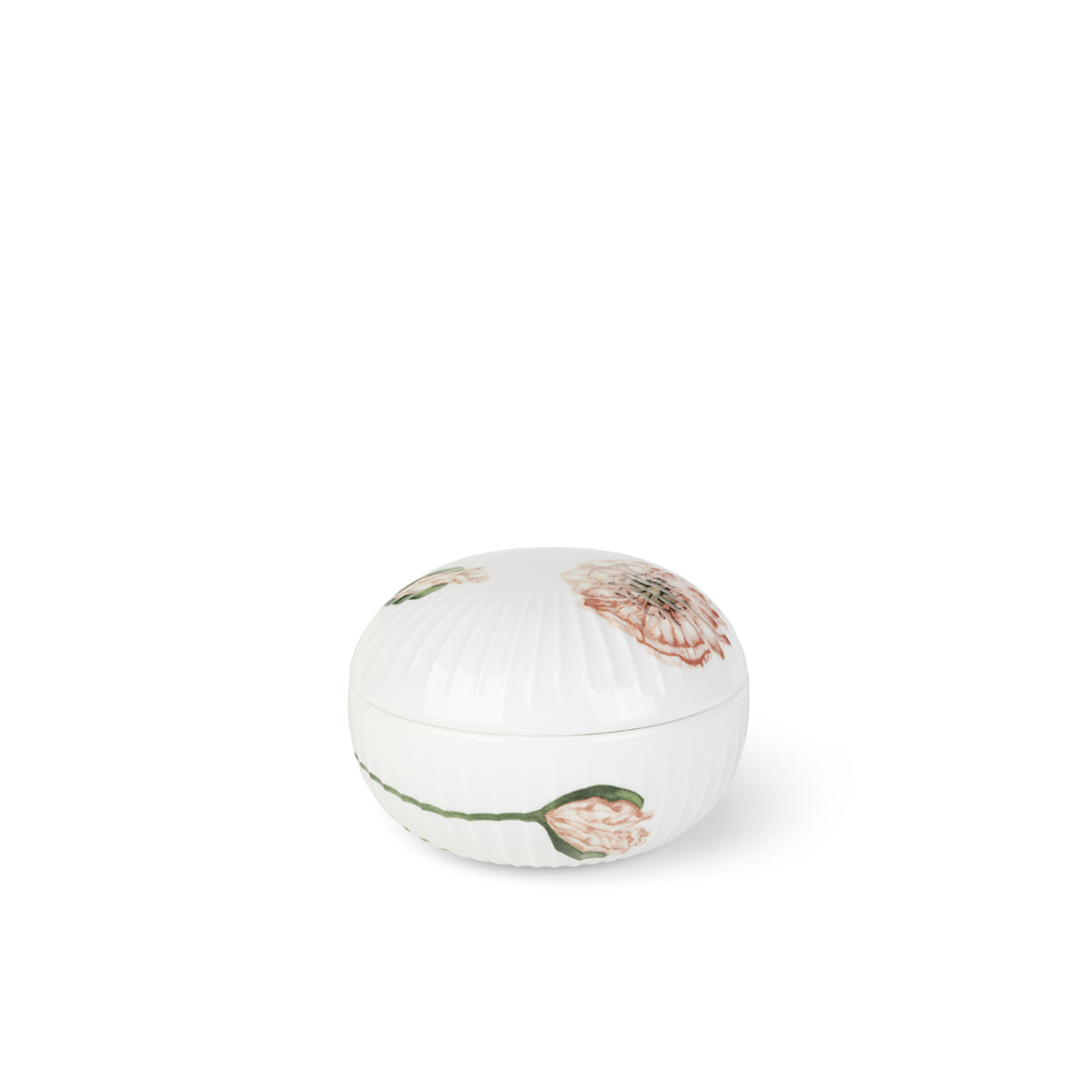 Hammerhøi Poppy ist eine moderne, florale Dekoration mit der atemberaubenden Schönheit des Mohns. Die Dekoration wurde von der Künstlerin Rikke Jacobsen geschaffen, die sich mit der Schönheit des Mohns auseinandersetzt und in ihre Designs den Stängel, die ersten Knospen und die Blüte integriert. Die Mohnblumen, die sich um die weiße Hammershøi-Bonbonniere winden, bilden einen wunderbaren Kontrast zum schlichten Porzellan.
