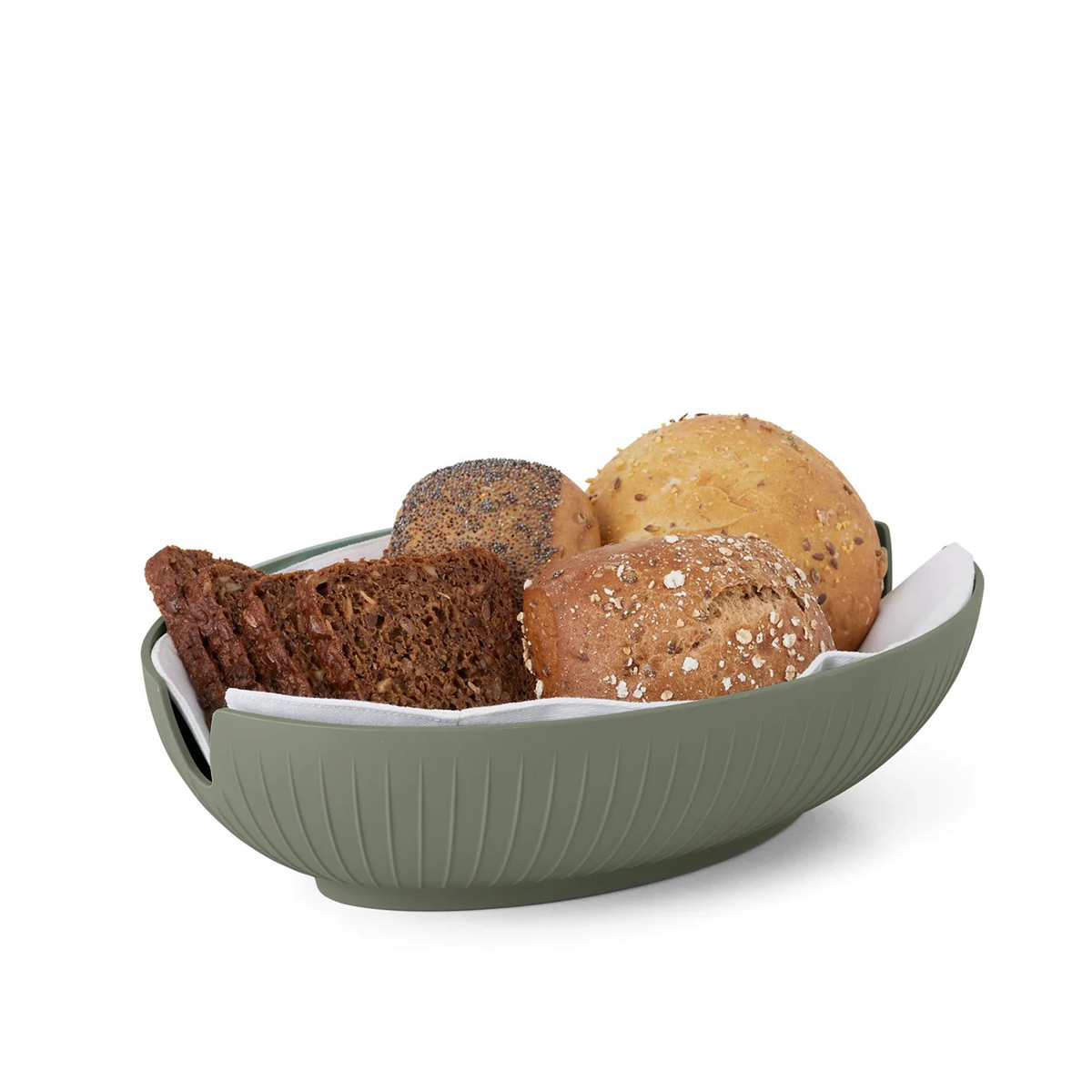 Der elegante Brotkorb der Hammershøi-Serie von Kähler ist aus olivgrünem, biobasiertem Kunststoff gefertigt und hat die gleiche matte Oberfläche wie die grüne Thermoskanne der Serie. Der Korb hat einen praktischen Schlitz, in den das Brotmesser gesteckt werden kann, damit es immer griffbereit ist.