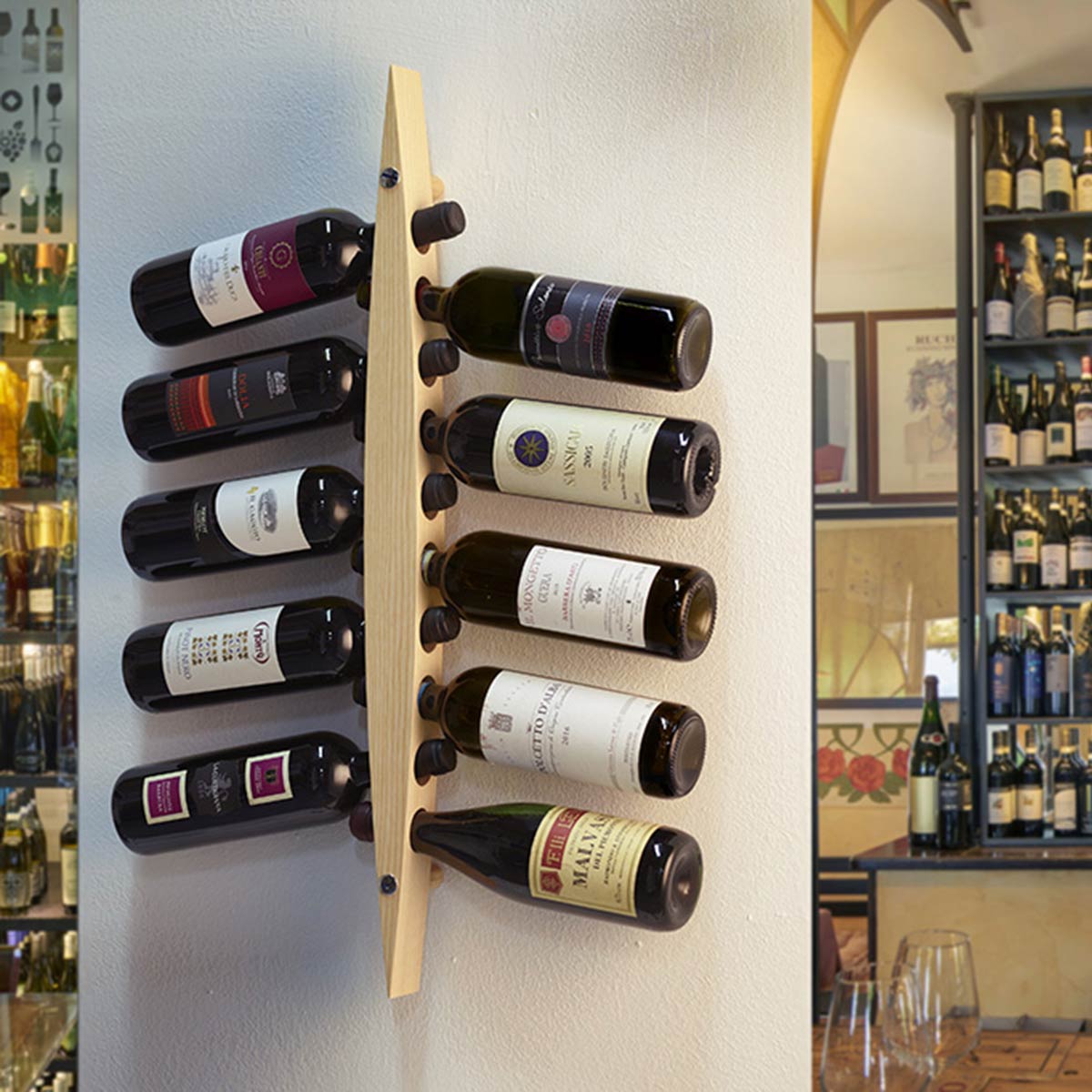 Das organische Design und die klare Formensprache fügen sich harmonisch in jede Umgebung ein, sei es in der heimischen Küche, im eleganten Esszimmer oder im professionellen Weinkeller. Dabei steht die Funktionalität der Ästhetik in nichts nach: Das Regal bietet Platz für zehn Flaschen, die in einem exakt berechneten Winkel gelagert werden. Diese Neigung erfüllt zwei essenzielle Aufgaben für den anspruchsvollen Weingenießer, indem sie den Korken stets feucht hält und so die Haltbarkeit des Weines verlängert, während sich das Sediment gleichzeitig auf natürliche Weise am Boden absetzen kann.