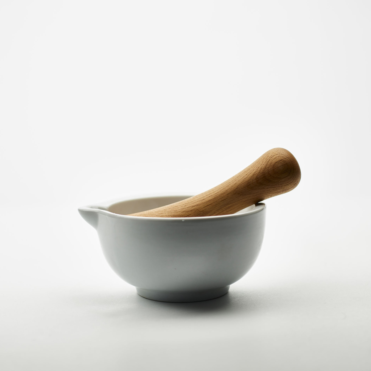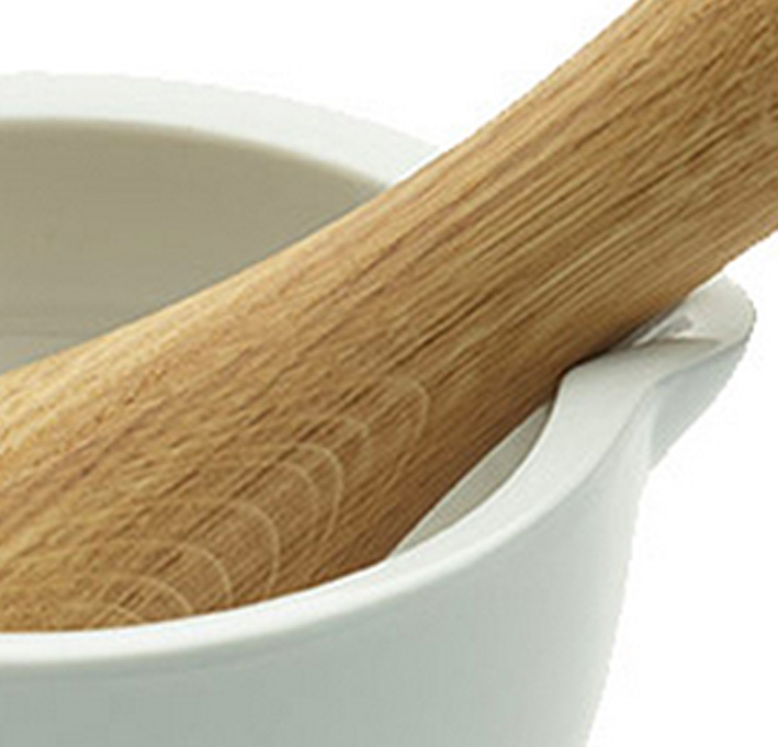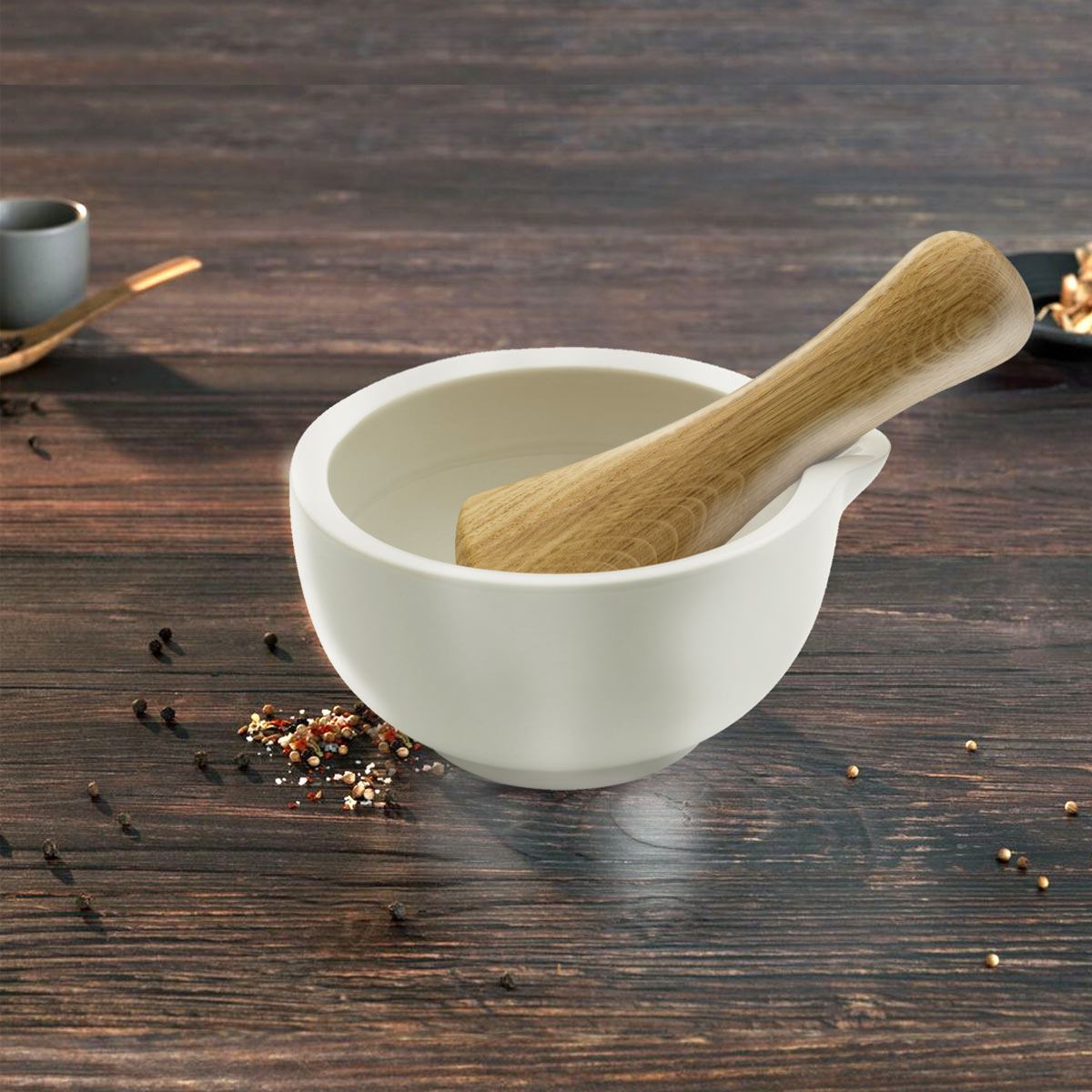 Ein besonderes Merkmal, das den PRESSUM von gewöhnlichen Mörsern unterscheidet, ist die harmonische Verbindung von Form und Nutzen. Die weichen Rundungen der Keramikschale münden in einem praktischen Ausguss, der das präzise Dosieren von Flüssigkeiten und Essenzen erleichtert. Gleichzeitig dient dieser Ausguss als stilvolle Ruheposition für den eleganten Holzstößel, wenn dieser gerade nicht im Einsatz ist. Dieses durchdachte Design macht den Mörser zu einem originellen Dekorationsobjekt, das jedem Raum – von der modernen Loft-Küche bis zum rustikalen Landhausstil – einen Hauch von zeitloser Klasse verleiht.
