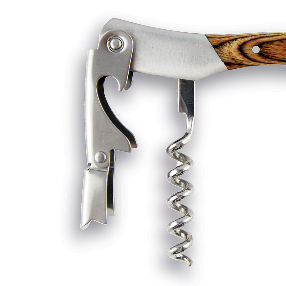 Das Herzstück bildet der technologisch ausgereifte Korkenzieher mit doppelter Hebelwirkung. Sein doppelt gelagerter Drehpunkt bietet einen signifikanten mechanischen Vorteil gegenüber herkömmlichen Modellen mit nur einem Gelenk und ermöglicht ein makellos sauberes Herausziehen selbst längster Korken. Ergänzt wird diese Funktionalität durch eine spezialisierte Kurvenklinge zum Kapselschneiden. Die feine Verzahnung und die perfekt auf den Flaschenhals abgestimmte Krümmung garantieren einen präzisen und mühelosen Schnitt der Folie.