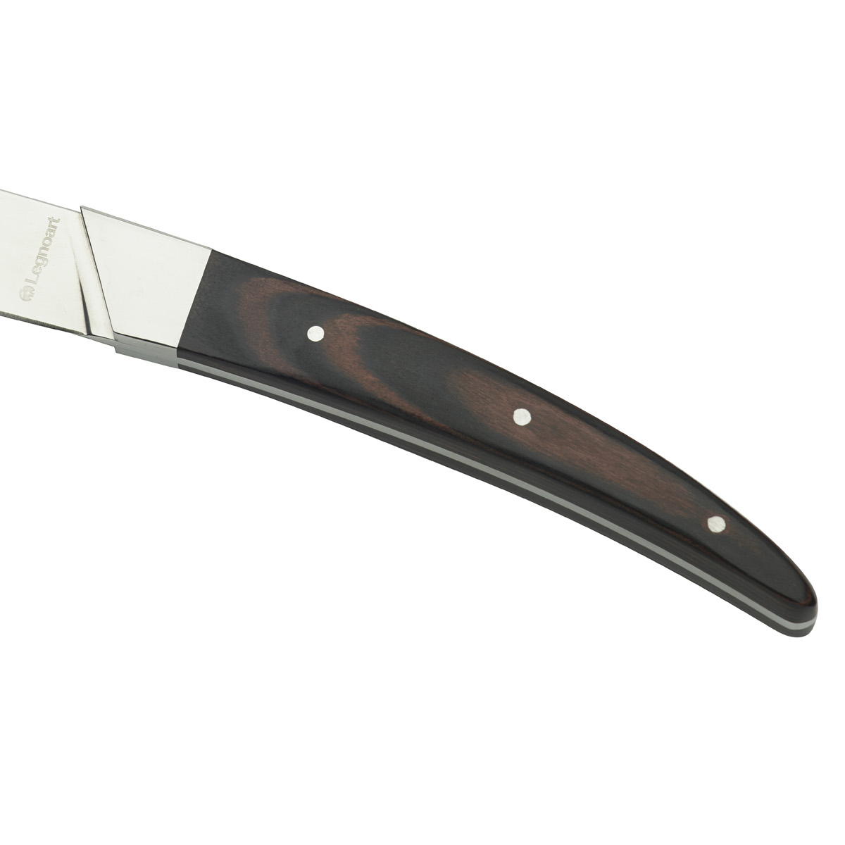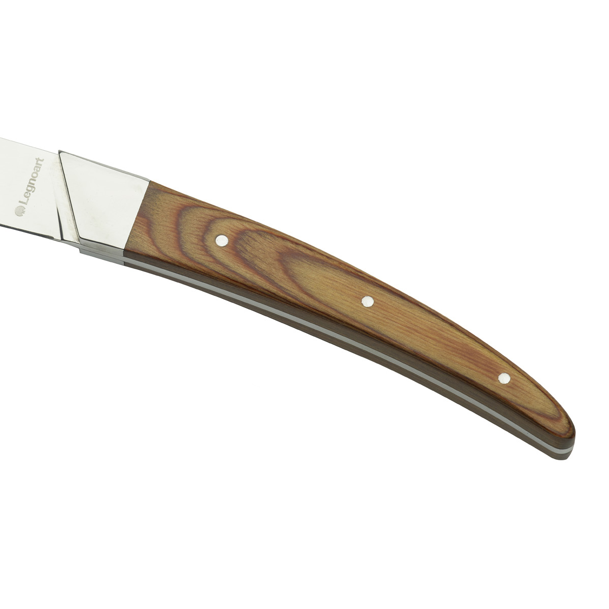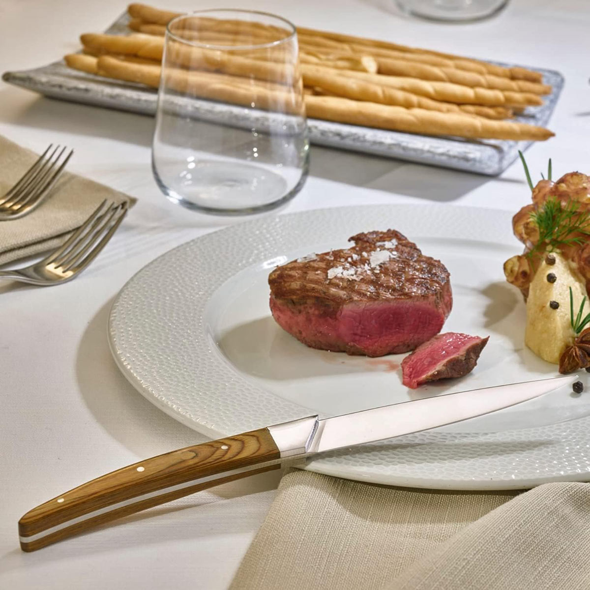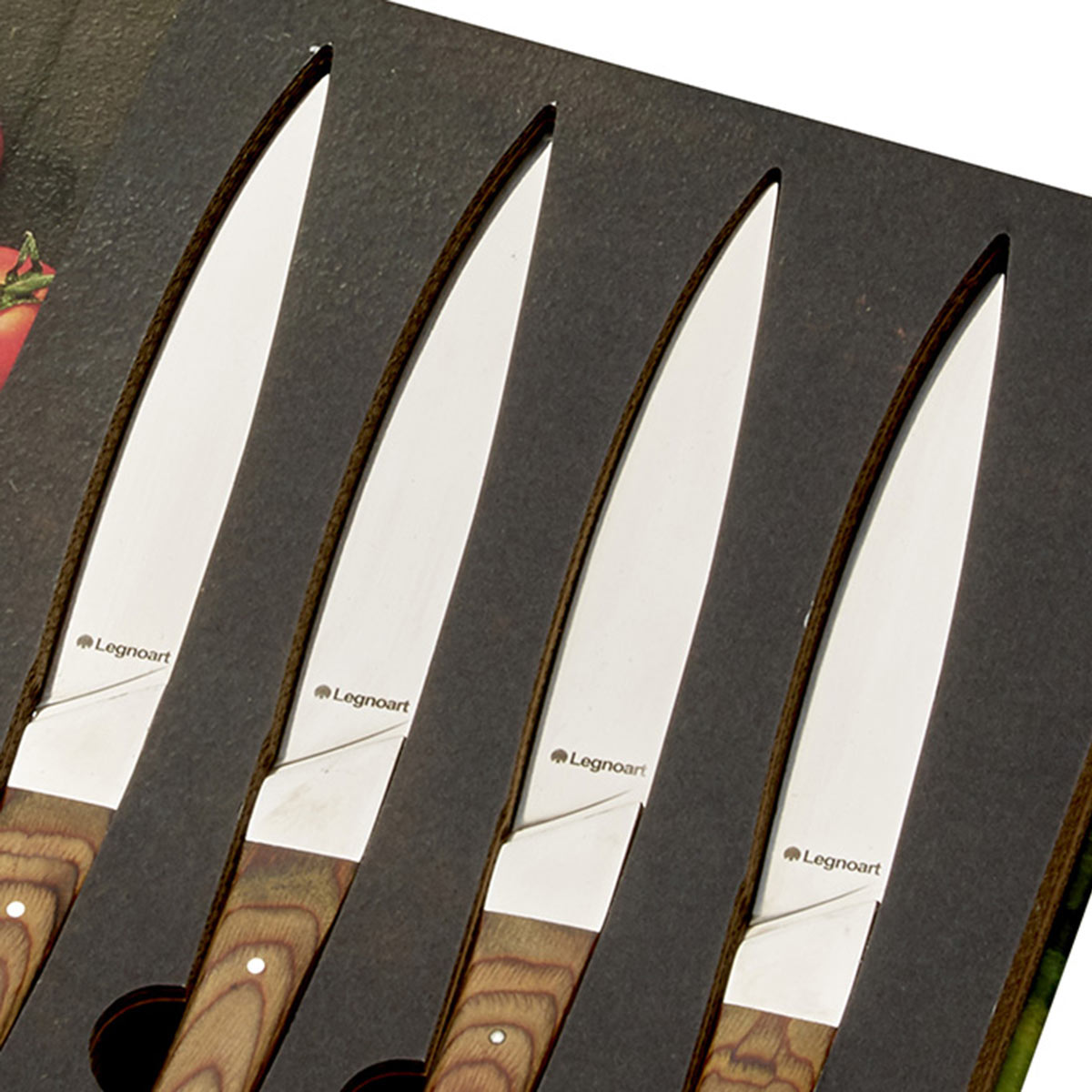 Das Steakmesser-Set PORTERHOUSE von Legnoart verwandelt den Genuss eines erstklassigen Steaks in ein unvergleichliches Erlebnis. Entworfen vom renommierten Designer Enrico Albertini, vereint dieses Set maximale Ergonomie mit einer zeitlosen Eleganz, die speziell für wahre Fleischliebhaber entwickelt wurde. Jedes Messer ist ein Zeugnis höchster handwerklicher Qualität: In der italienischen Manufaktur wird jedes Stück einzeln bearbeitet, der edle Griff aus robustem Stamina-Holz präzise vernietet und die Klinge anschließend von Hand geschärft. Bevor ein Set die Werkstatt verlässt, wird jedes Messer sorgfältig analysiert und getestet, was die Einzigartigkeit des Originals garantiert und es deutlich von gewöhnlichen Massenprodukten abhebt.