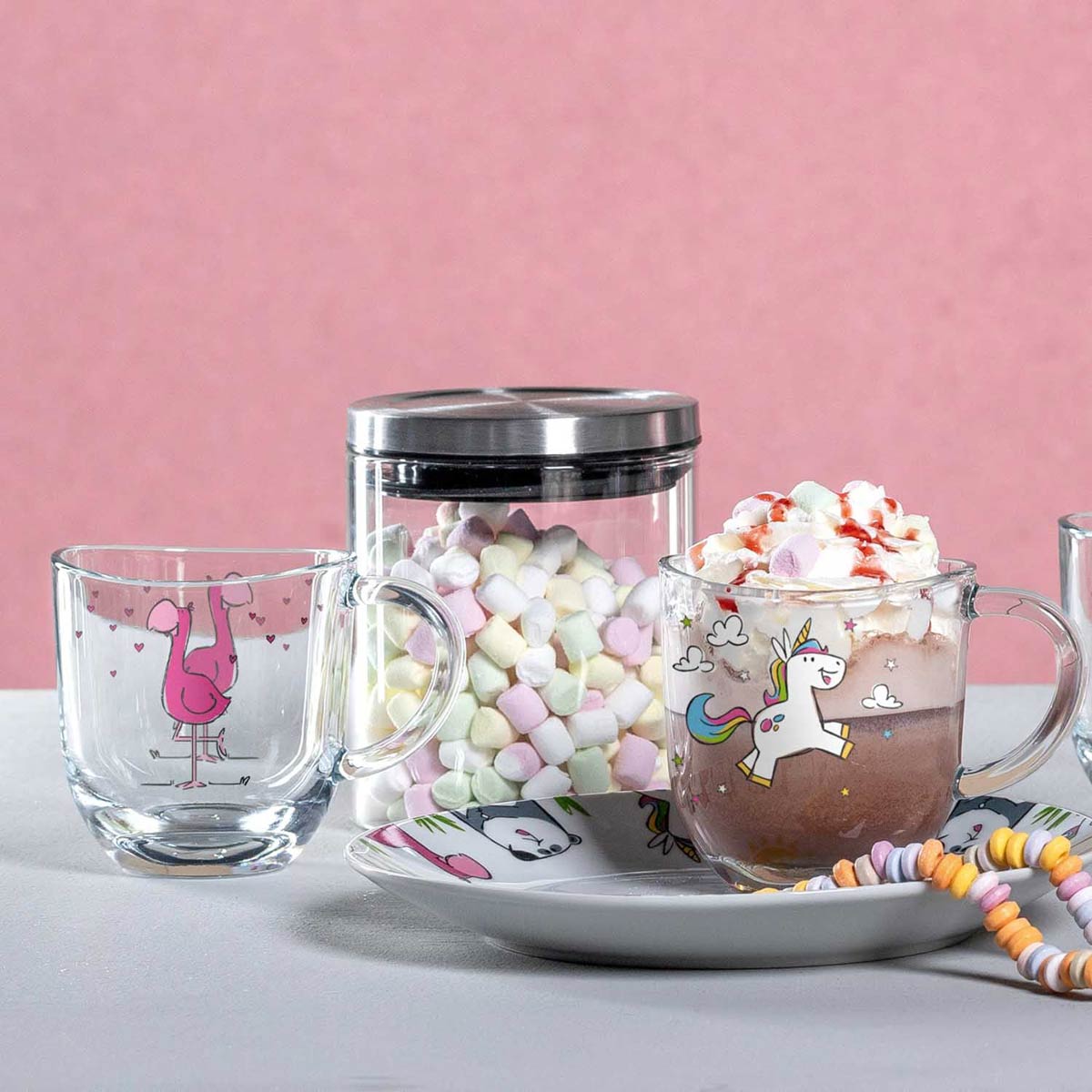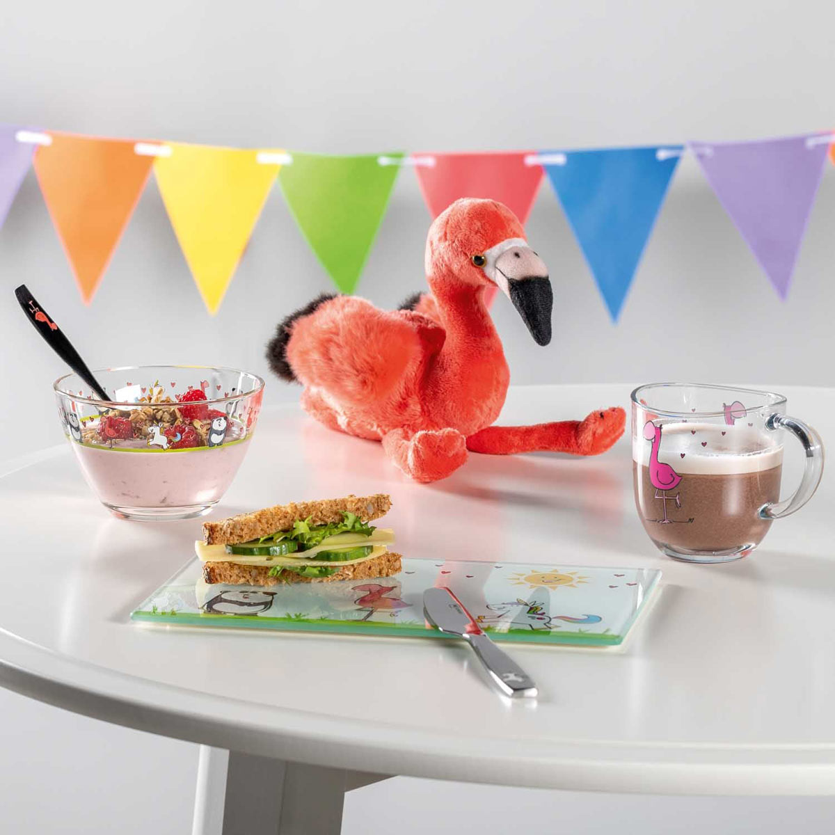 Mit unserer BAMBINI Flamingo-Kindertasse wird auch das Trinken zum Abenteuer. Durch den Henkel an der Glastasse können die Kleinen ihr Lieblingsgetränk viel besser schlürfen, da sie die Tasse sicher im Griff haben. Nicht zuletzt durch unsere tierischen Lieblingscharaktere geht es manchmal wild am Tisch zu.