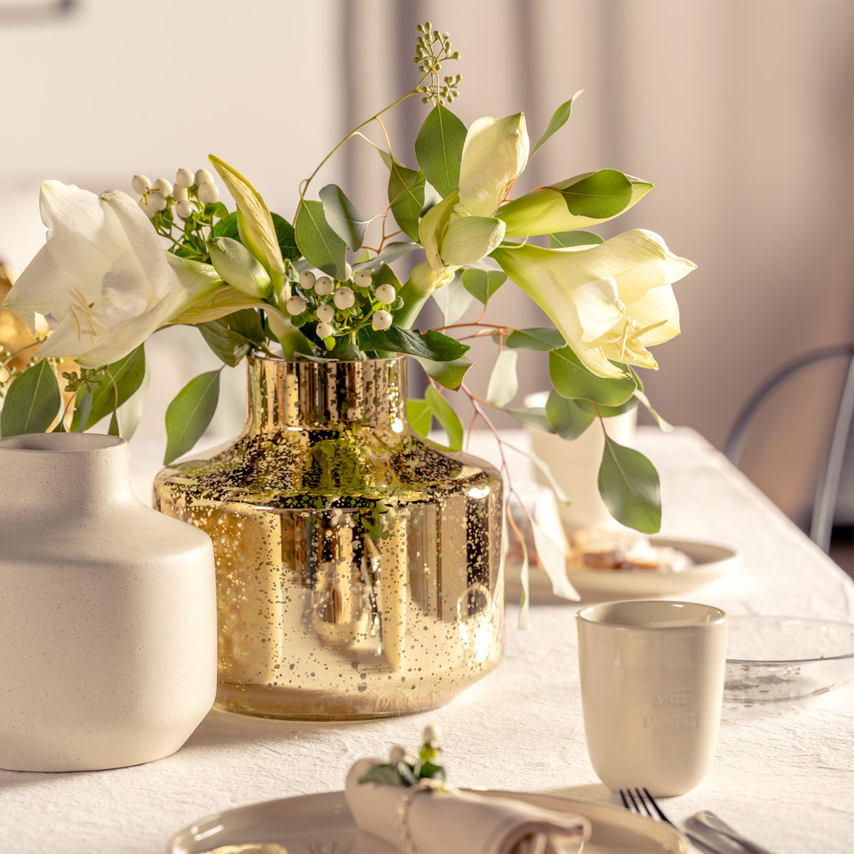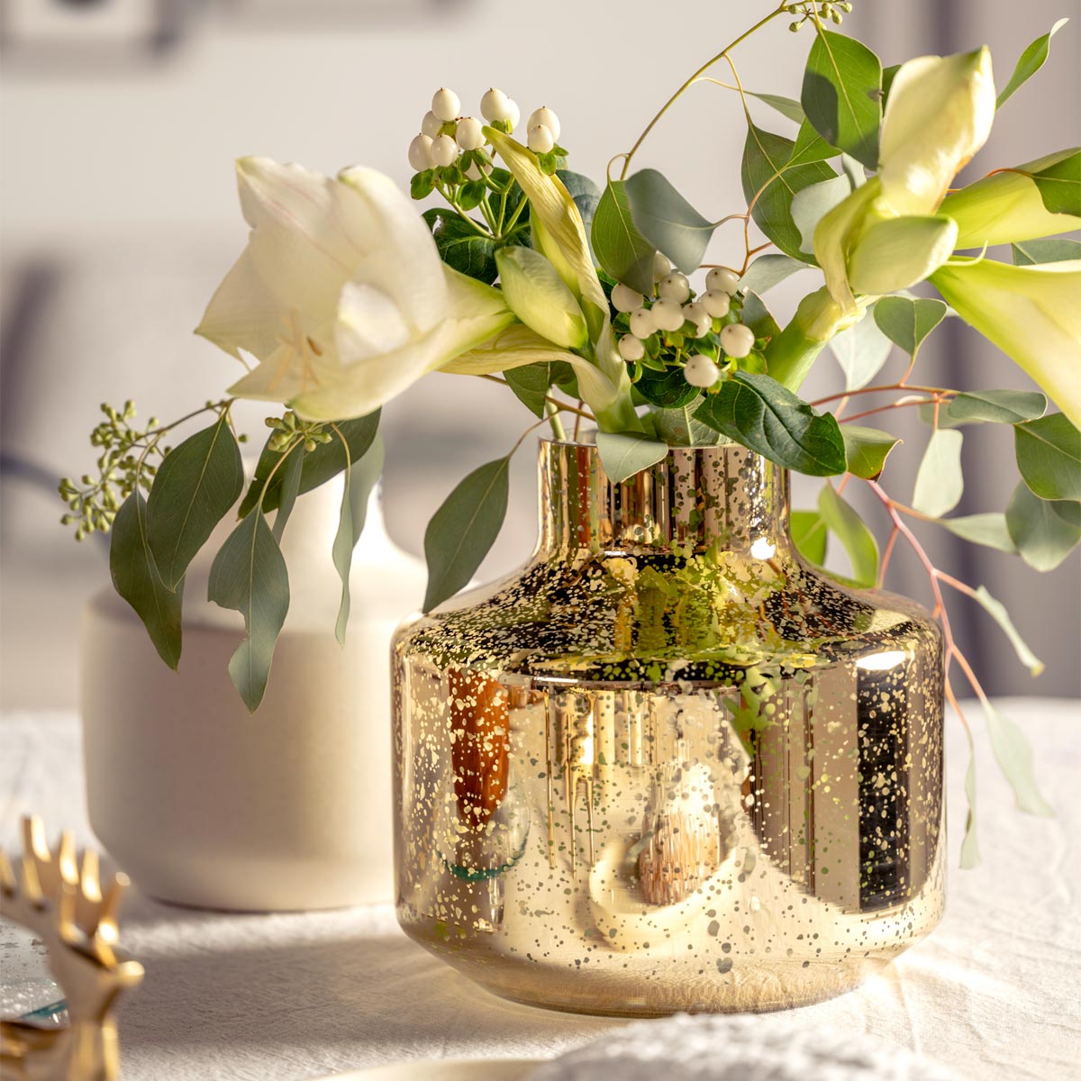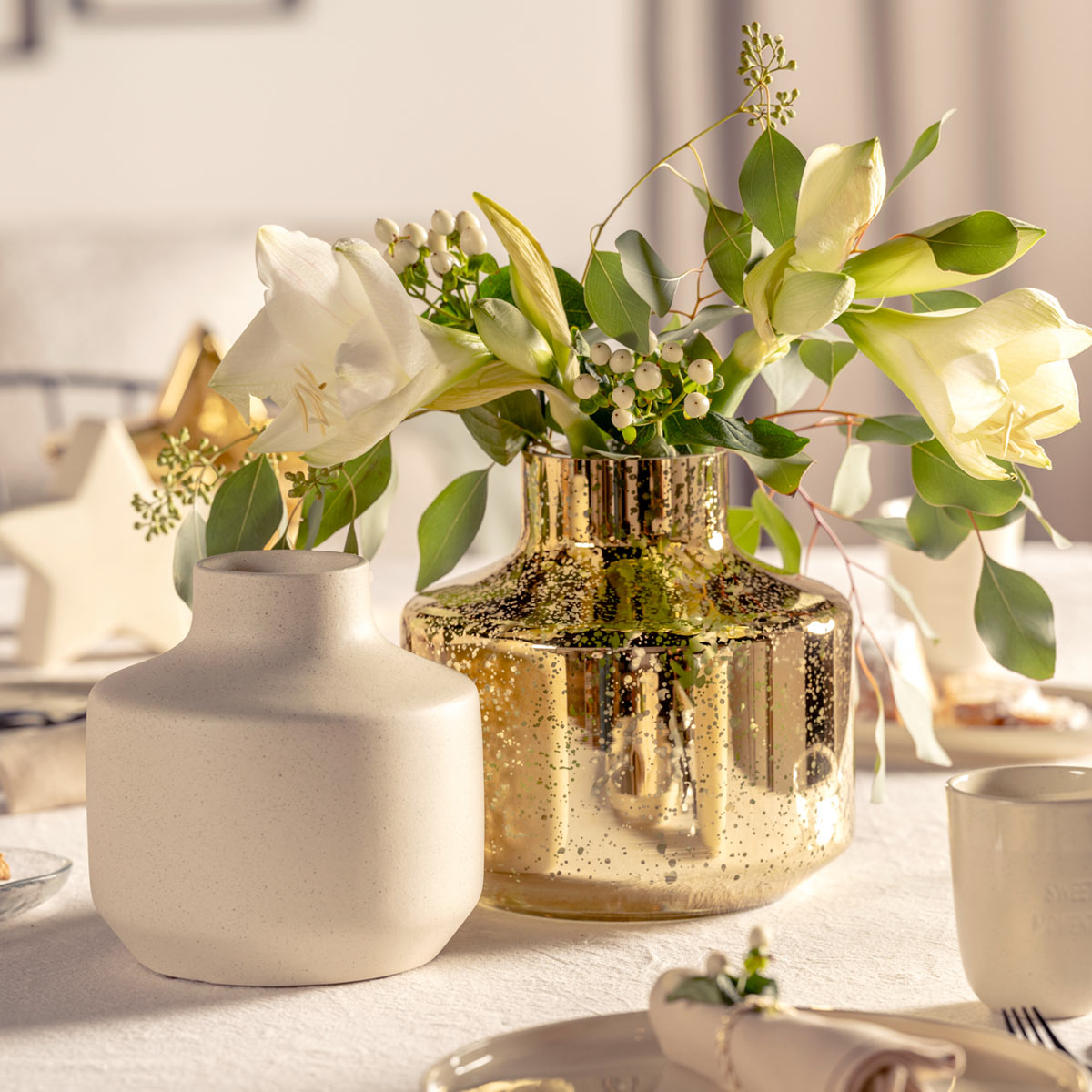 Entdecke zeitlose Eleganz mit unserer exquisiten goldgesprenkelten Vase - eine wahre Kostbarkeit, das nicht nur zu Weihnachten strahlt! Diese edle Vase ist das perfekte Accessoire für Dein Zuhause, das das ganze Jahr über Glanz und Glamour verleiht. Handgefertigt mit Liebe zum Detail, fängt unsere Vase MILANO das Licht ein und verbreitet einen Hauch von Luxus in jedem Raum.