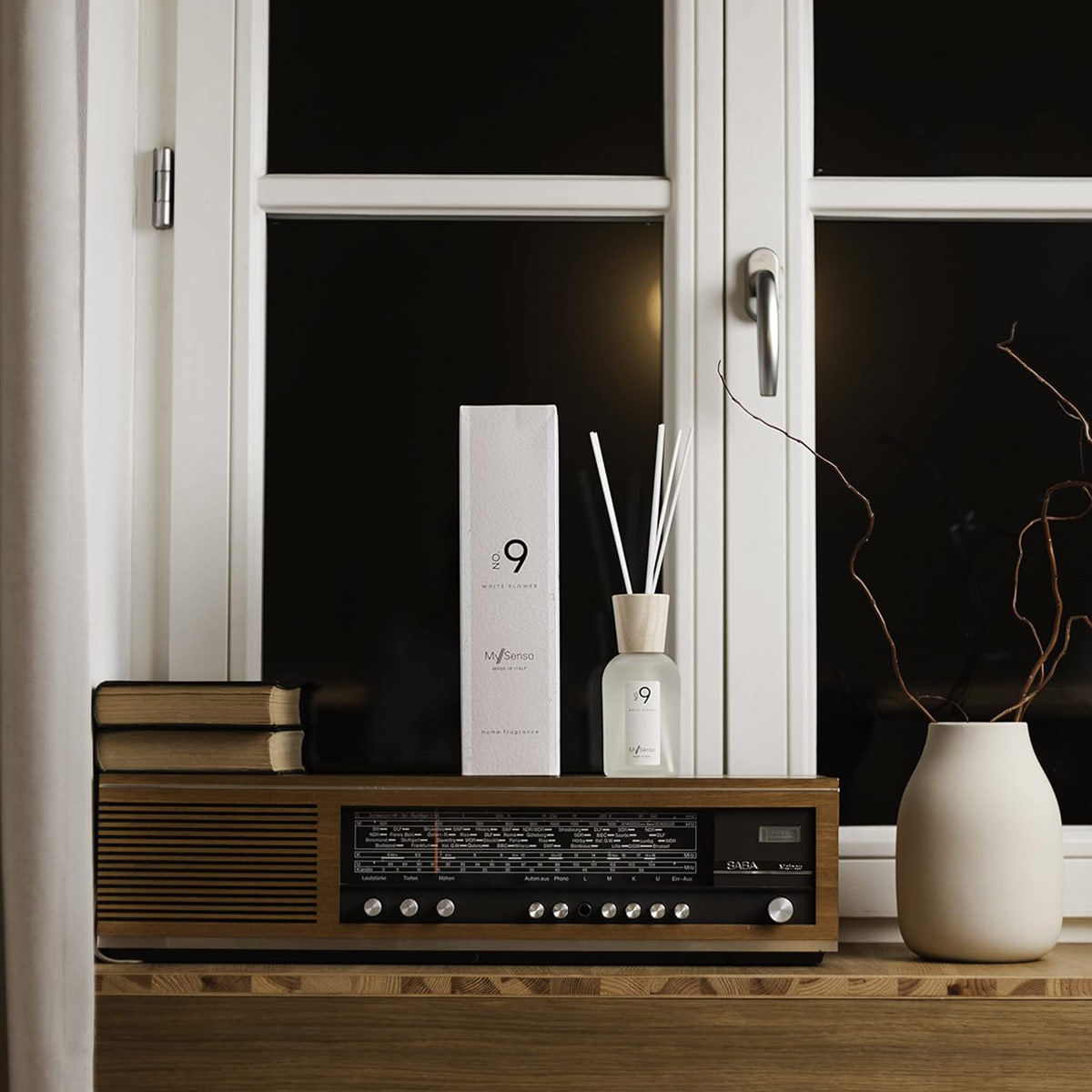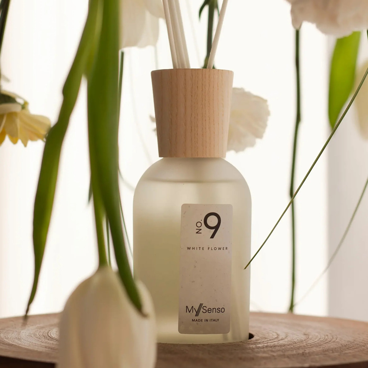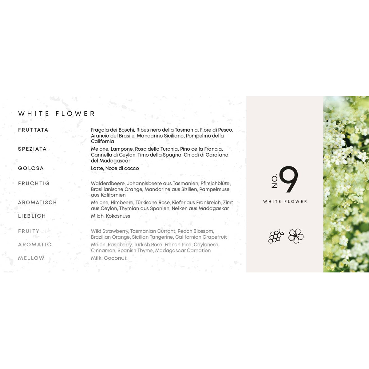 Die luxuriöse Kombination aus fruchtigen Beeren, zarten Blüten und edlen Gewürzen sorgt für innere Ruhe und Balance sowie Qualität und Eleganz aus Italien. Erlebe den N°9 White Flower Premium Diffuser in seiner vollen Pracht mit 240ml feinstem Duftöl. Diese faszinierende Kreation verbindet die belebende Fruchtigkeit von Beeren mit zarten Blütenaromen und einer Nuance edler Gewürze zu einer harmonischen Einheit. Die perfekt kombinierten Inhaltsstoffe garantieren eine langanhaltende Duftkomposition, die deine Sinne verwöhnt und für spürbare innere Ausgeglichenheit sorgt.
