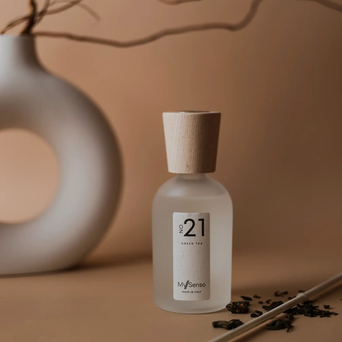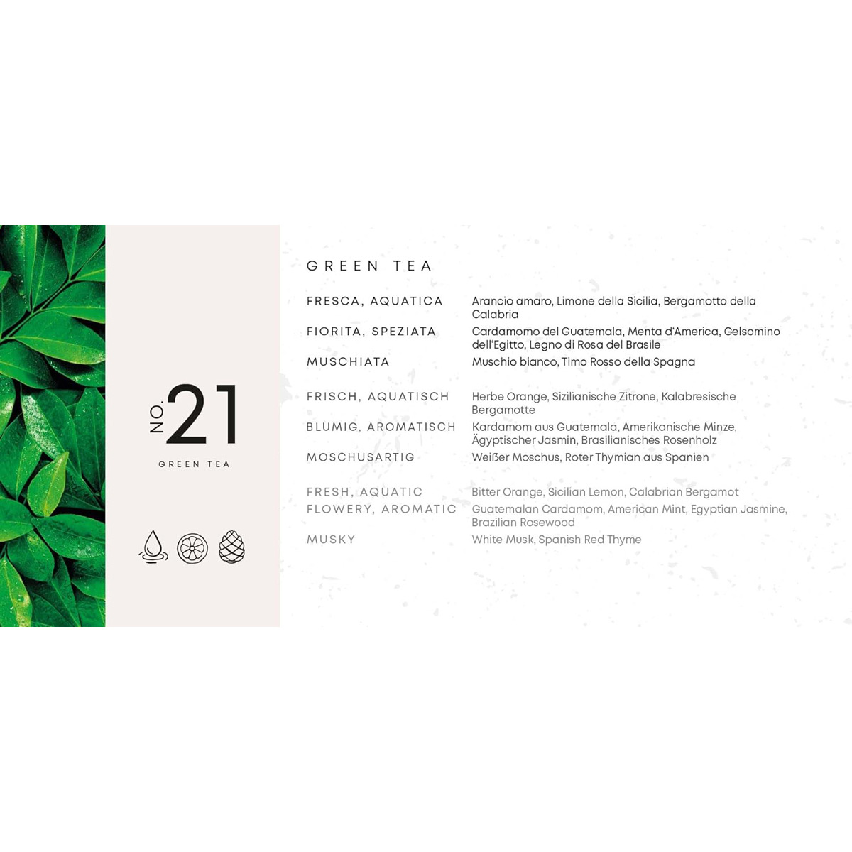 Holen Sie sich mit dem N°21 Green Tea Premium Diffuser in der großzügigen 240ml-Größe die erholsame Atmosphäre asiatischer Wälder direkt in Ihre eigenen vier Wände. Dieser in Italien hergestellte Raumduft vereint höchste handwerkliche Qualität mit einem modernen, nachhaltigen Verpackungskonzept und setzt so stilvolle Akzente in jedem Interieur.