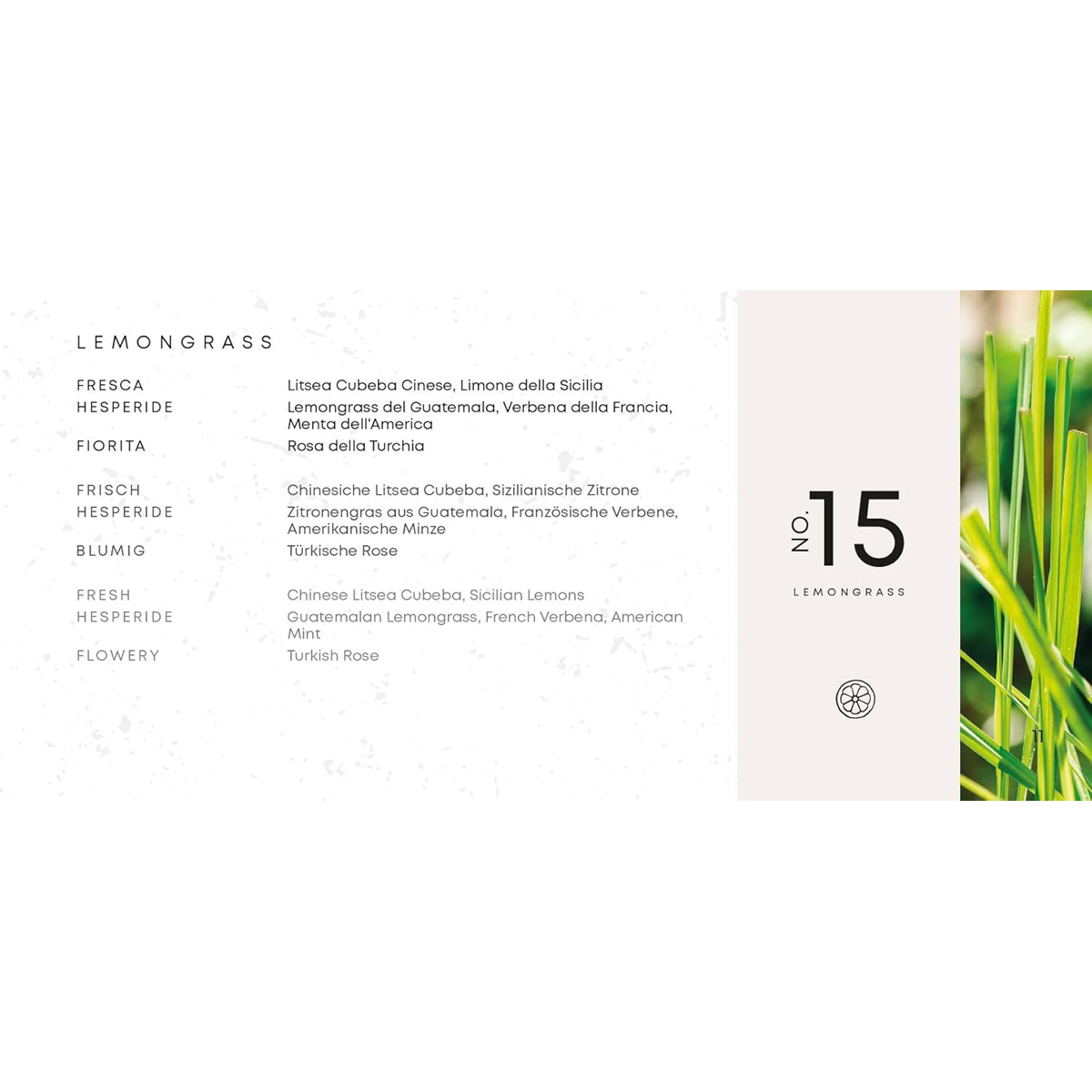 Mit dem N°15 Lemongrass Premium Diffusor holen Sie sich die belebende Frische eines strahlenden Frühlingsmorgens direkt in Ihr Zuhause. Dieser in Italien gefertigte Aroma-Diffusor fängt die Essenz der amalfitanischen Küste ein und verwandelt jedes Zimmer in eine erholsame Oase. Das Geheimnis dieses besonderen Dufterlebnisses liegt in der harmonischen Verbindung von bläulich-grünen Zitronengrasblättern mit der Spritzigkeit sizilianischer Zitronen und der feinen Würze chinesischer Litsea Cubeba.