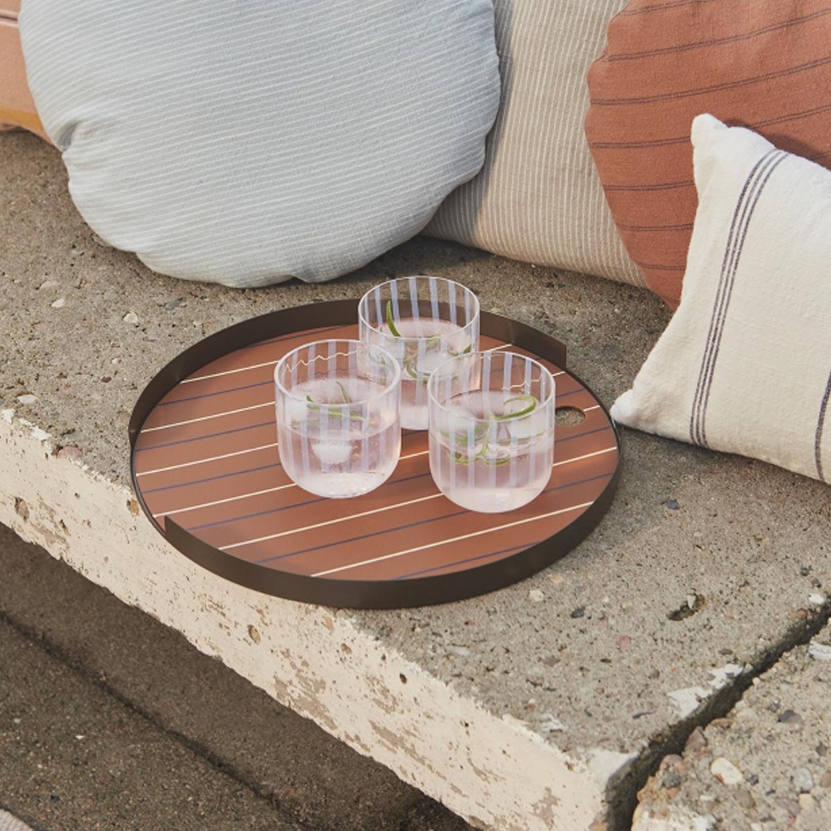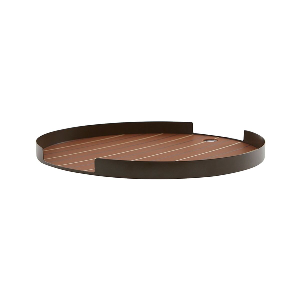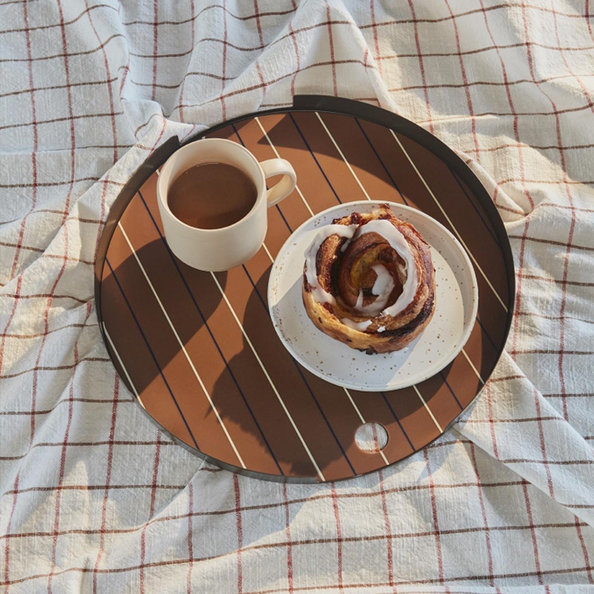 Unser Oka-Tablett ist praktisch und schön zugleich. Das Tablett besteht aus pulverbeschichtetem Metall und wird mit einer haltbaren Silikonmatte geliefert. Wir empfehlen Ihnen, das Tablett mit einem feuchten Tuch zu reinigen.