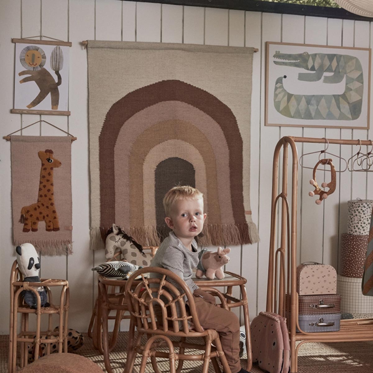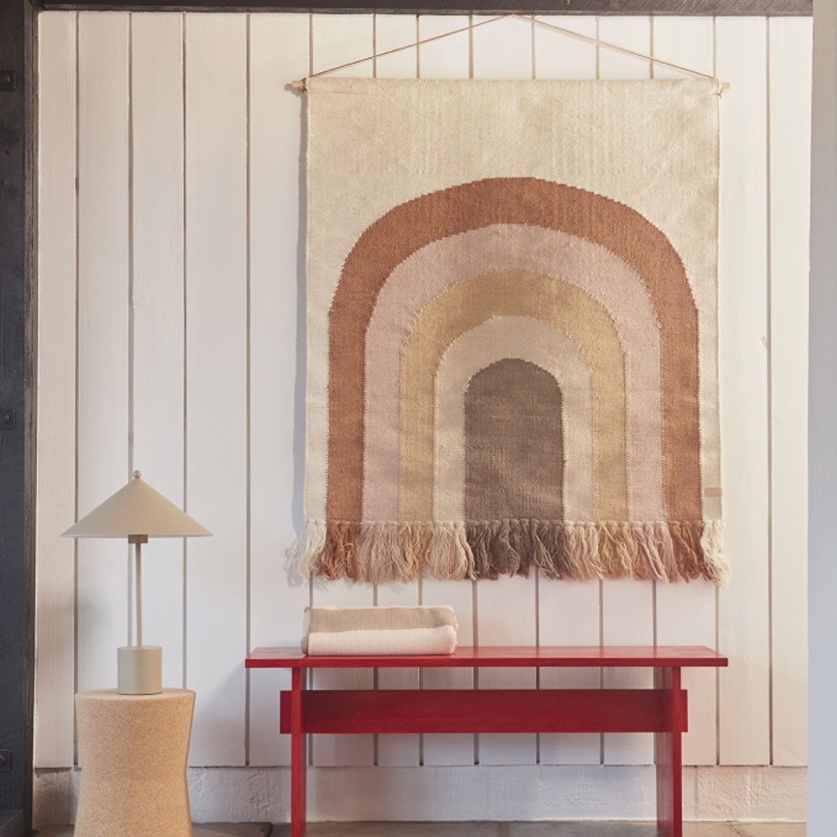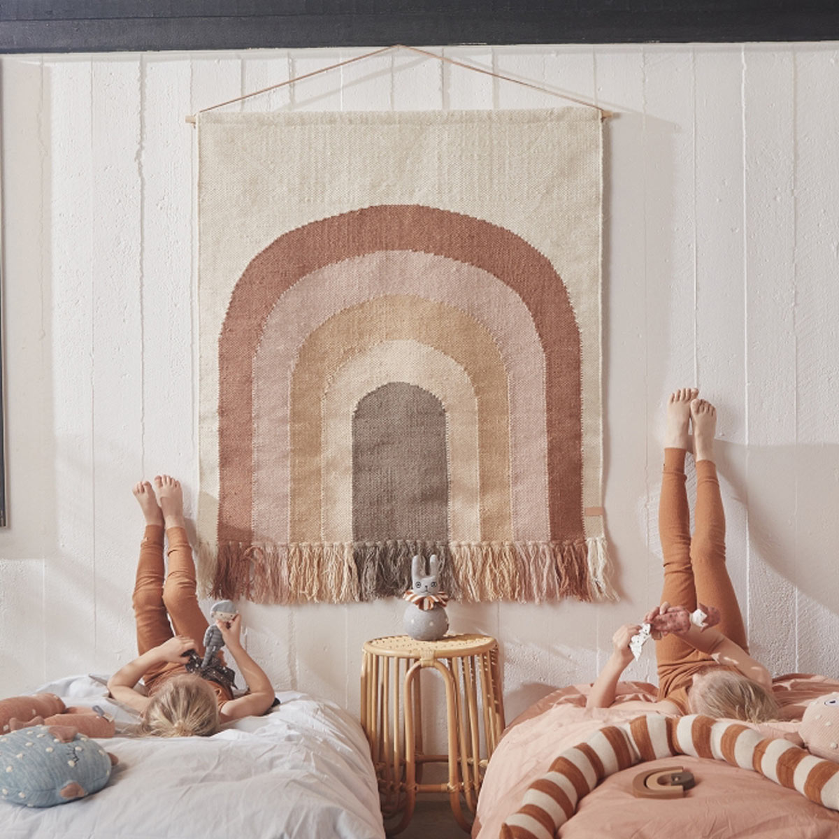 Das markante Regenbogen-Design ist in getönten Farben handgewebt auf dem Wandteppich. Der Wandteppich ist ein feines und dekoratives Element, das Ruhe und Wärme in einem Raum schafft. Im Regenbogen liegt der Schatz – hängen Sie den Regenbogen-Wandteppich im Kinderzimmer oder im Herzen der Familie auf.