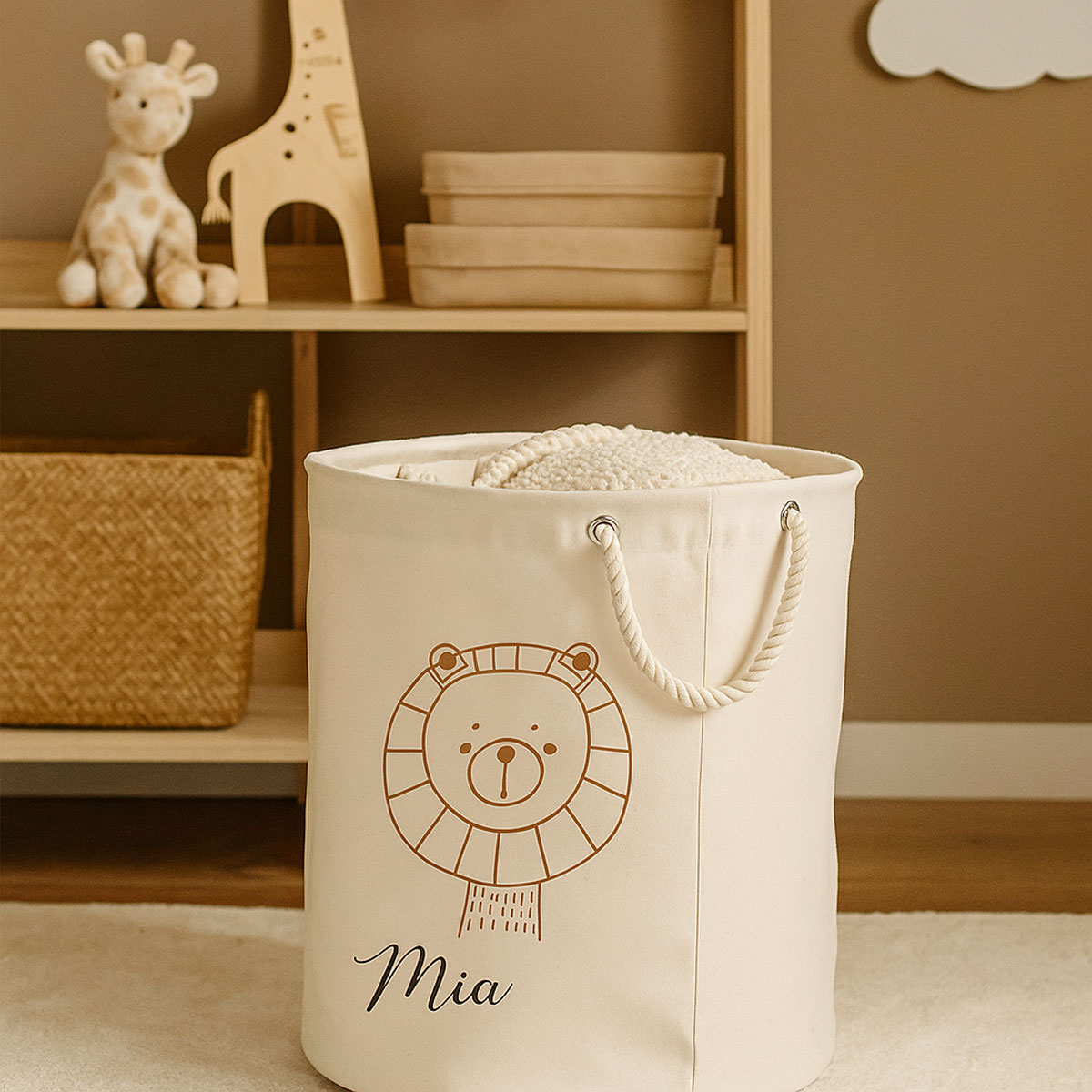 Der Korb ist in drei Größen – S (21 Liter), M (50 Liter) & L (75 Liter) – erhältlich und wird mit dem Namen des Kindes sowie einem süßen Tiermotiv nach Wahl – Löwe, Fuchs oder Giraffe – personalisiert. So entsteht ein individuelles Unikat, das sowohl praktisch als auch ein echter Hingucker ist.