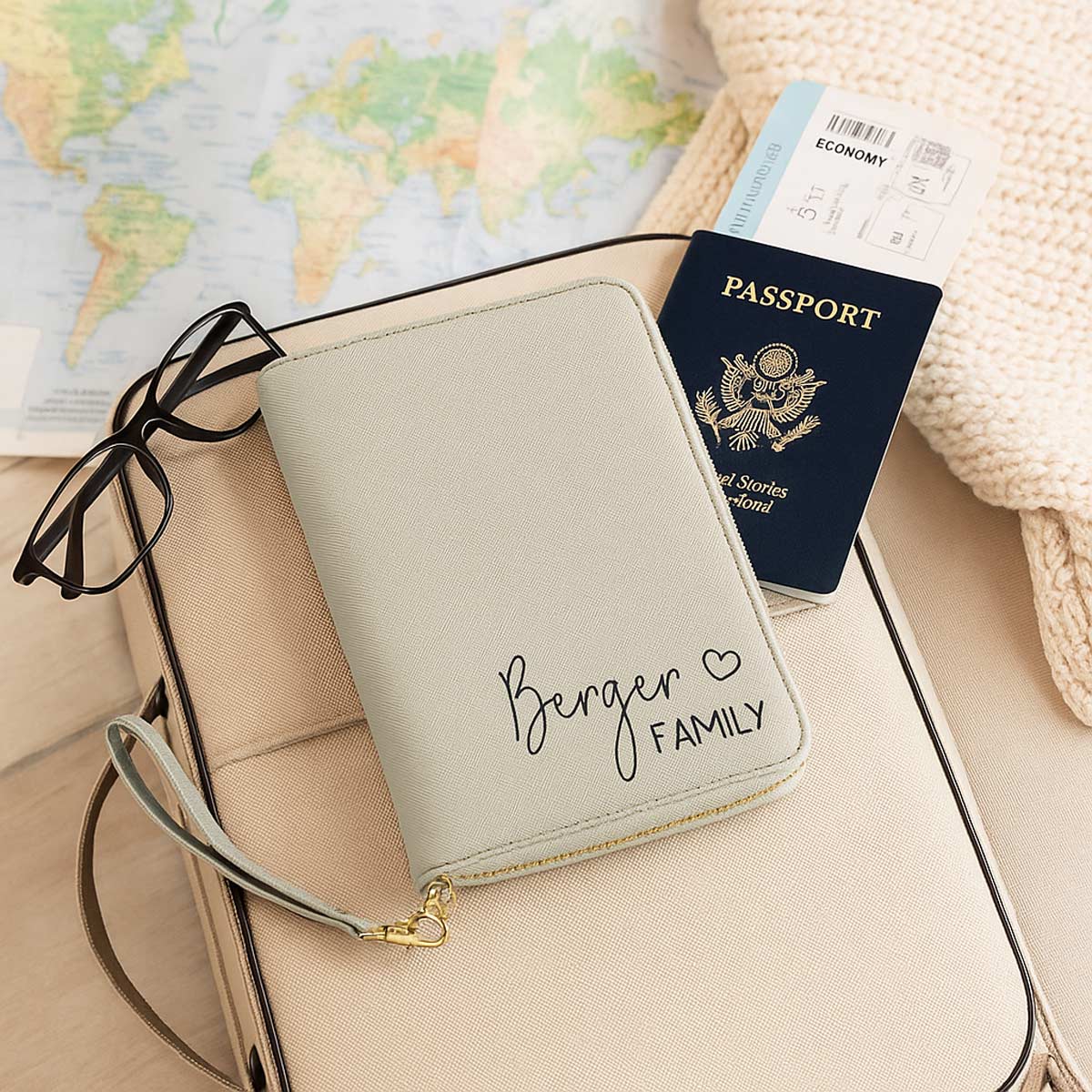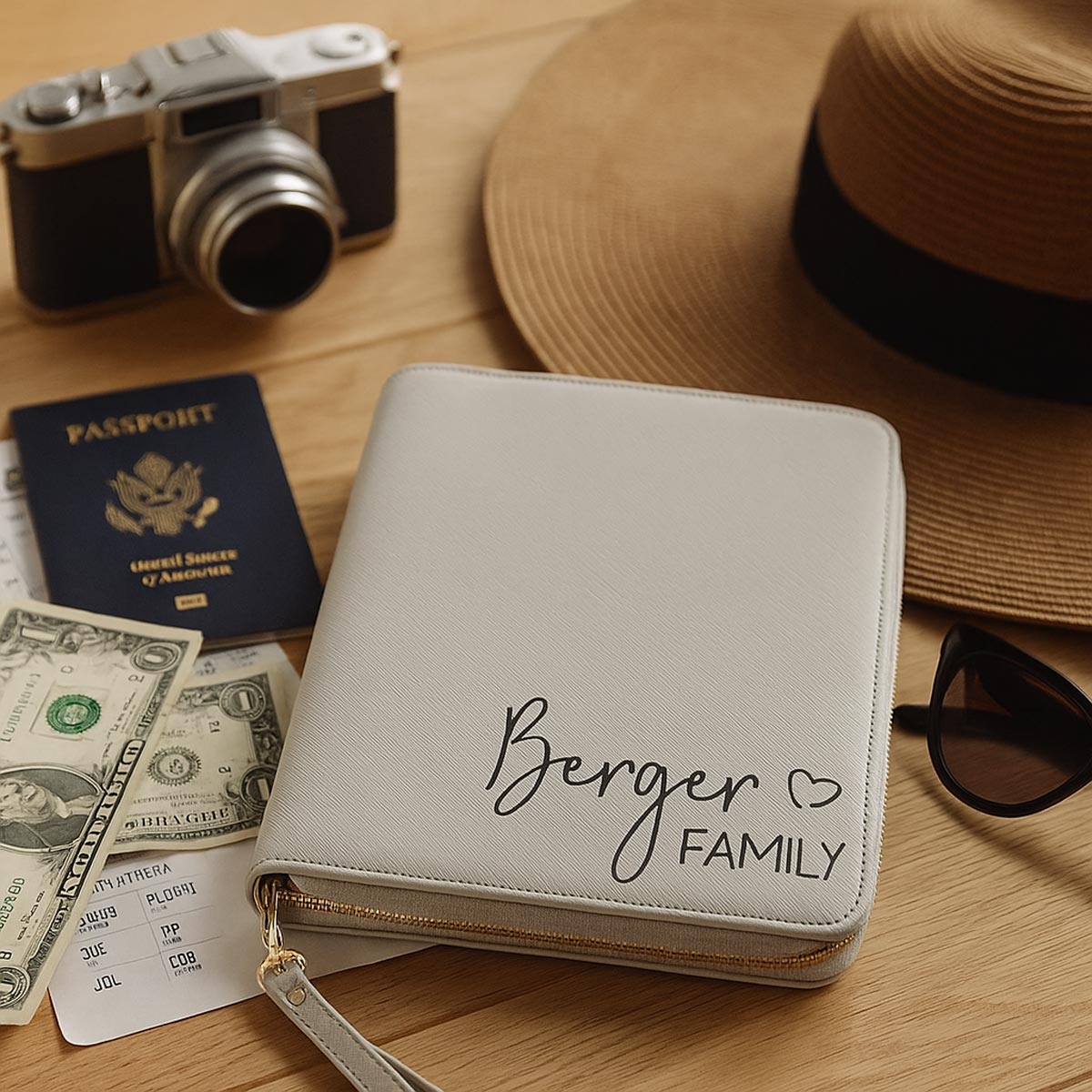 Dieser personalisierte Travel-Organizer ist der perfekte Begleiter für Familien auf Reisen – ob für den großen Sommerurlaub, den Wochenendtrip, eine Städtereise oder die Flitterwochen. Alle wichtigen Dokumente sind sicher, ordentlich und jederzeit griffbereit aufbewahrt.