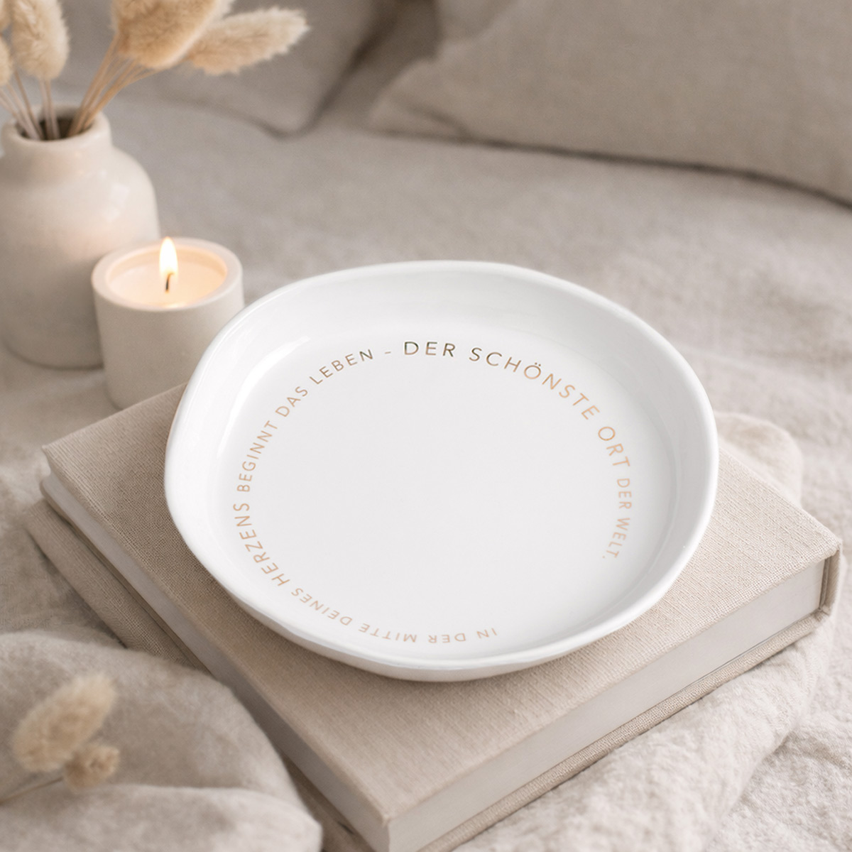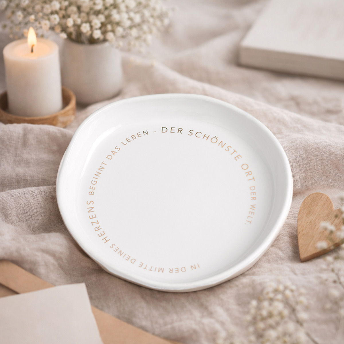 Die elegante Dekoschale von Räder überzeugt durch seine schlichte Form und besondere Botschaft. Gefertigt aus hochwertigem weißen Porzellan und verziert mit einem umlaufenden Schriftzug in feinem Gold, bringt es Stil und Bedeutung in dein Zuhause. Die Aufschrift "In der Mitte deines Herzens beginnt das Leben – der schönste Ort der Welt" macht diese Schale zu einem liebevollen Wohnaccessoire mit emotionalem Charakter.