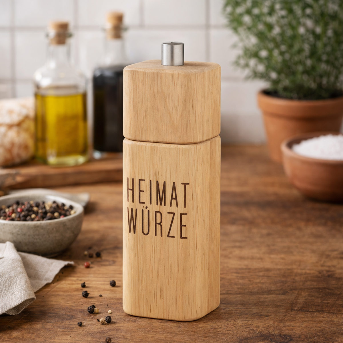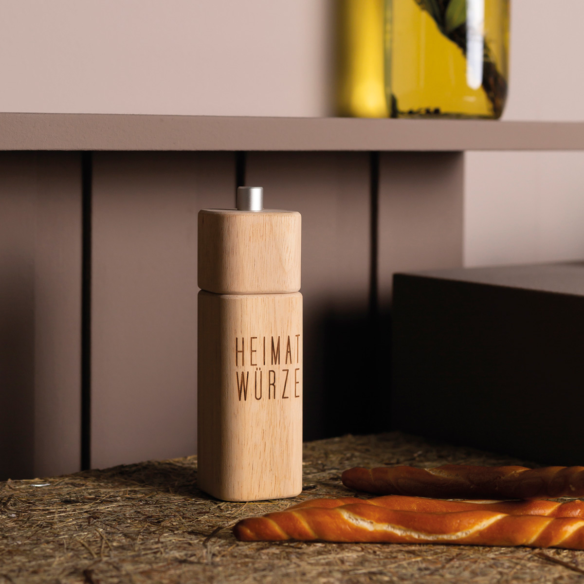 Diese Gewürzmühle von Räder verbindet funktionales Küchenzubehör mit dem unverwechselbaren Design des Herstellers. Gefertigt in natürlicher Holzoptik und mit eingraviertem Schriftzug 'Heimatwürze', wird die Mühle zu einem dekorativen Blickfang in jeder Küche. Ob auf dem Esstisch, in der Küche oder als Geschenkidee für Kochliebhaber – die Gewürzmühle aus Holz passt perfekt zu einem modernen, natürlichen und wohnlichen Einrichtungsstil.