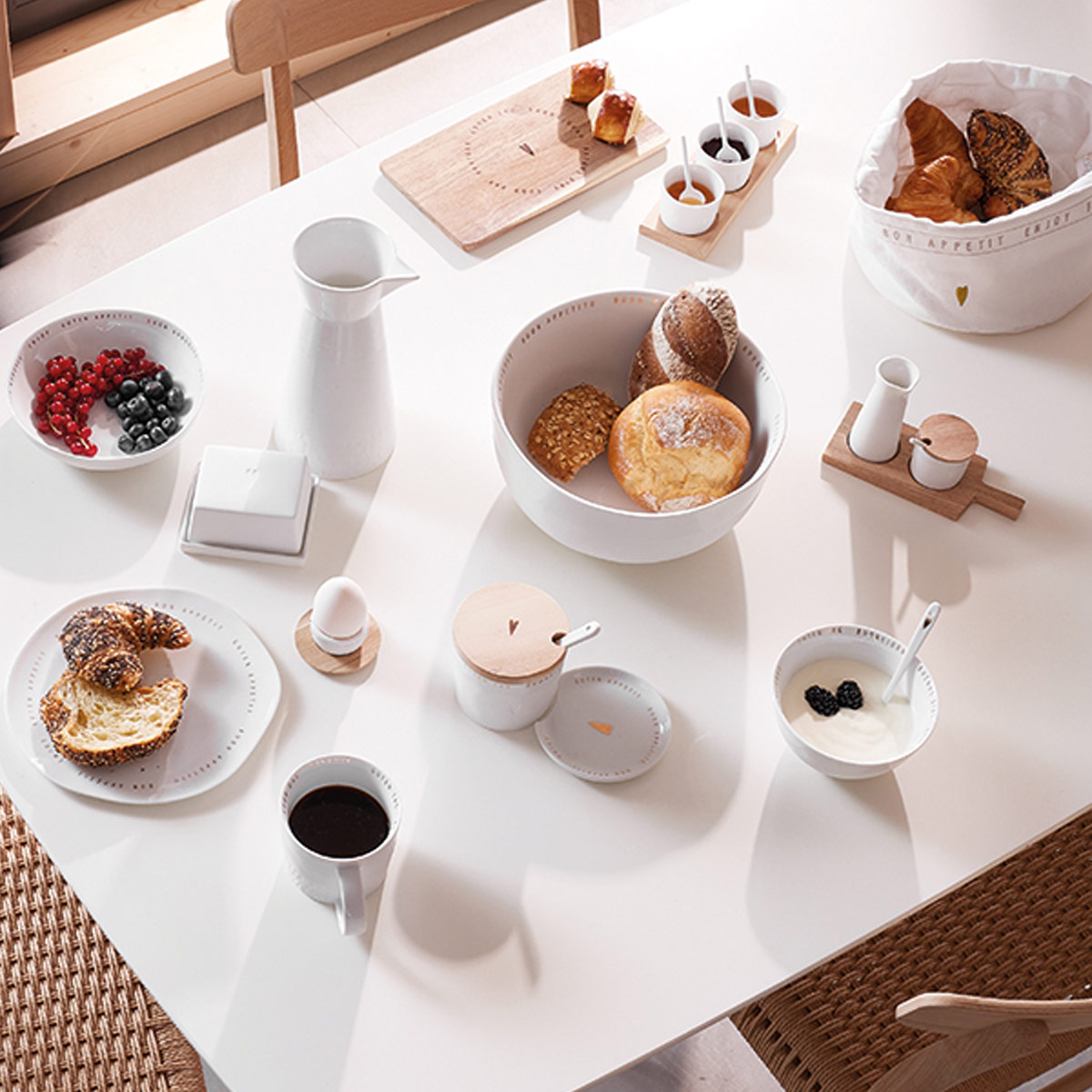 Die harmonische Kombination aus Weiß und warmem Holz passt perfekt zu modernen und klassischen Wohnstilen. Ob für das tägliche Frühstück, den Sonntagsbrunch oder als stilvolle Geschenkidee – dieses Set verbindet Design und Alltagstauglichkeit.