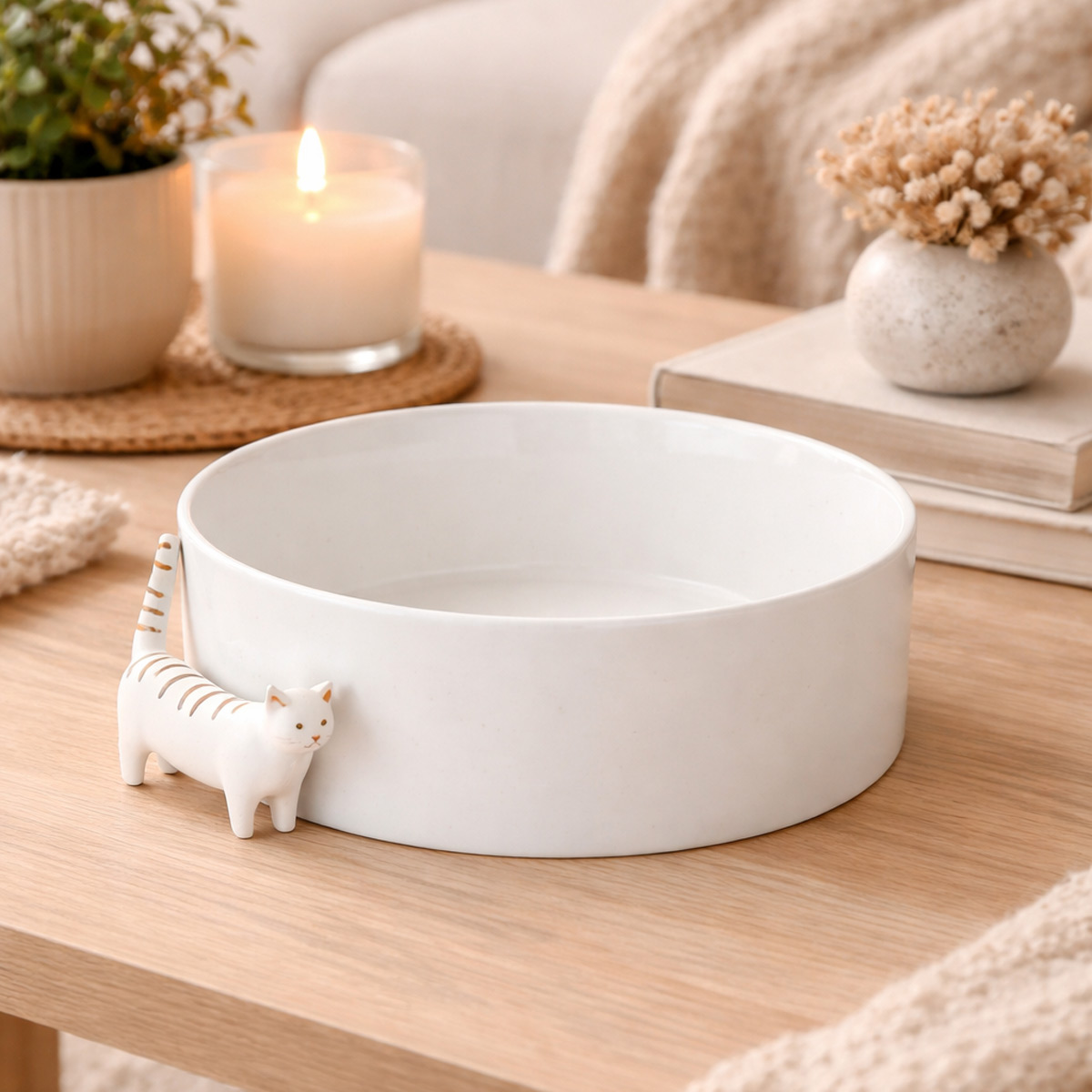 Die feine Schale aus Porzellan verbindet die für räder typische klare Formensprache mit einem charmanten Katzen-Detail und goldfarbenen Akzenten. So entsteht ein besonderes Lieblingsstück für alle, die Katzen, Porzellan und stilvolle Dekoration lieben. Die Schale ist innen glasiert und eignet sich wunderbar zum Servieren kleiner Köstlichkeiten oder als dekorative Ablage für Schmuck, Schlüssel und kleine Alltagsgegenstände.