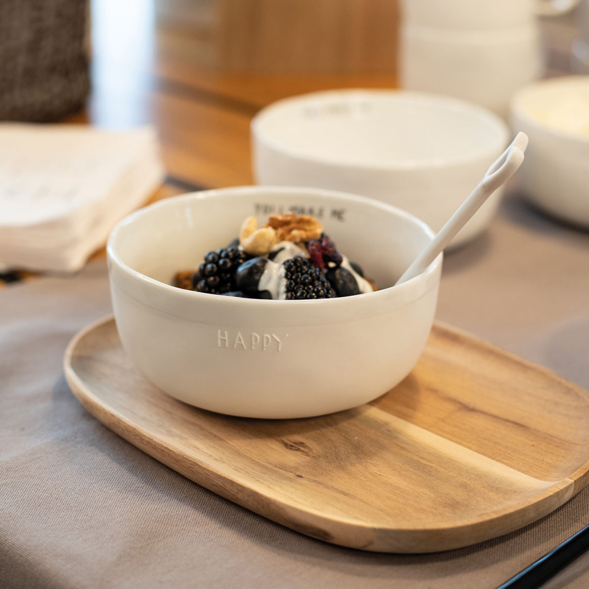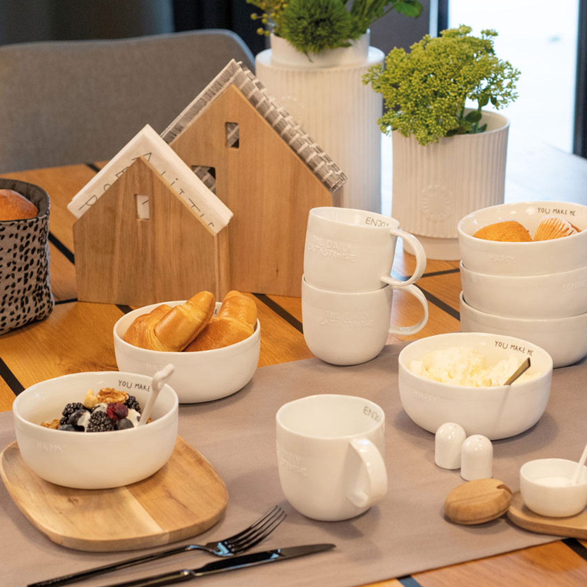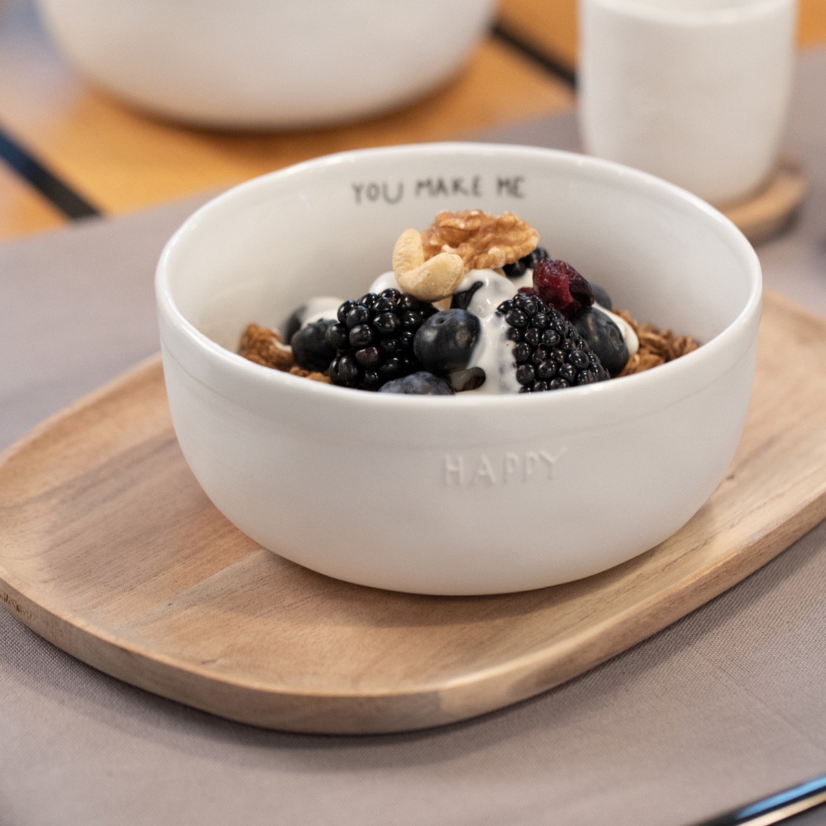 Mit der Porzellanschale 'You make me happy' startest du jeden Tag mit einem Lächeln. Die stilvolle Schale überzeugt durch ihr modernes Design und die liebevolle Botschaft, die sie zu einem echten Hingucker auf dem Tisch macht. Ob für Müsli am Morgen, Snacks zwischendurch oder kleine Leckereien – die Schale ist vielseitig einsetzbar und bringt gleichzeitig eine positive Stimmung in deinen Alltag.