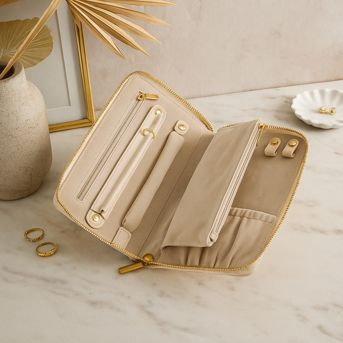Gefertigt aus hochwertigem Kunstleder in Saffiano-Optik, mit weichem Samtfutter und einem dekorativen goldfarbenen Zipper, vereint dieses Schmucketui Eleganz mit Funktionalität.
