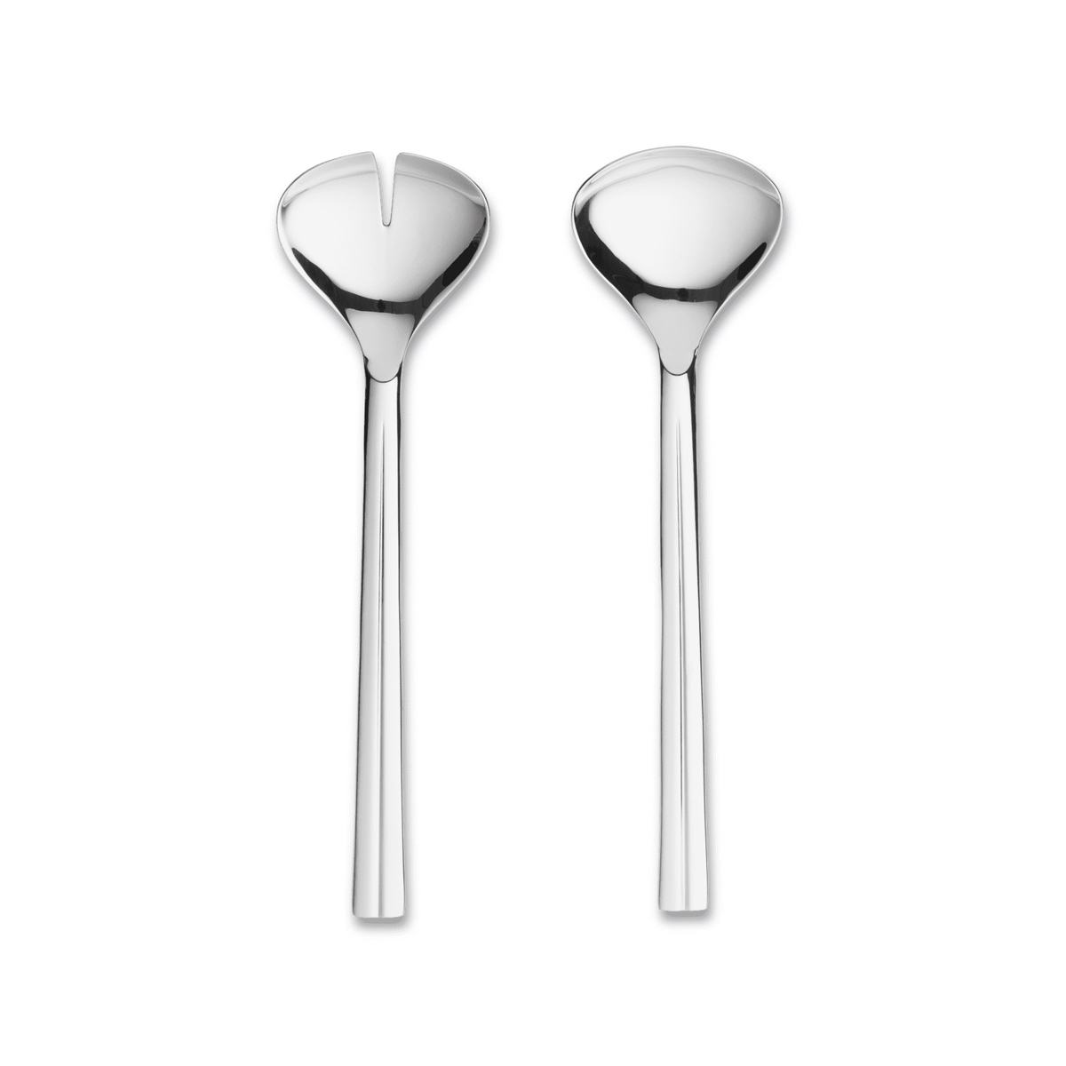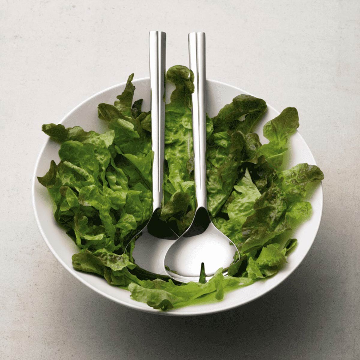 Das Salatset kombiniert die Freude, etwas zu servieren mit der Zufriedenheit, mit guten Küchengeräten zu arbeiten. Das Messer hat einen hervorragenden Halt und eine gute Gewichtsverteilung. Das Set besteht aus rostfreiem Stahl und sowohl das Salatset als auch der Rest der Serie kann durch die geraden Linien leicht mit verschiedenem Geschirr gemixt werden.