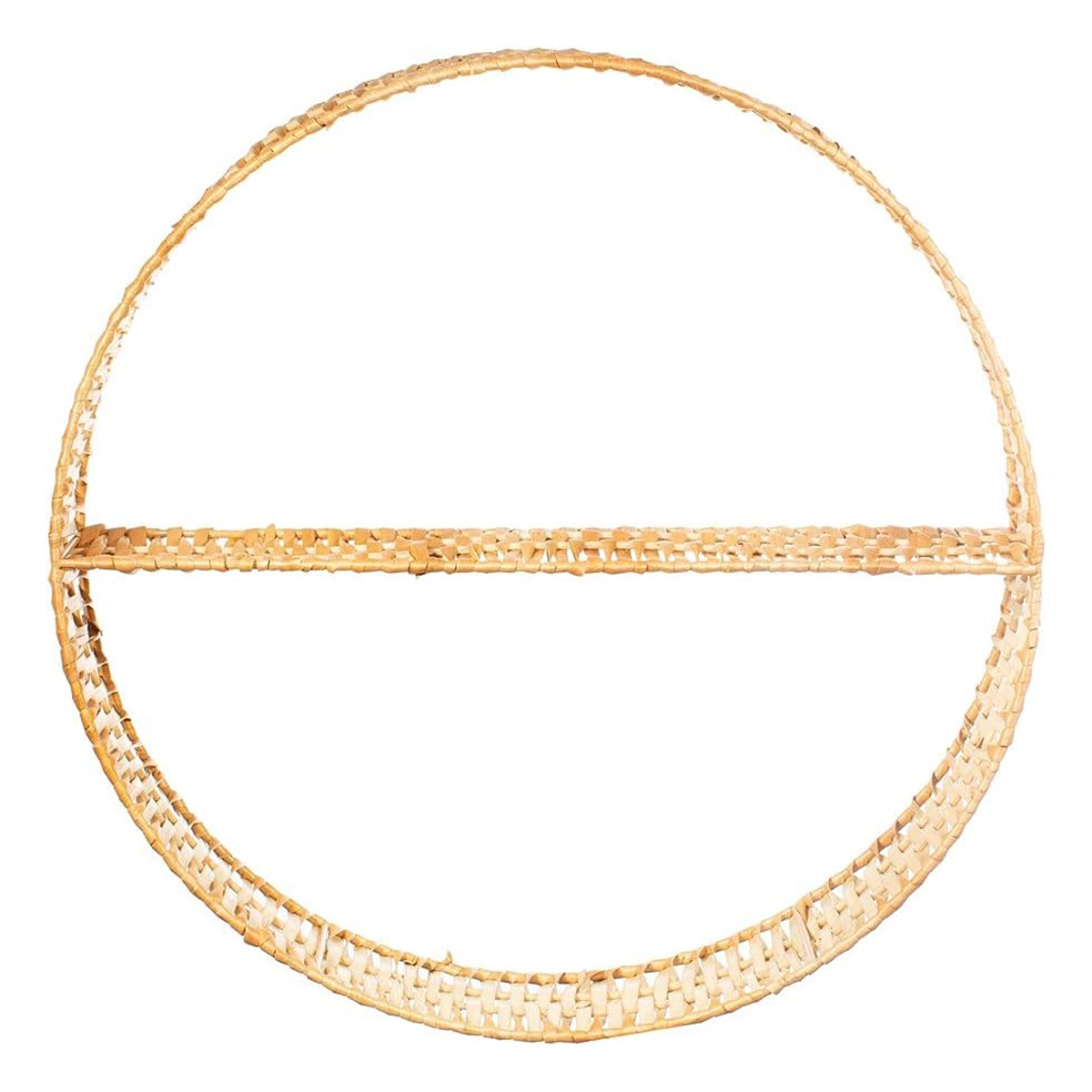 Dekorieren Sie Ihr Zuhause mit einem Hauch von natürlicher Ästhetik. Dieses Boho-inspirierte Regal ist aus Weide, rund in Form und verfügt über eine Plattform, die durch die Mitte geteilt ist. Perfekt für die Präsentation Ihrer Lieblingspflanzen, Fotos oder anderer hübscher Schmuckstücke.