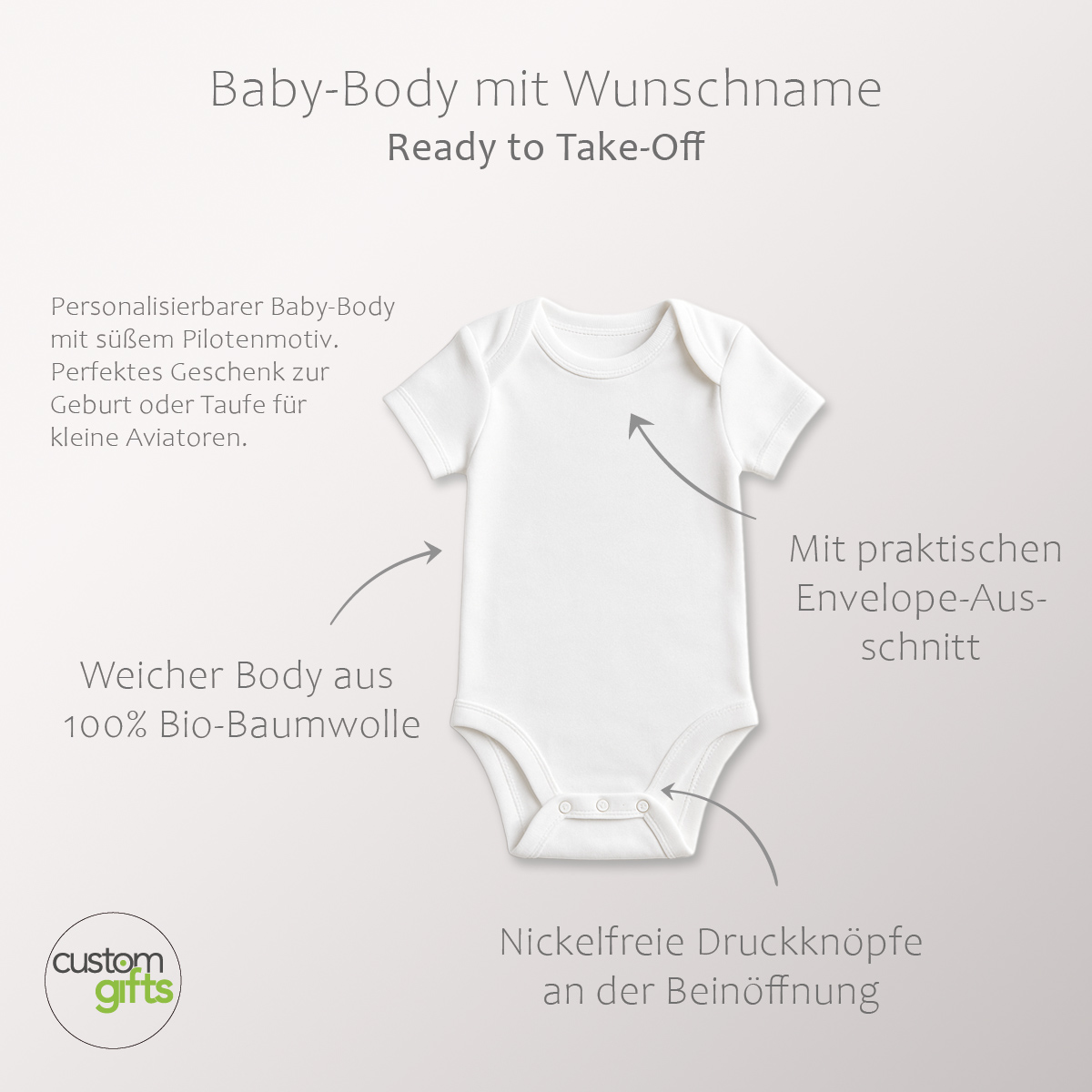 Dieser liebevoll gestaltete Baby-Body ist das ideale Geschenk zur Geburt oder Taufe – besonders für Pilot:innen, Flugkapitäne und alle, die die Faszination fürs Fliegen teilen. Der witzige Piloten-Aufdruck "Ready to Take-Off" sorgt sofort für Begeisterung und wird durch eine individuelle Personalisierung mit dem (Familien-)Namen des Babys zu einem echten Unikat.