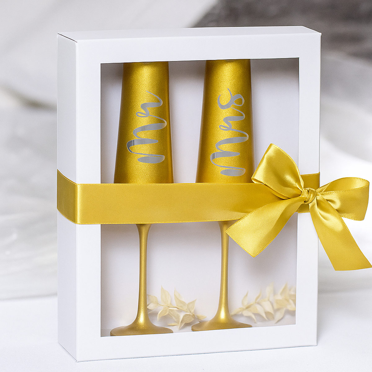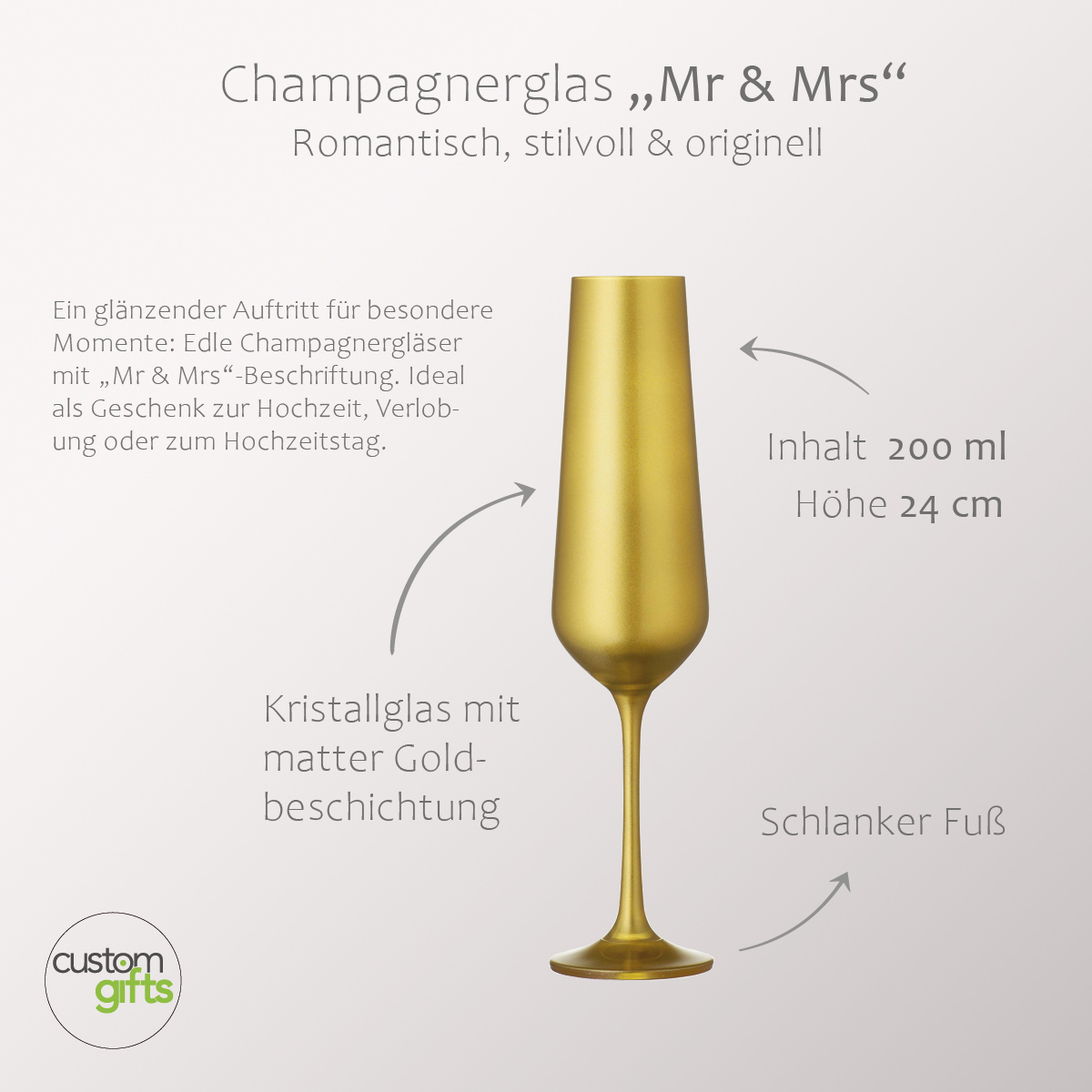 Diese eleganten Champagnergläser Mr & Mrs aus hochwertigem Kristallglas setzen stilvolle Akzente und sorgen für das gewisse Etwas. Mit ihrer schlanken Form und der edlen Goldoptik sind sie ein Blickfang auf jeder Feier.