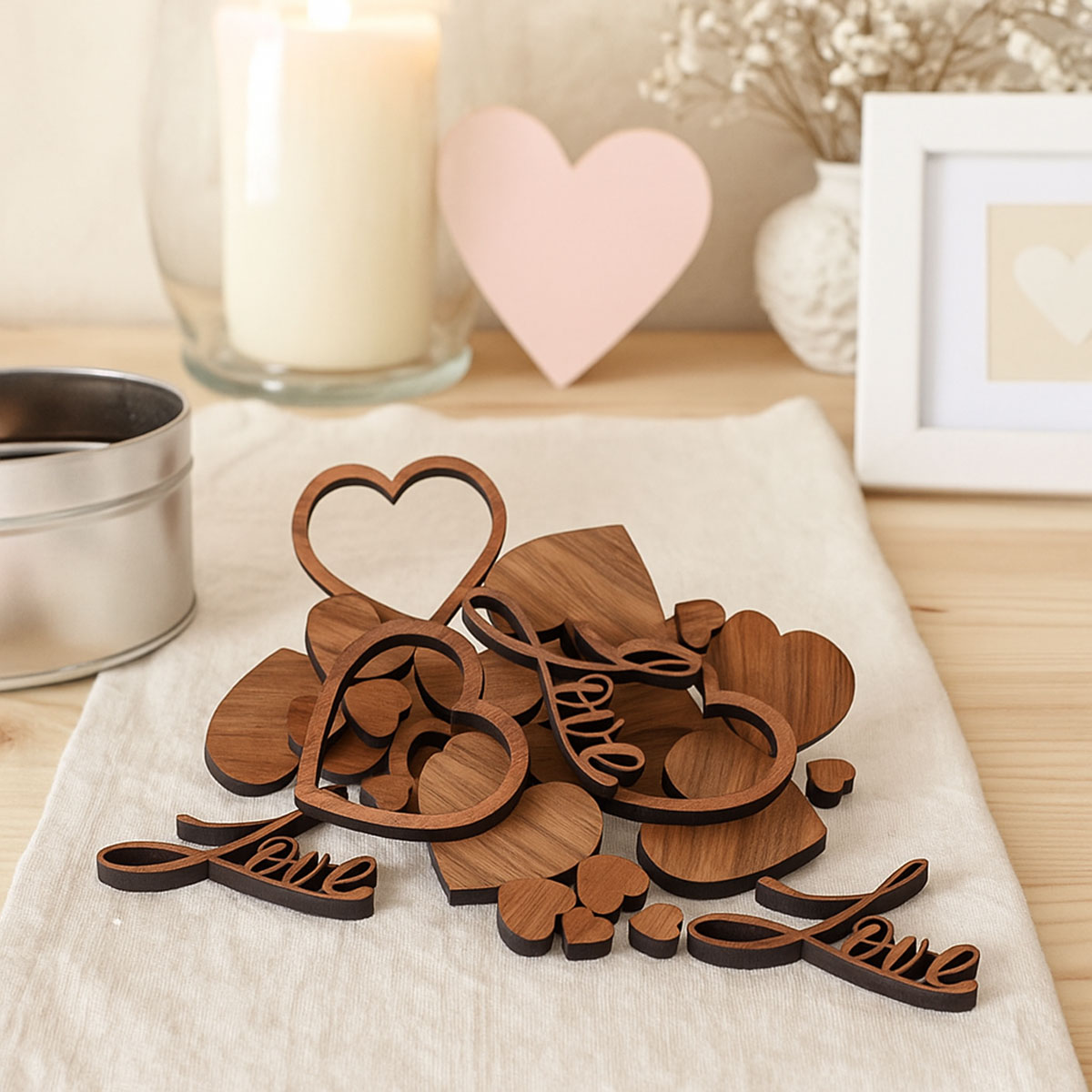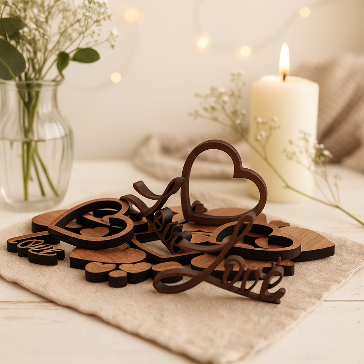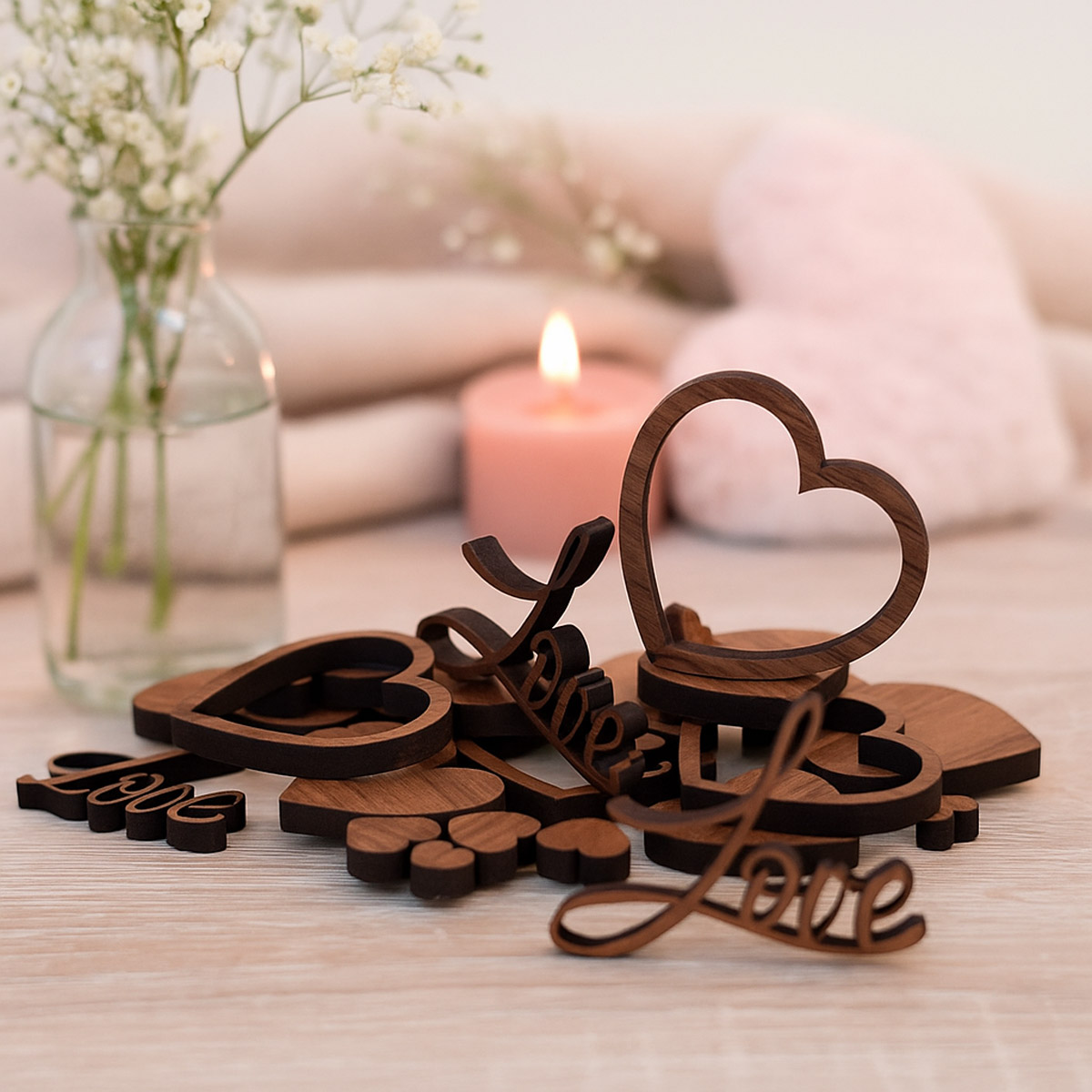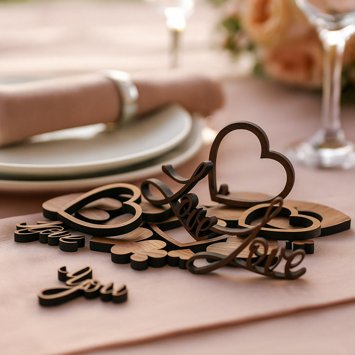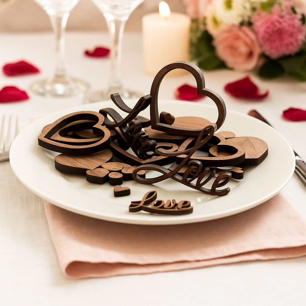 Diese filigrane Streudeko aus hochwertigem Walnuss-Vollholz bringt Natürlichkeit und Liebe auf jeden Tisch. Der elegante "LOVE"-Schriftzug mit zarten Herzmotiven eignet sich ideal für Hochzeiten, Candle Light Dinner, Valentinstage, Taufen oder Jubiläen.