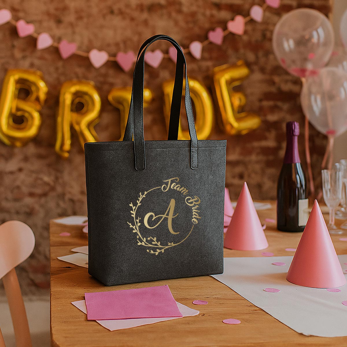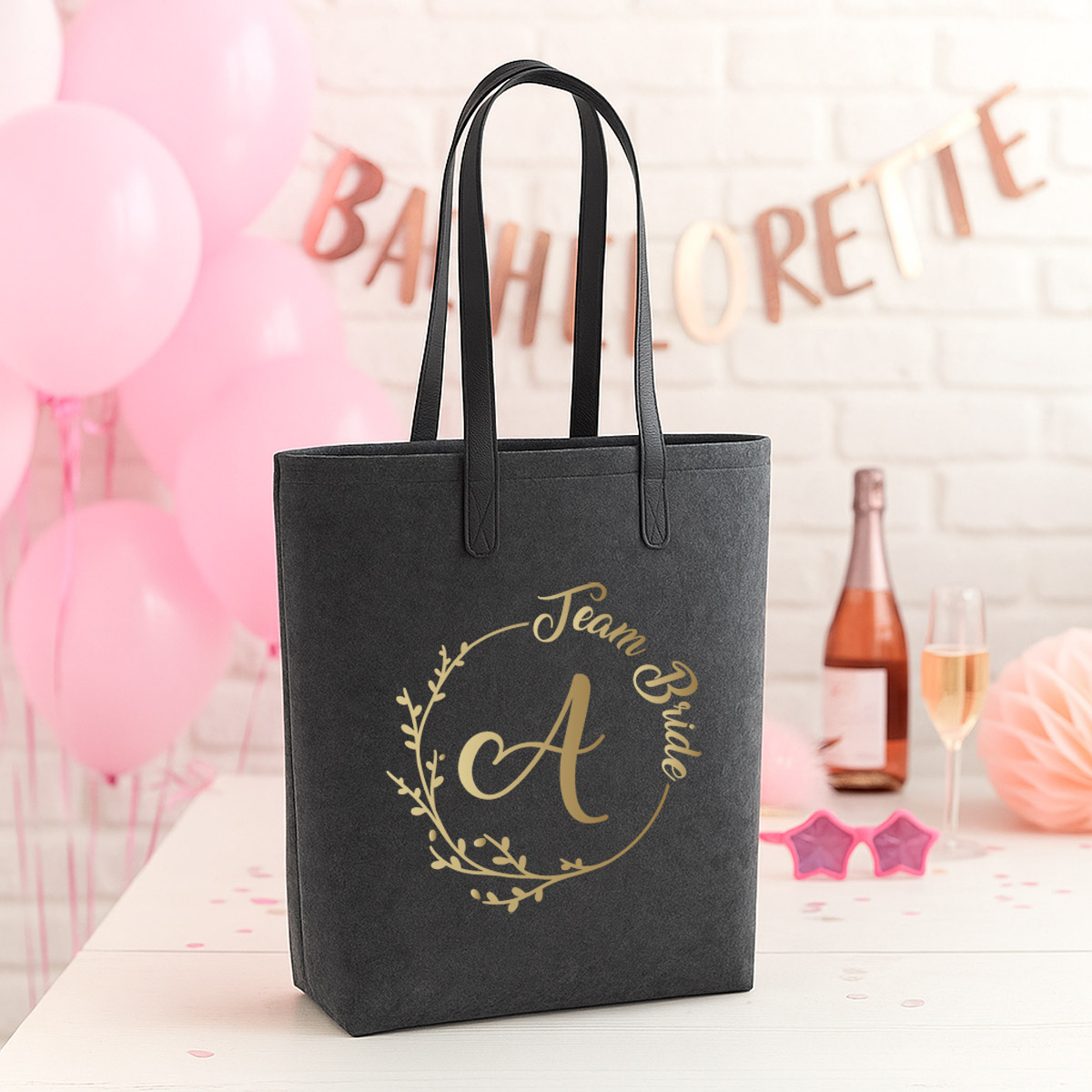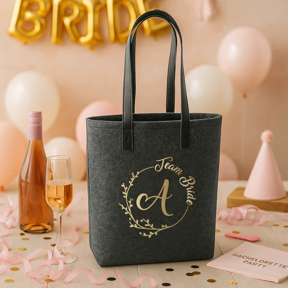 Unsere Filztasche "Team Bride" ist das perfekte Accessoire für einen unvergesslichen Junggesellinnenabschied. Das elegante Anthrazit Melange, der goldene oder weiße "Team Bride"-Schriftzug und die personalisierte Initiale der Braut machen jede Tasche einzigartig und besonders stilvoll.