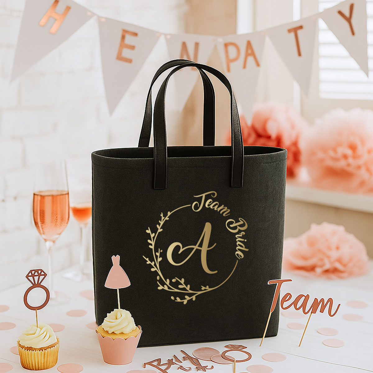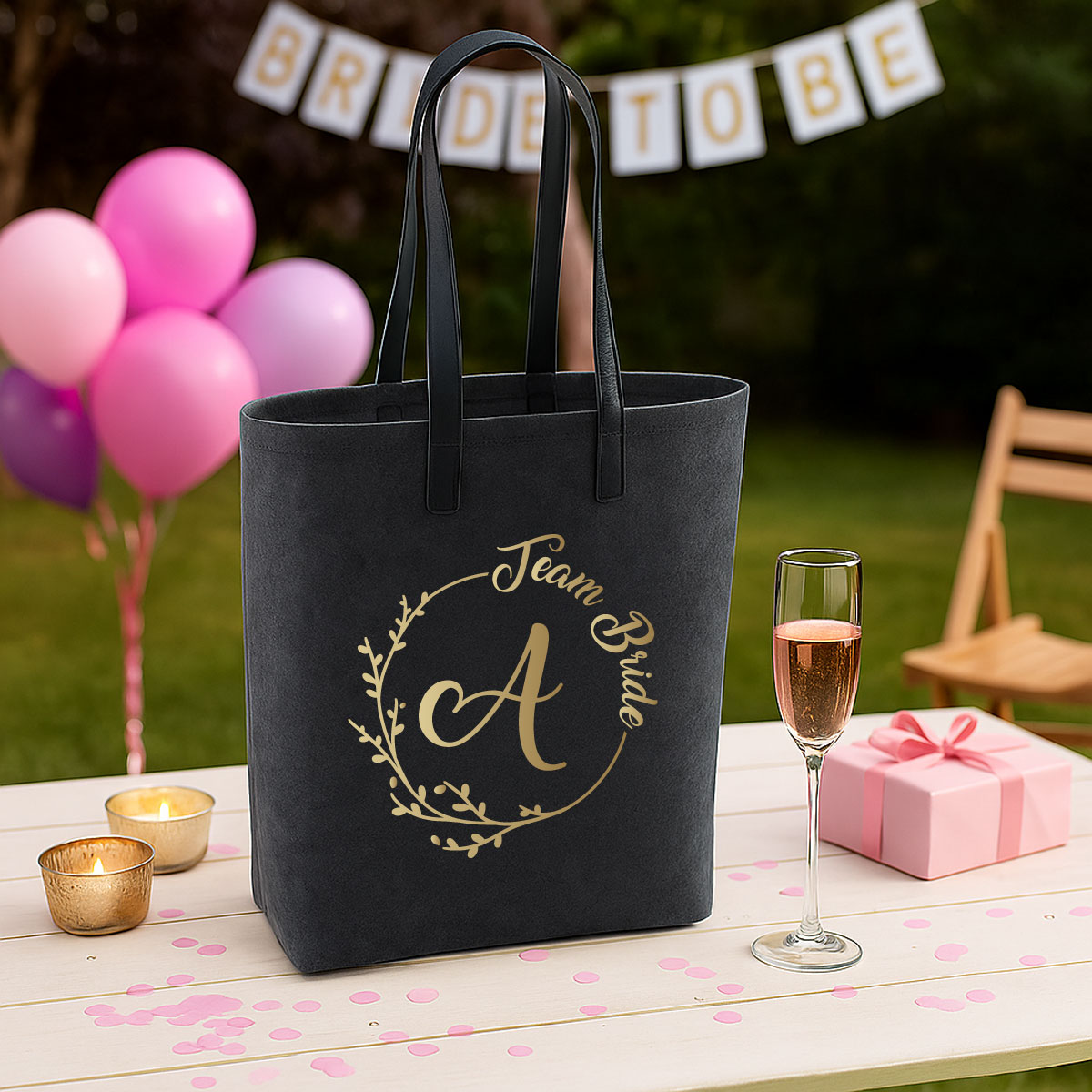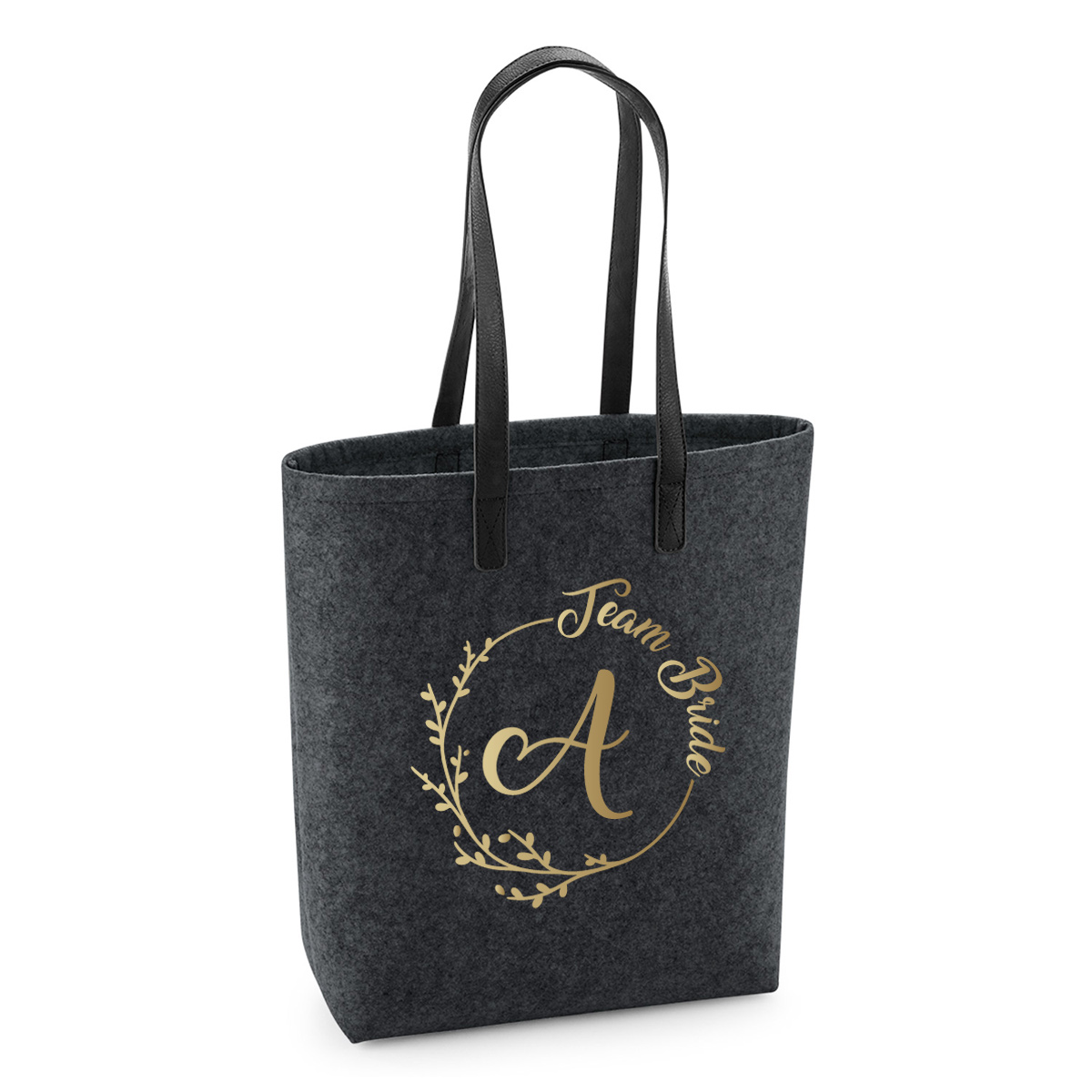 Unsere Filztasche "Team Bride" ist das perfekte Accessoire für einen unvergesslichen Junggesellinnenabschied. Das elegante Anthrazit Melange, der goldene oder weiße "Team Bride"-Schriftzug und die personalisierte Initiale der Braut machen jede Tasche einzigartig und besonders stilvoll.